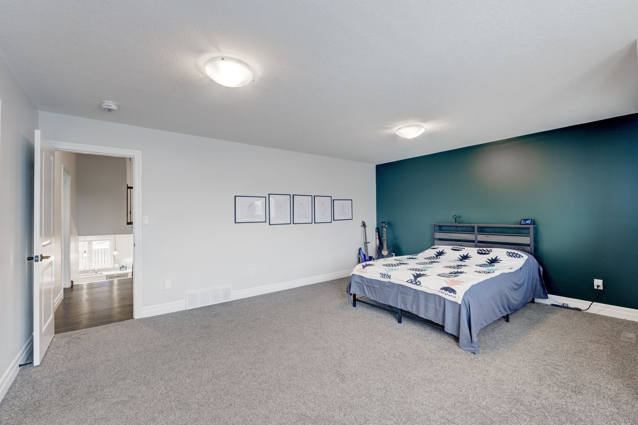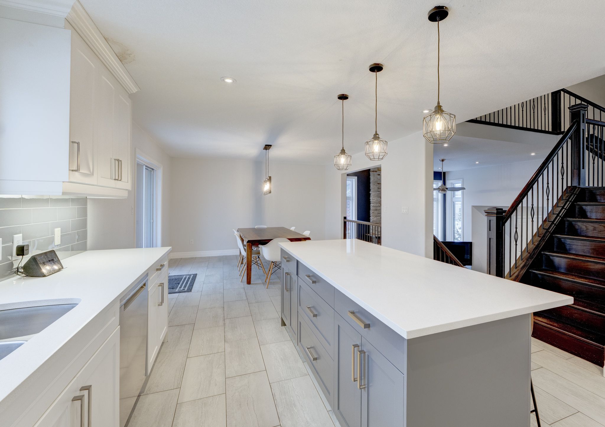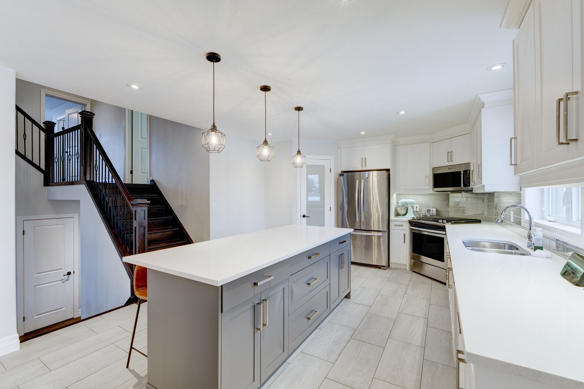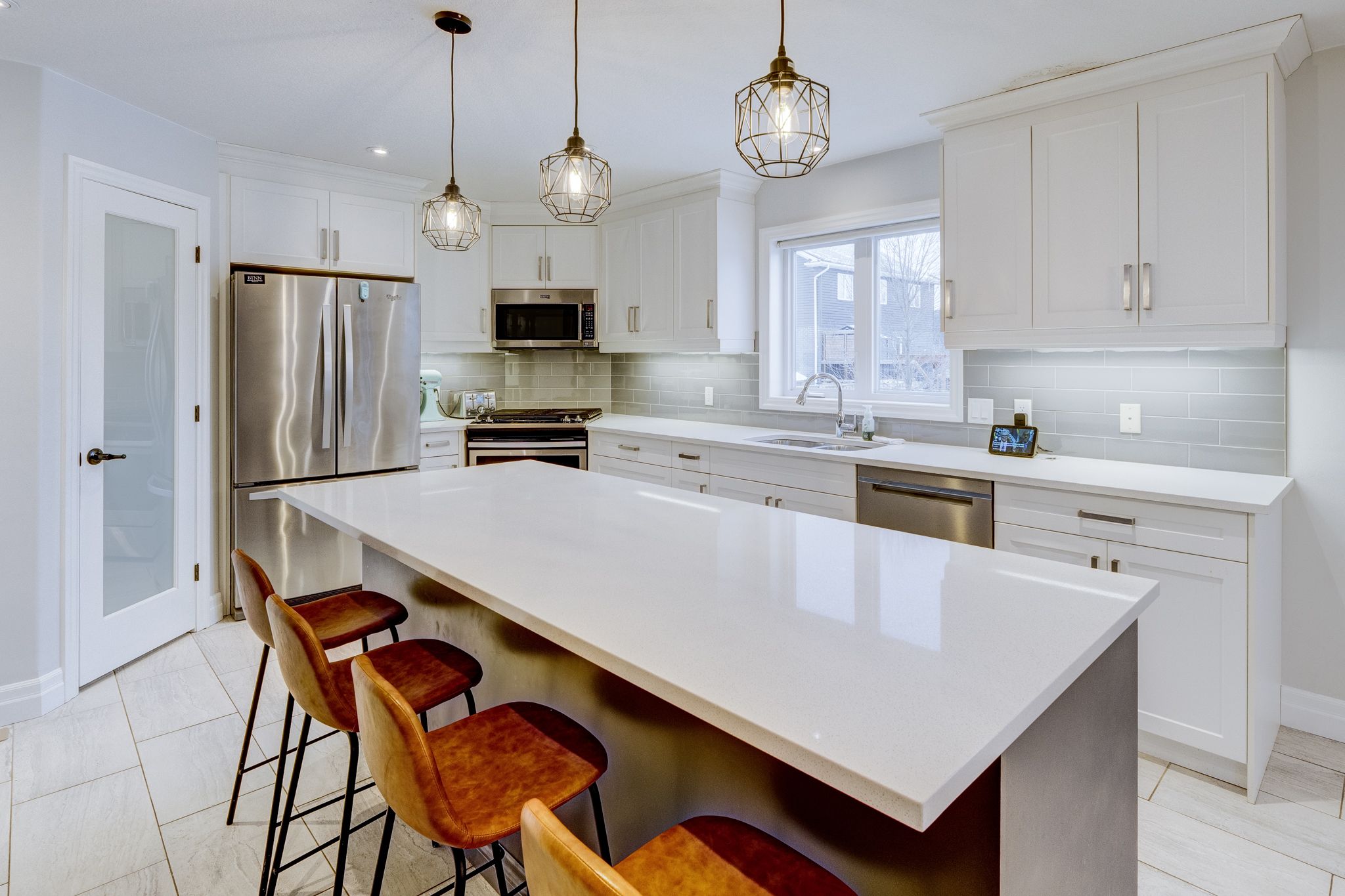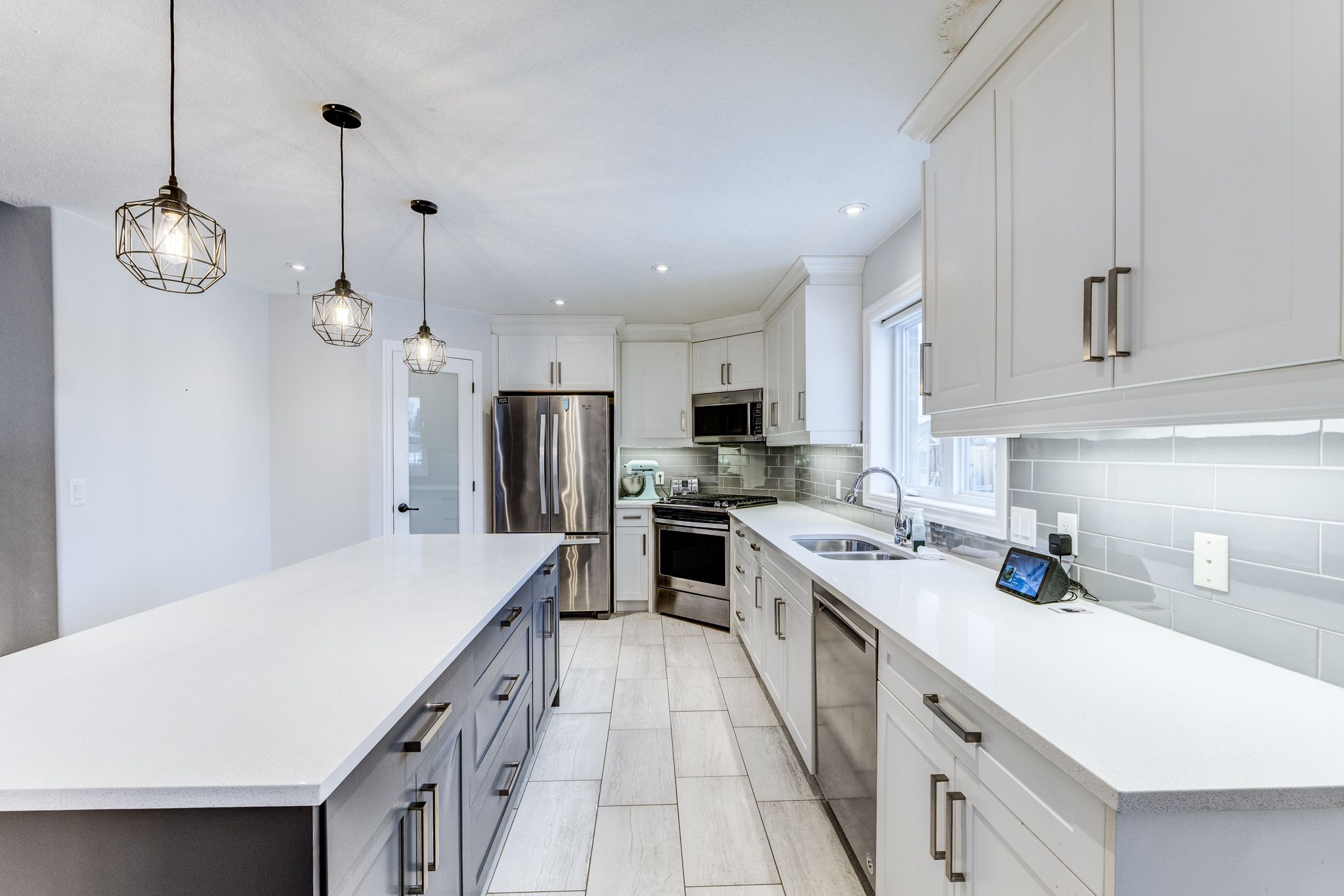 • Oversized kitchen with quartz countertops for family gatherings.