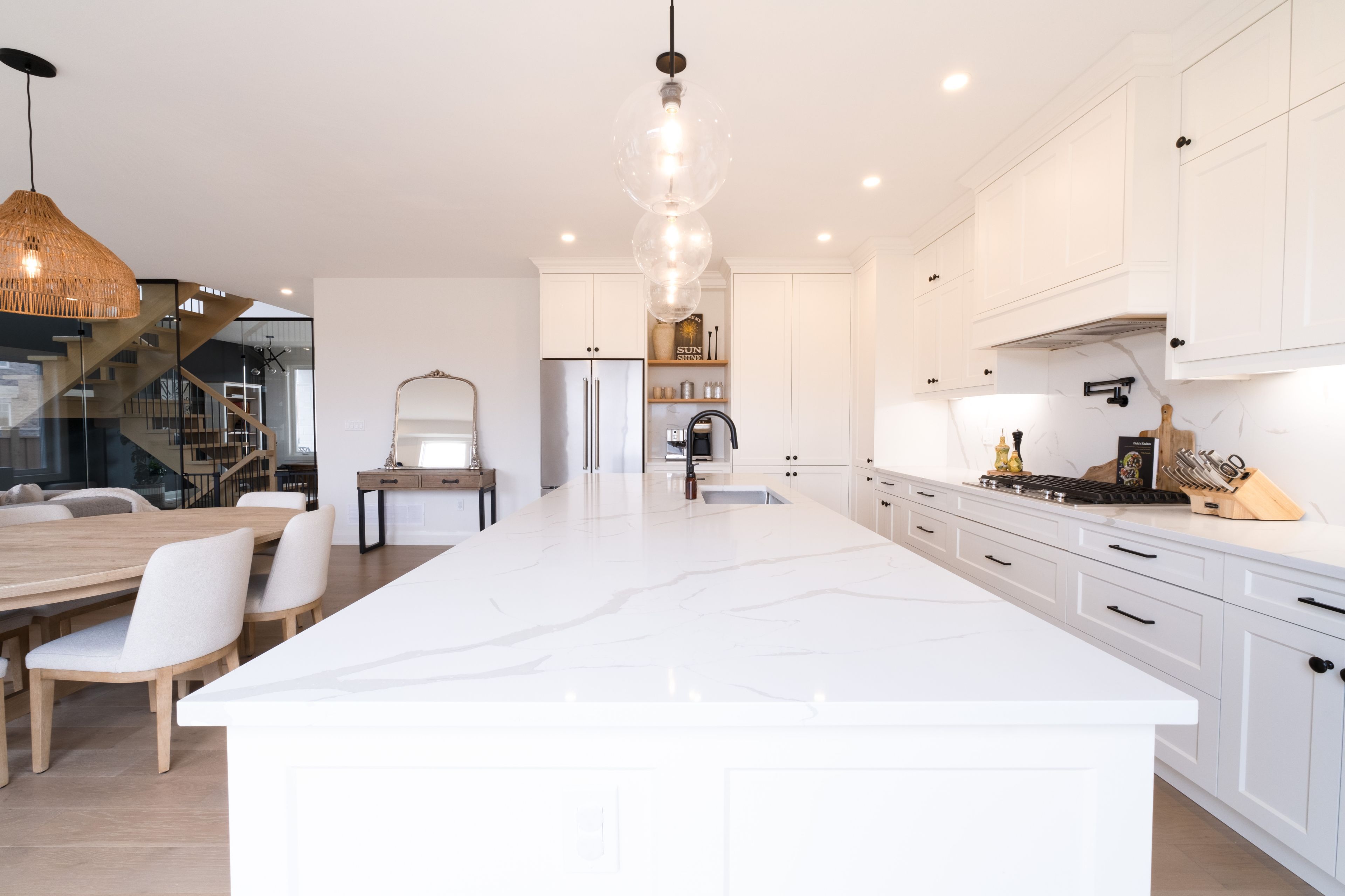• Open-concept main level with gourmet kitchen and large island for cooking.