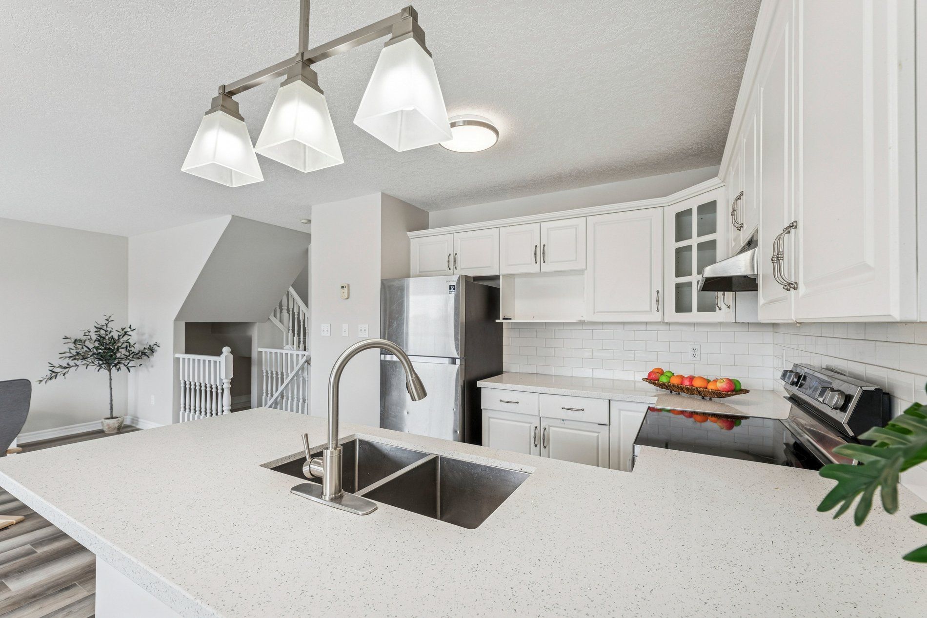 • Bright modern kitchen with quartz countertops and stainless-steel appliances.