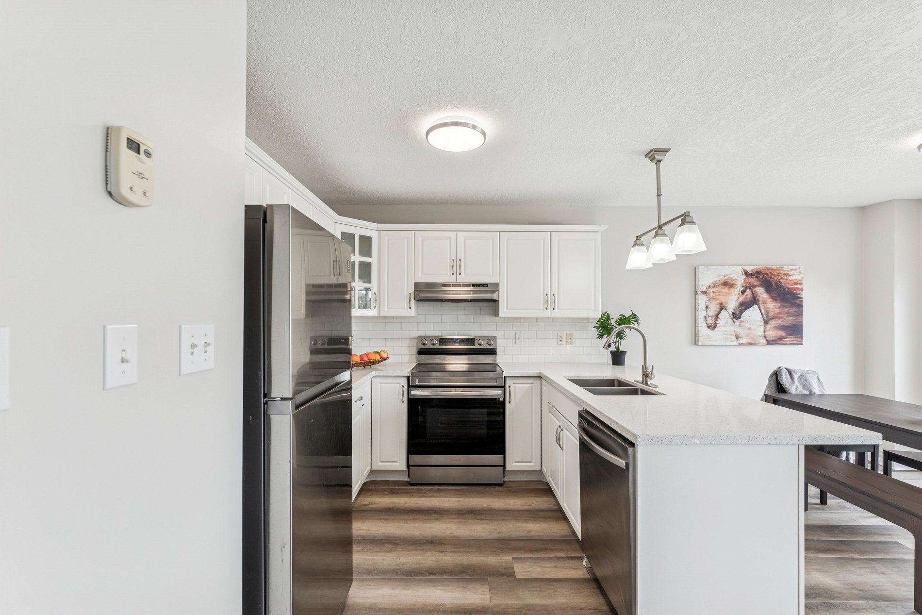 • Bright modern kitchen with quartz countertops and stainless-steel appliances.
