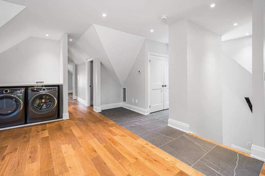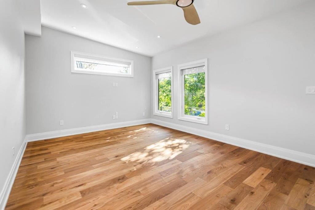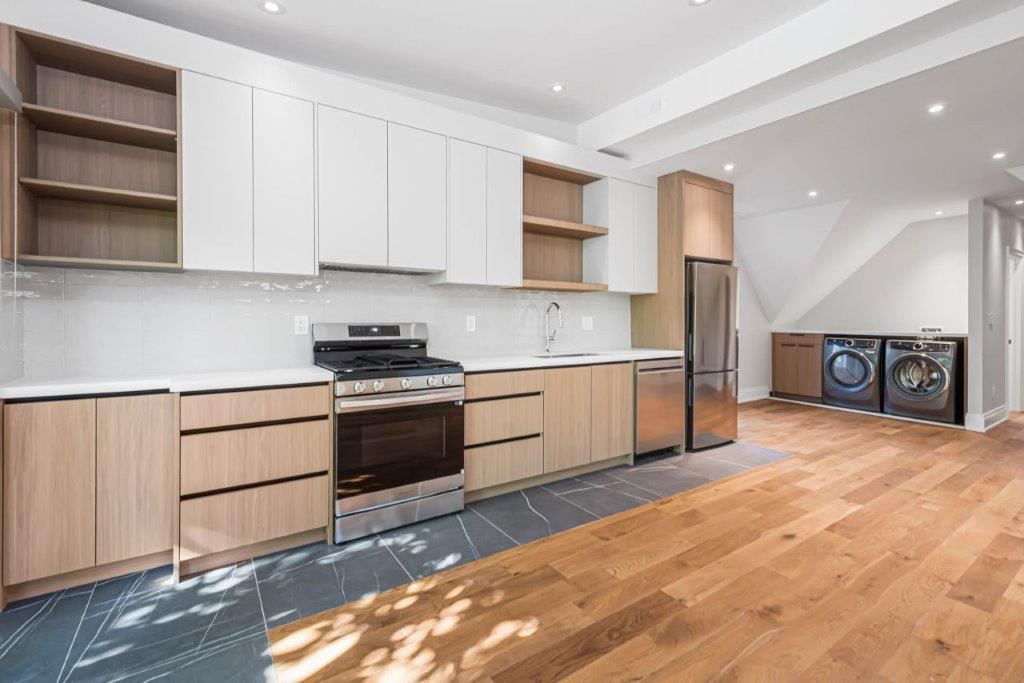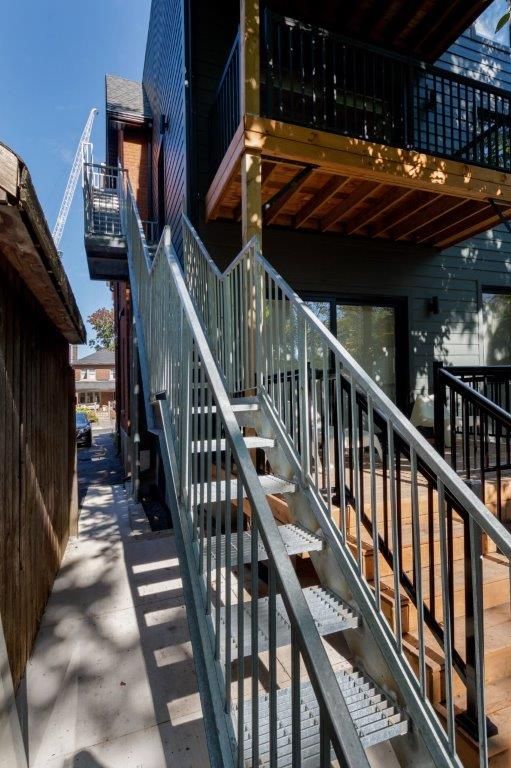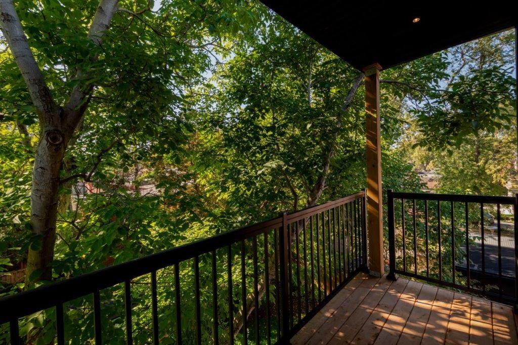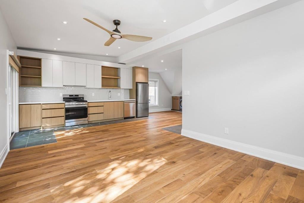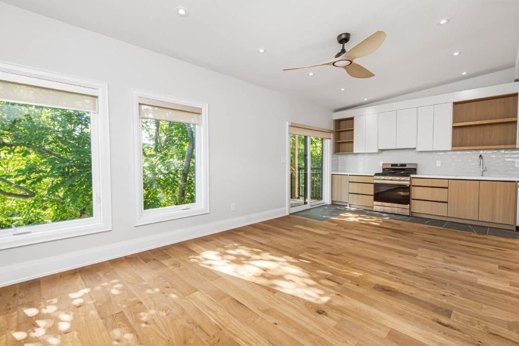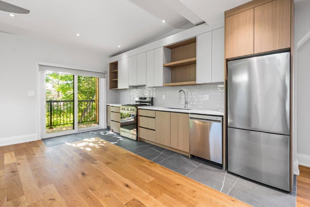 Brand new. Never lived in. Fully renovated. Premium & modern finishes throughout. Beautifully designed. Premium & modern finishes throughout. Open concept floorplan. Stunning kitchen featuring built-in shelving, backsplash, soft-close cabinets, tile flooring & potlights. Sprawling living/dining rooms with wide plank hardwood, large windows, more pot lights & w/o to deck. Laundry area with built-in storage & table top. Primary bedroom includes vaulted ceiling, large closet, large window & hardwood flooring. 2nd bedroom - perfect for working from home. Modern bath including glass enclosed stand-up shower with niche, tile floor, vanity with storage. Enclosed deck with privacy & shade from numerous trees. Fire escape for safety. 1 parking space. Additional storage.