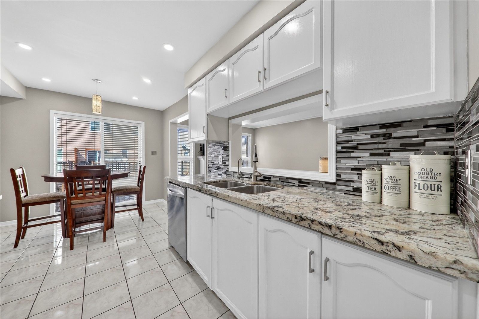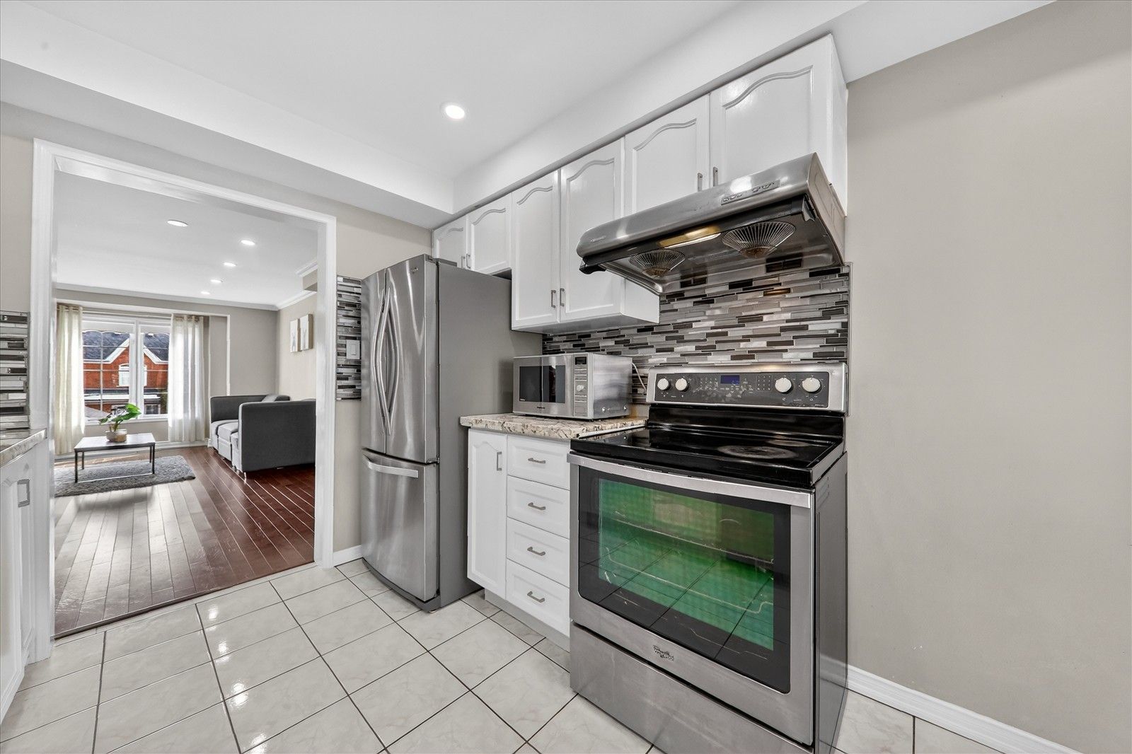• Modern kitchen with granite countertops and stainless steel appliances.