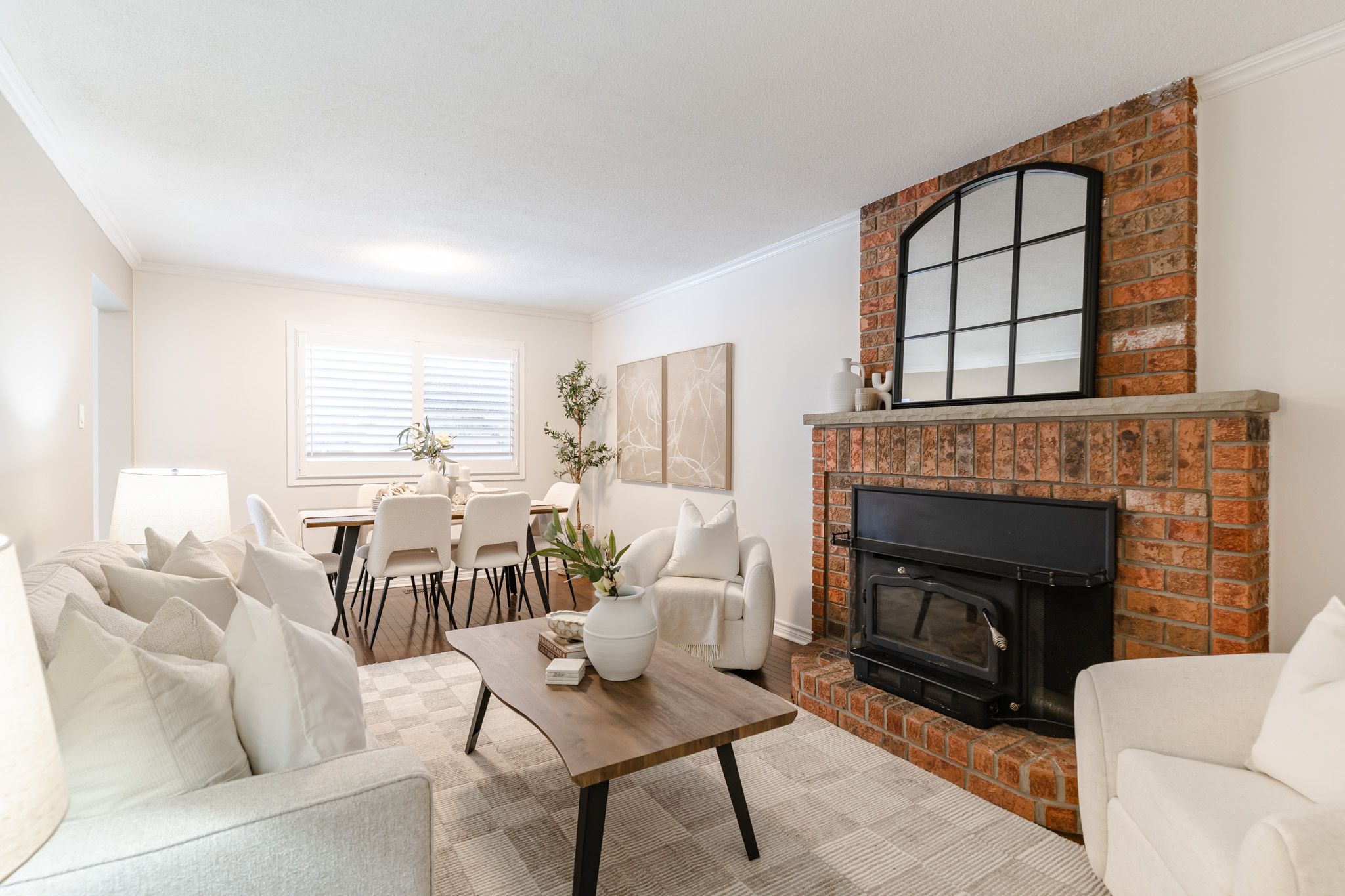 • Cozy living and dining area centered around a wood stove for warmth.