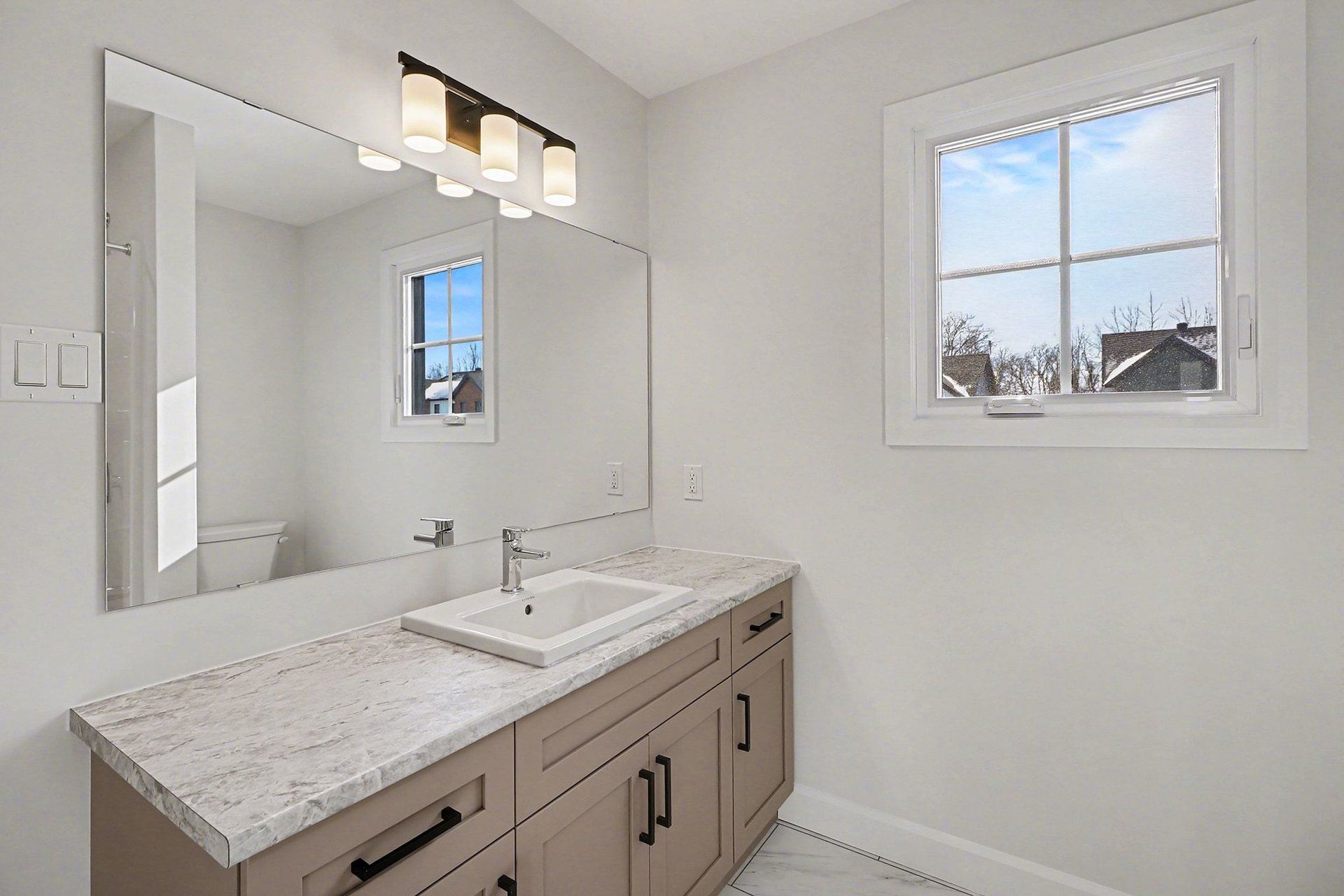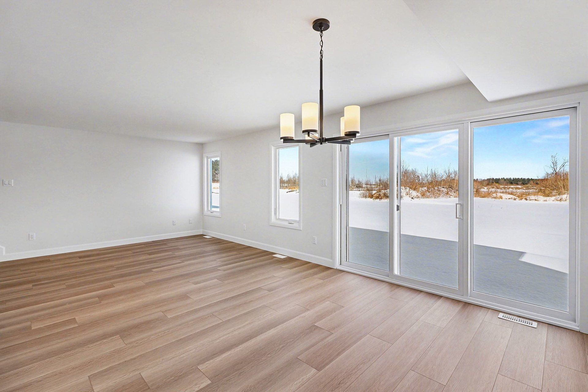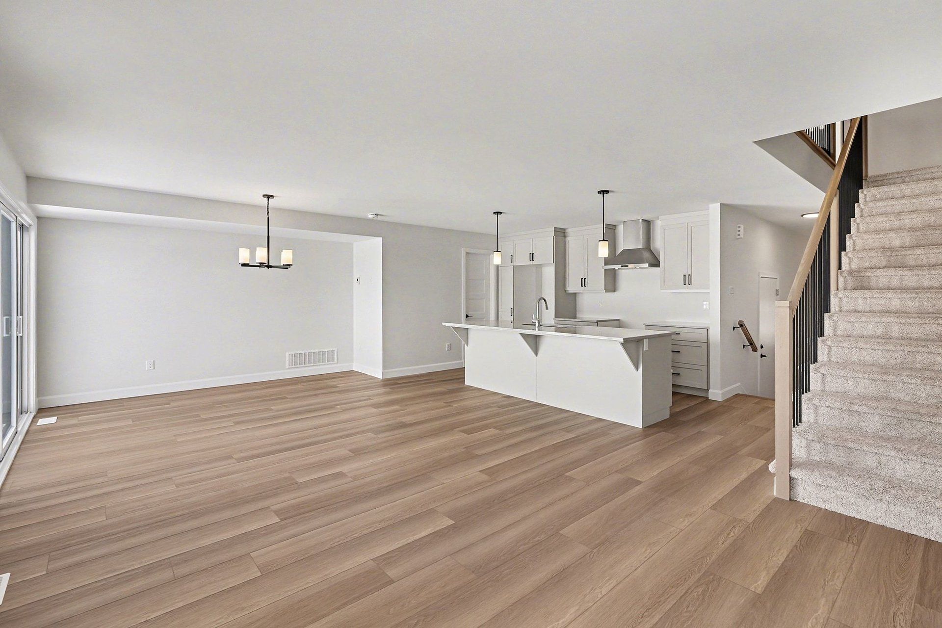 • Open concept main floor with quartz counters and a large kitchen island.