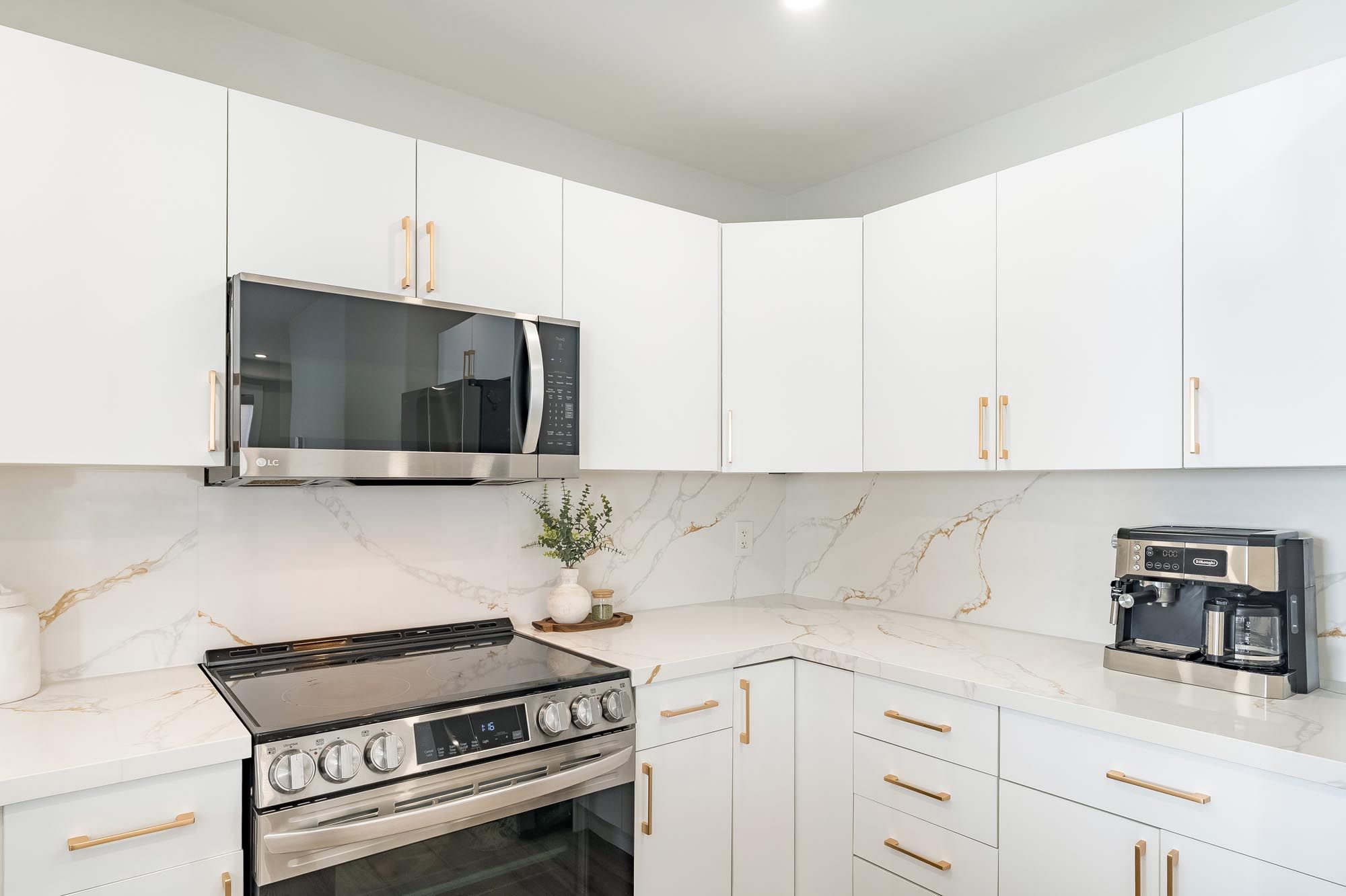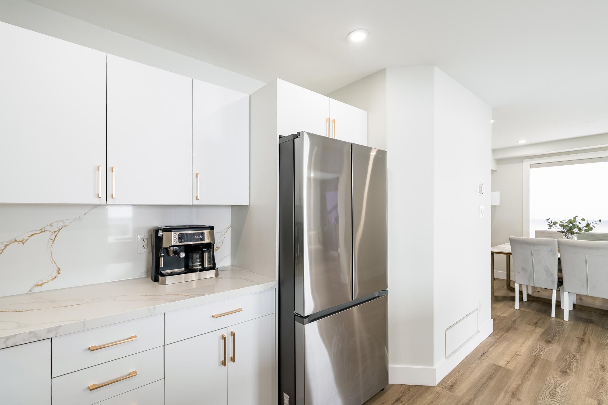 • Renovated kitchen with modern finishes and quartz countertops.