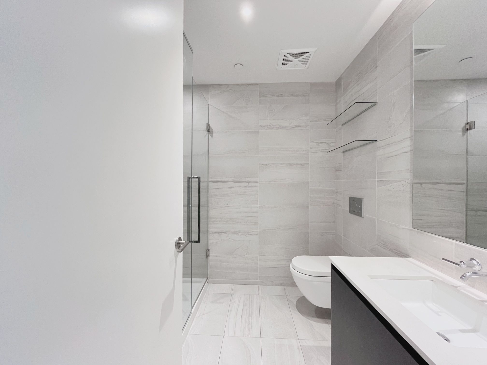 • In-suite laundry and elegant bathroom with glass-enclosed shower.