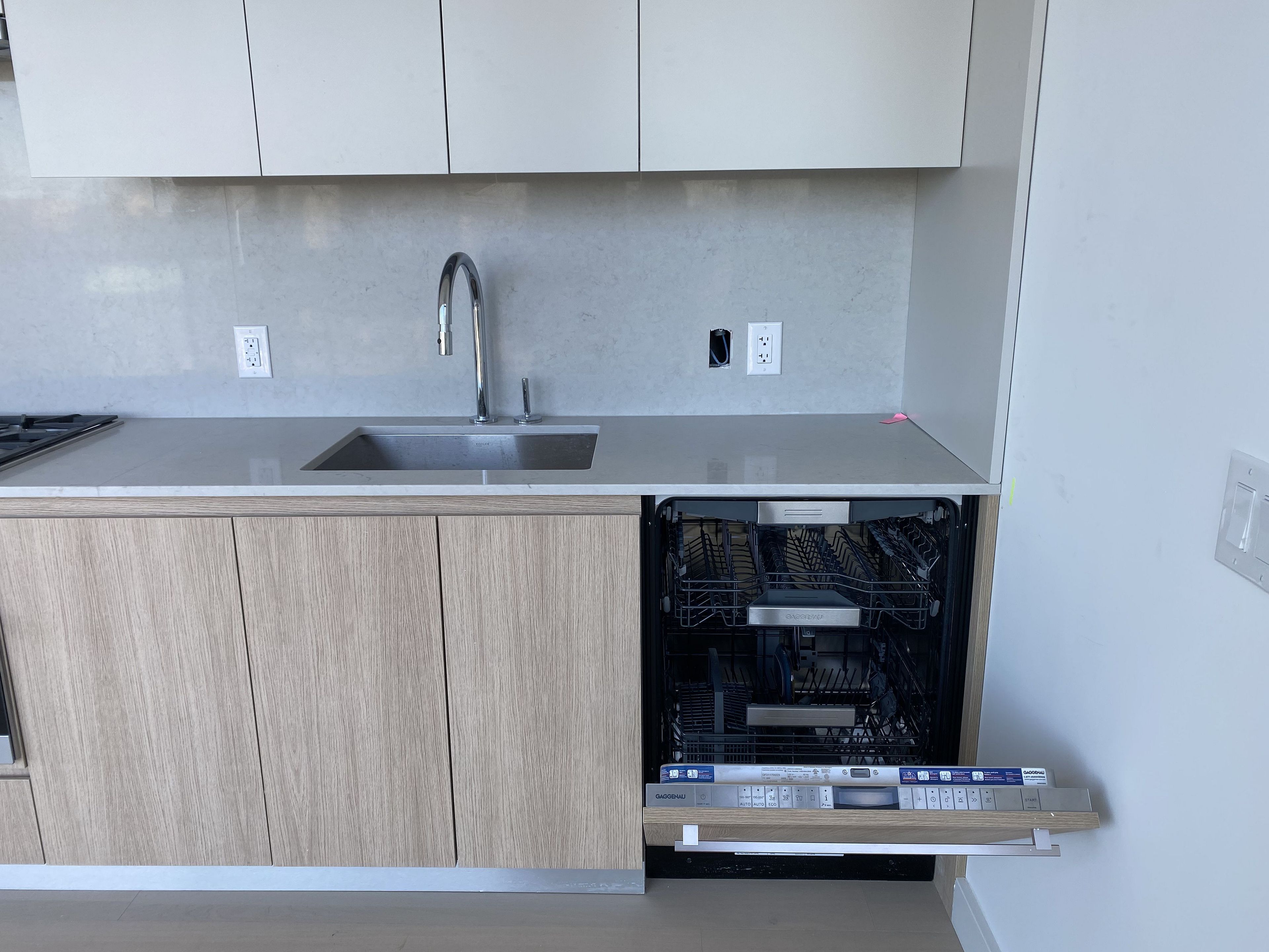 • Modern kitchen with high-end appliances and quartz countertop.