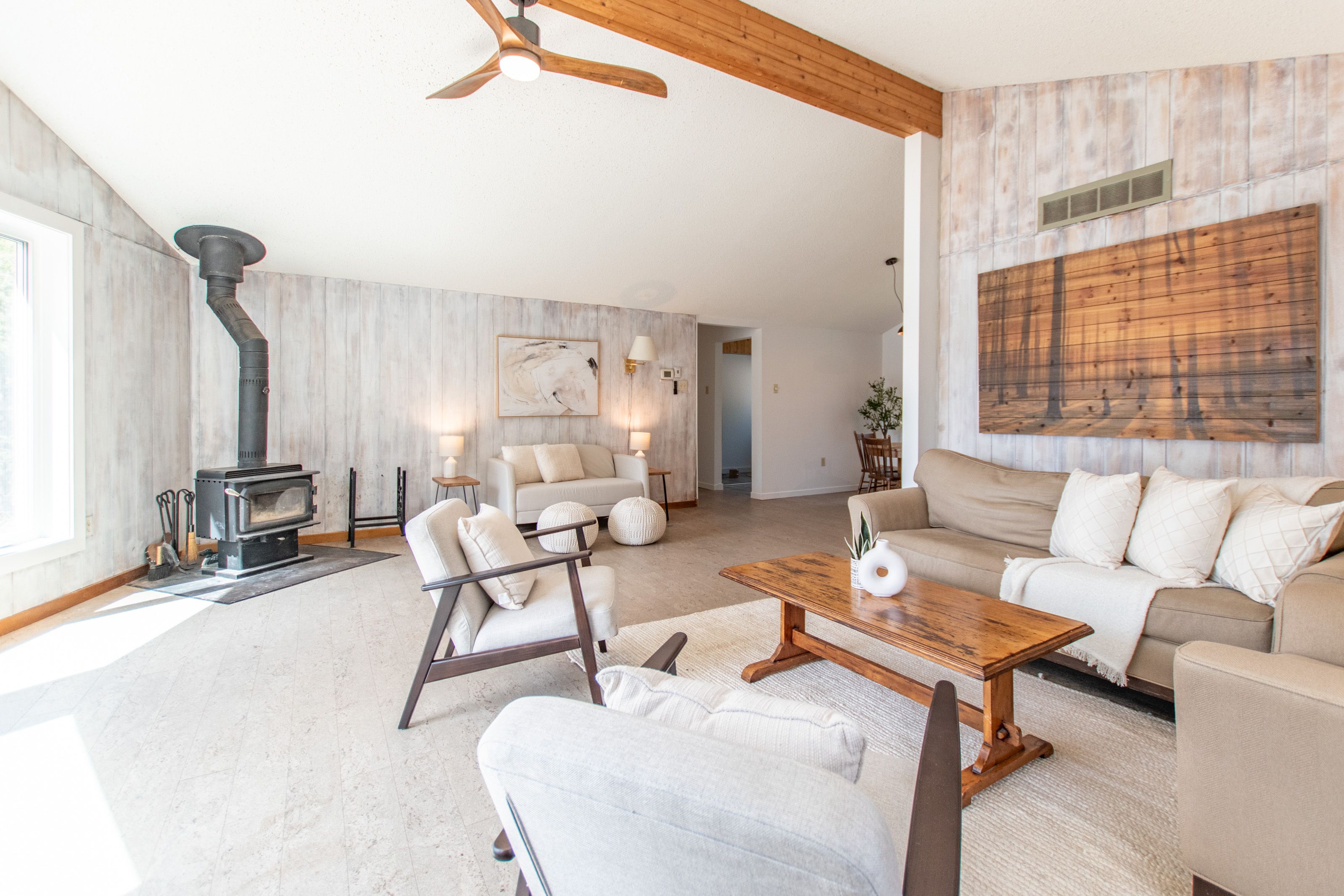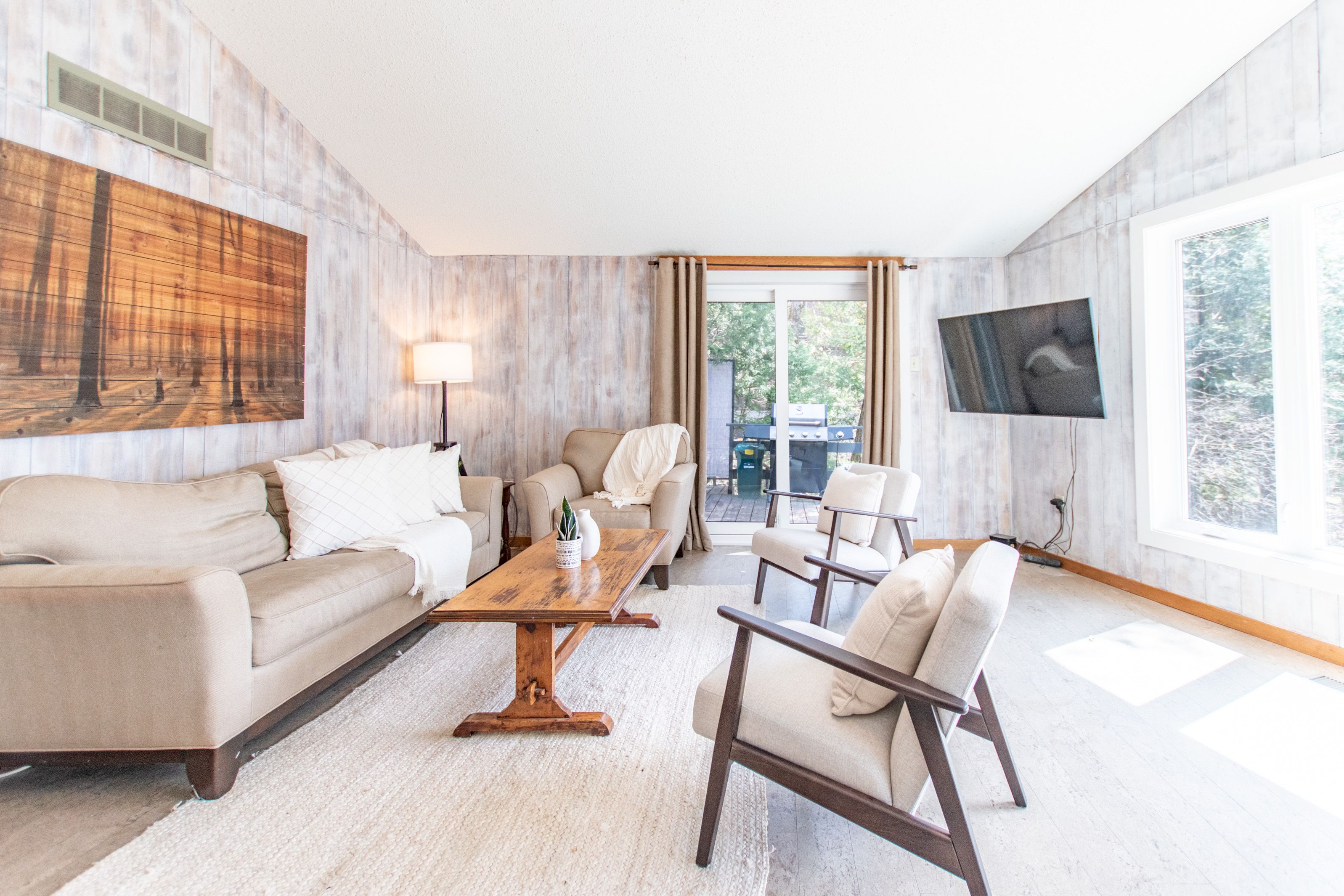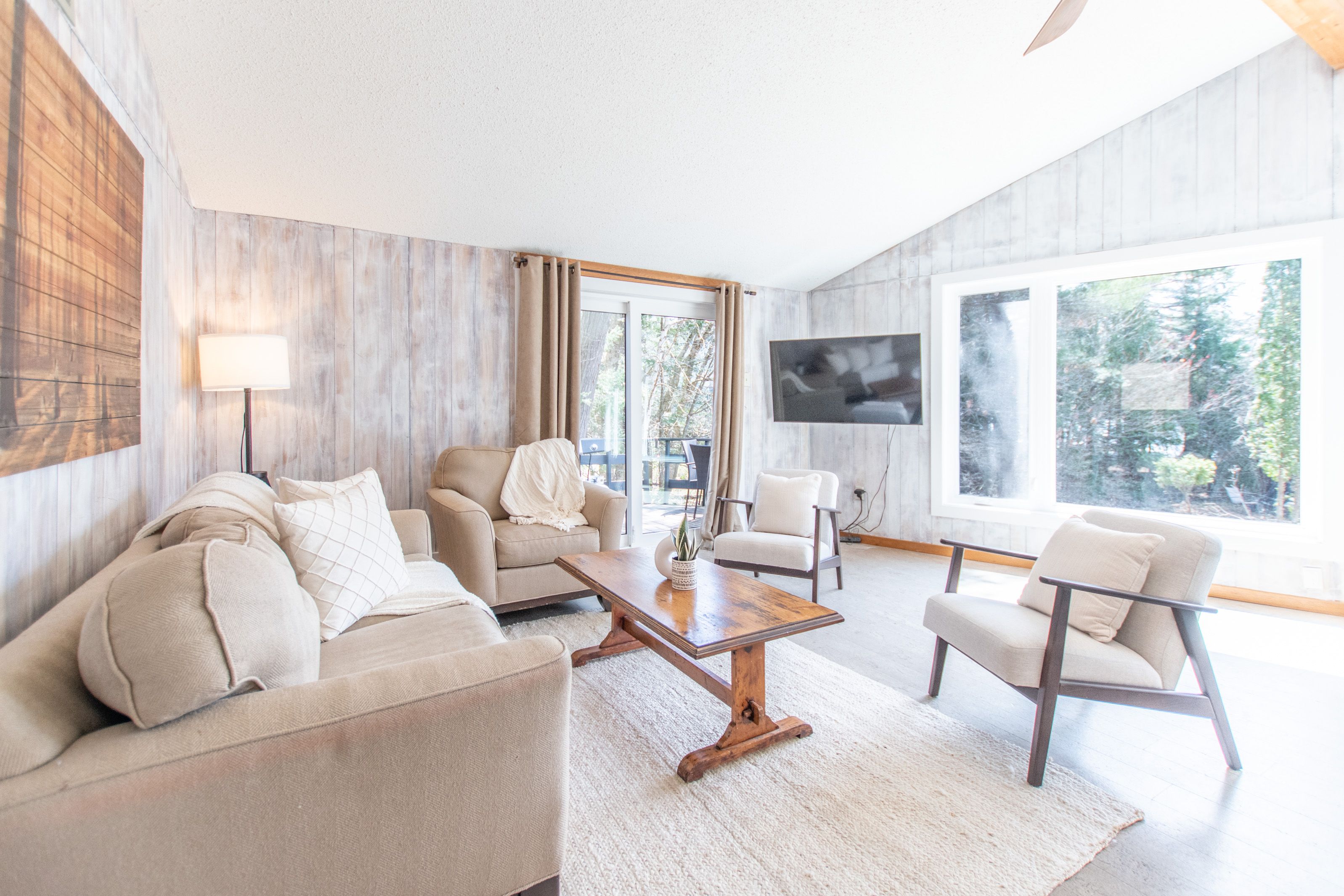 • Spacious living room with cathedral ceilings and lake-facing windows.