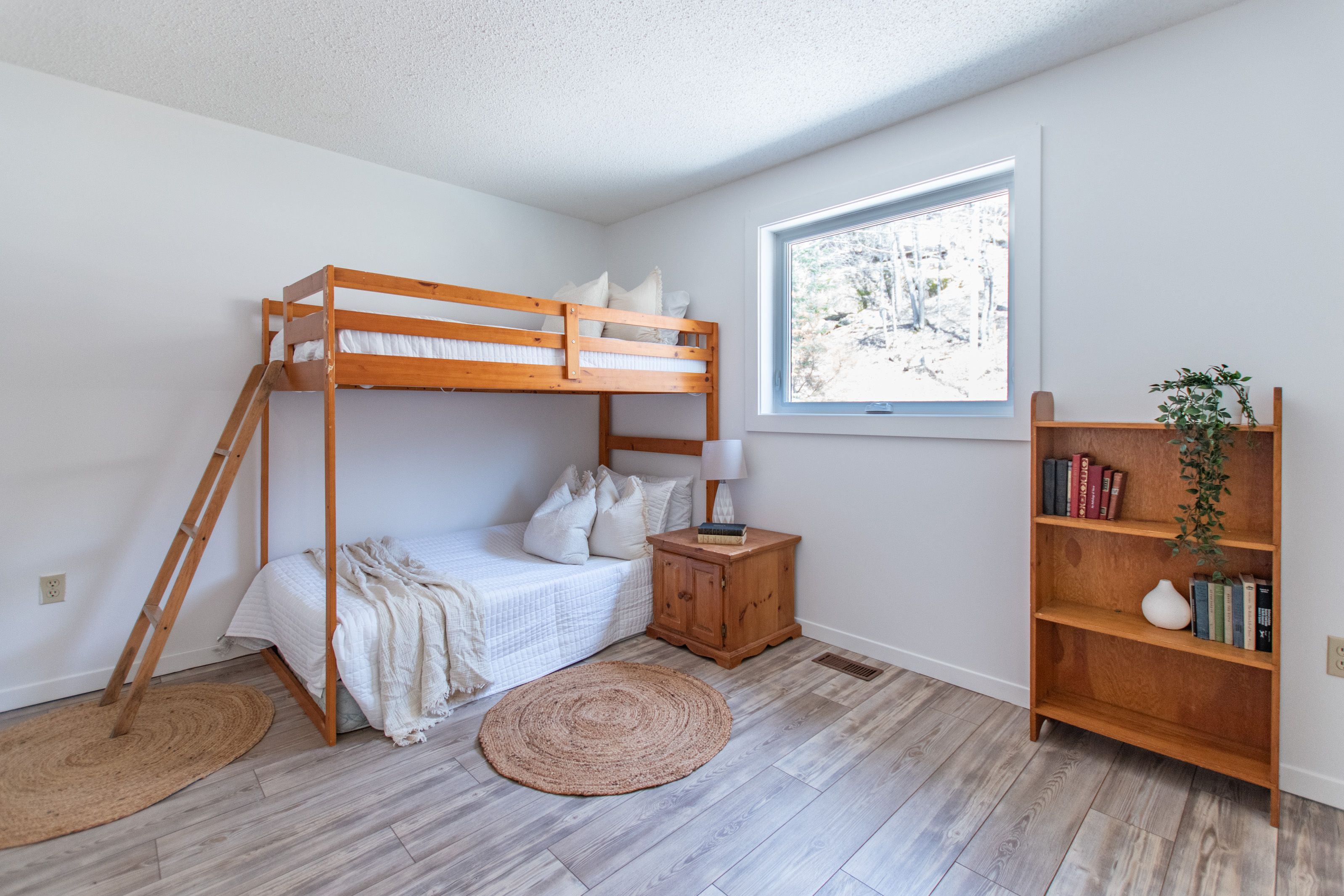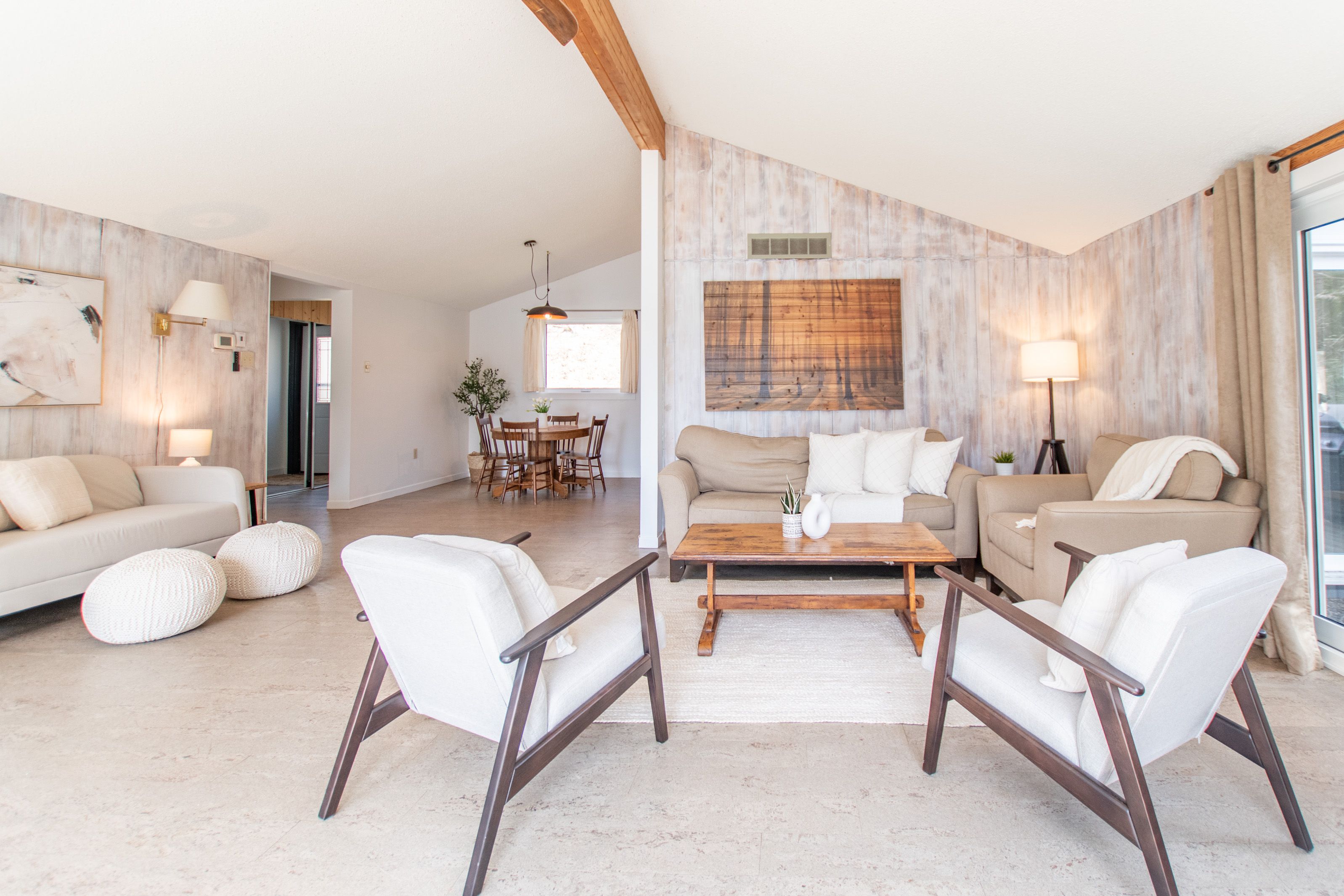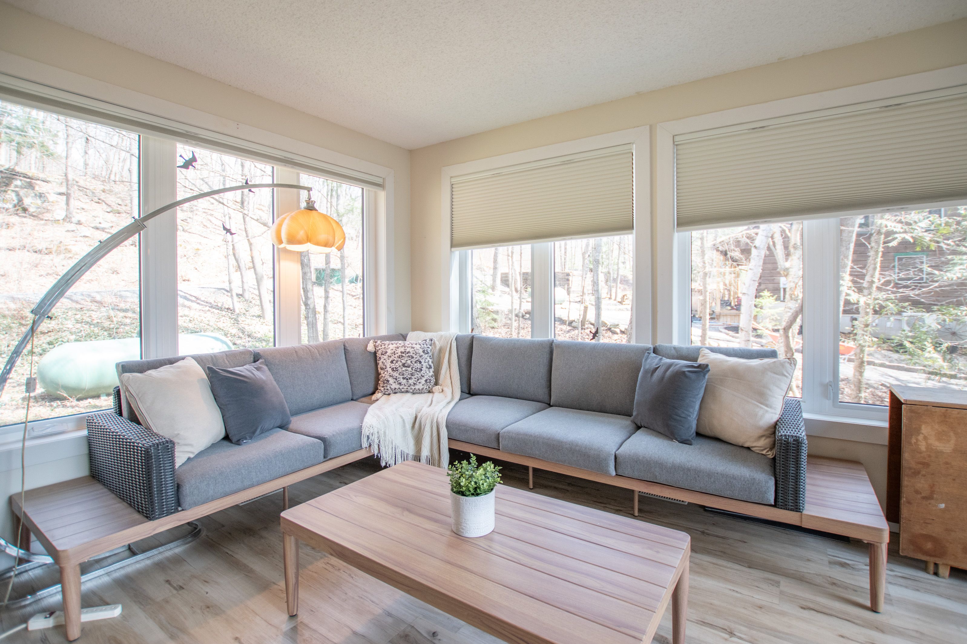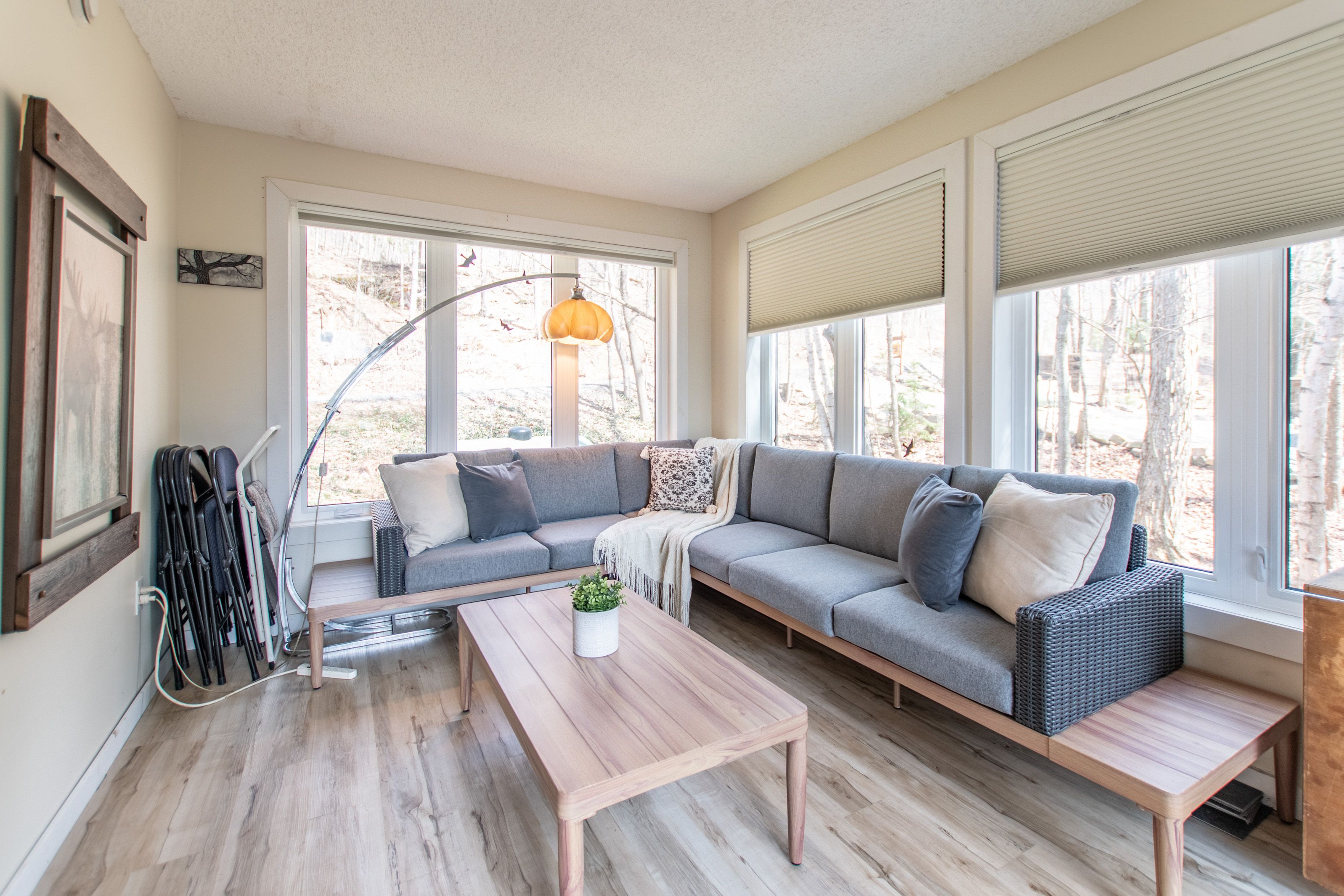 • Spacious living room with cathedral ceilings and lake-facing windows.