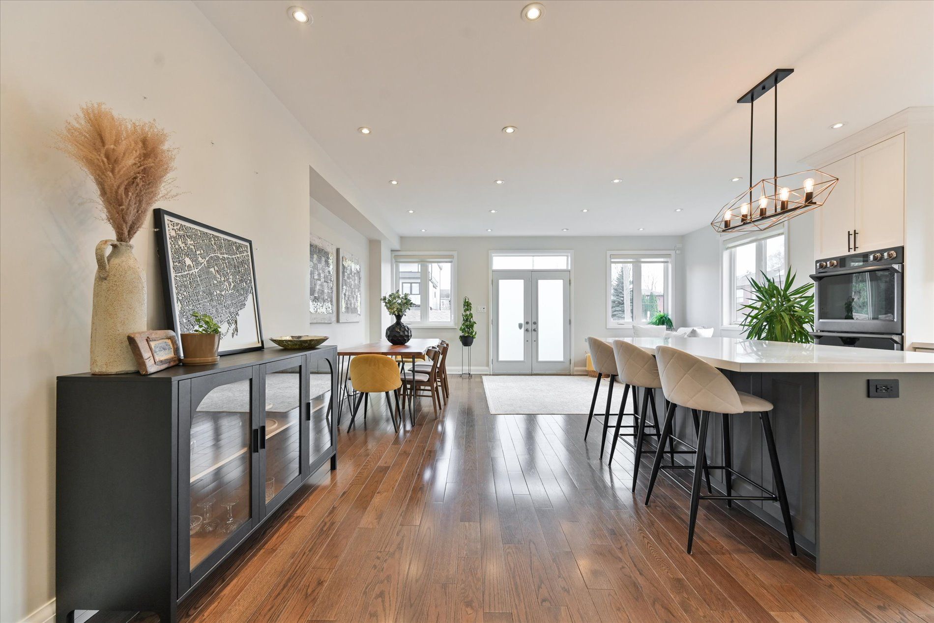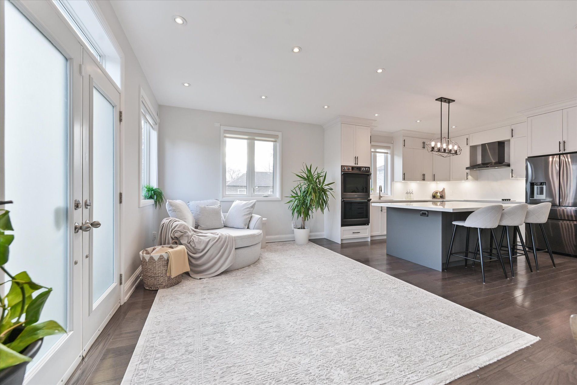 • Bright open-concept layout with high ceilings for a spacious feel.