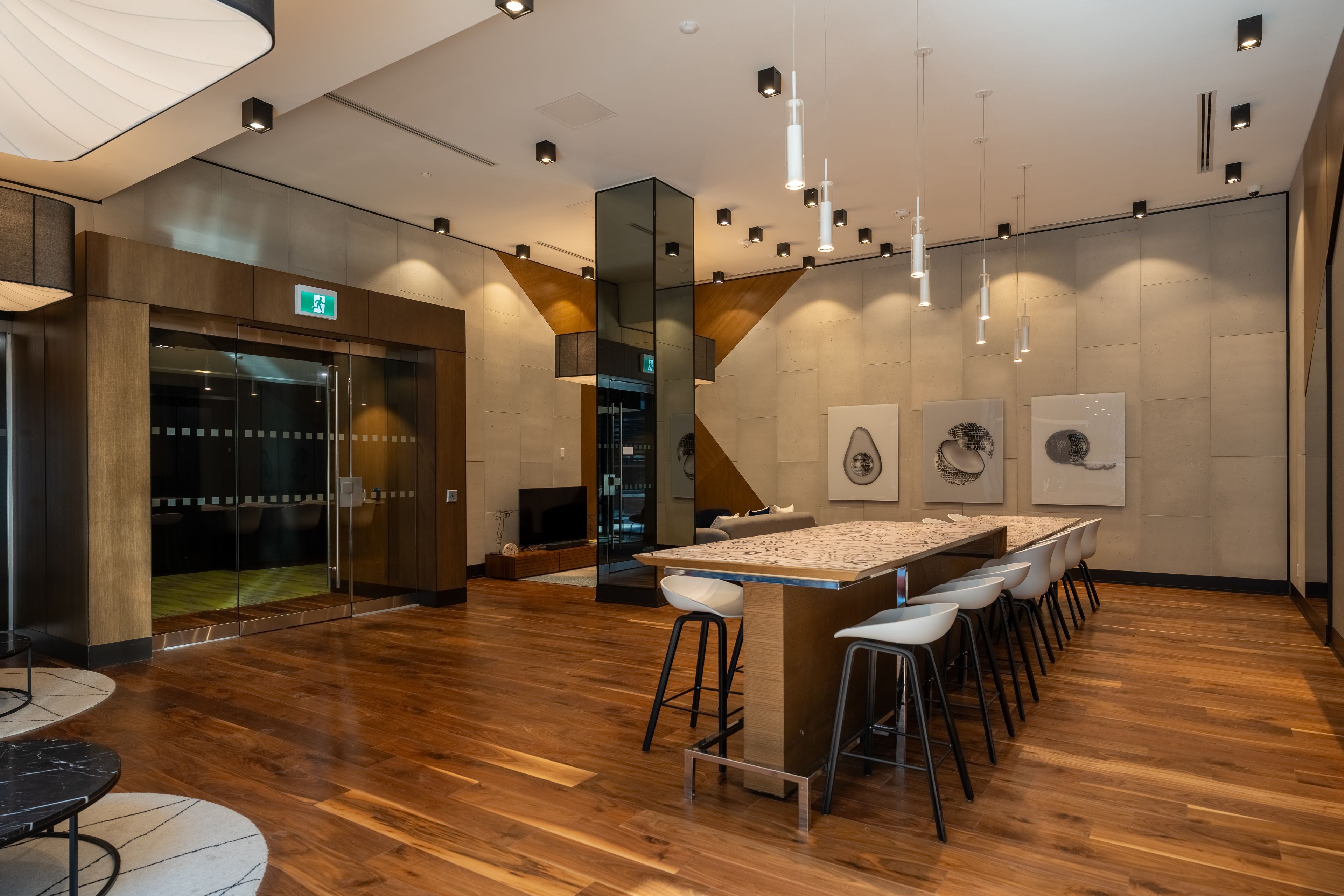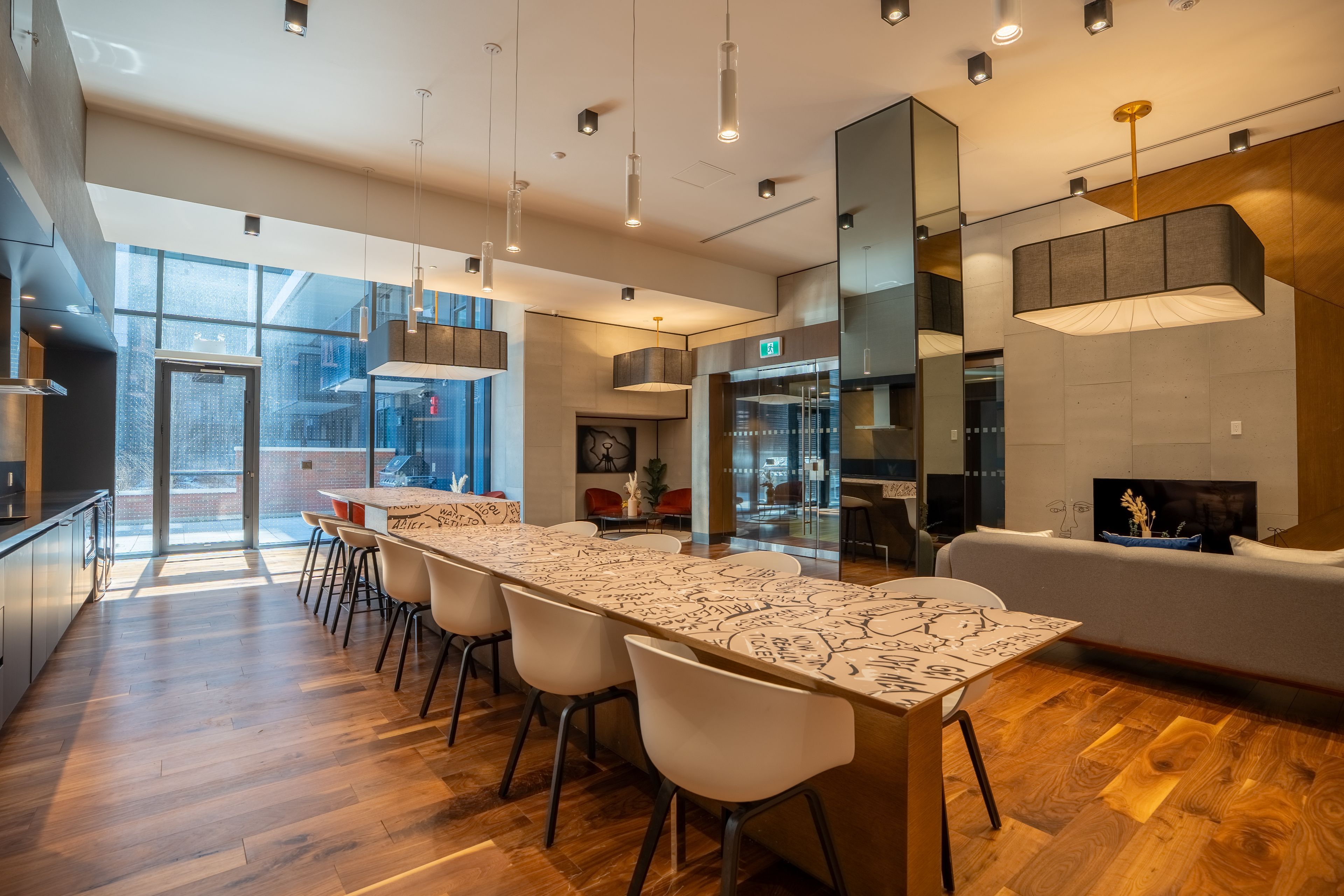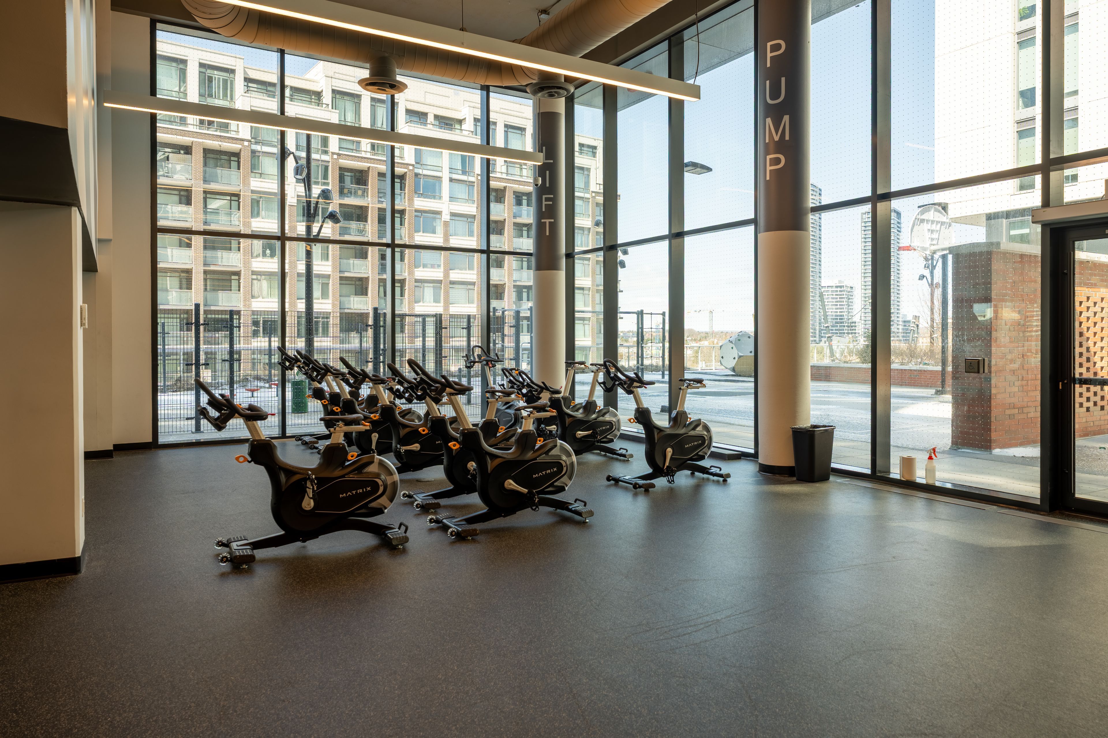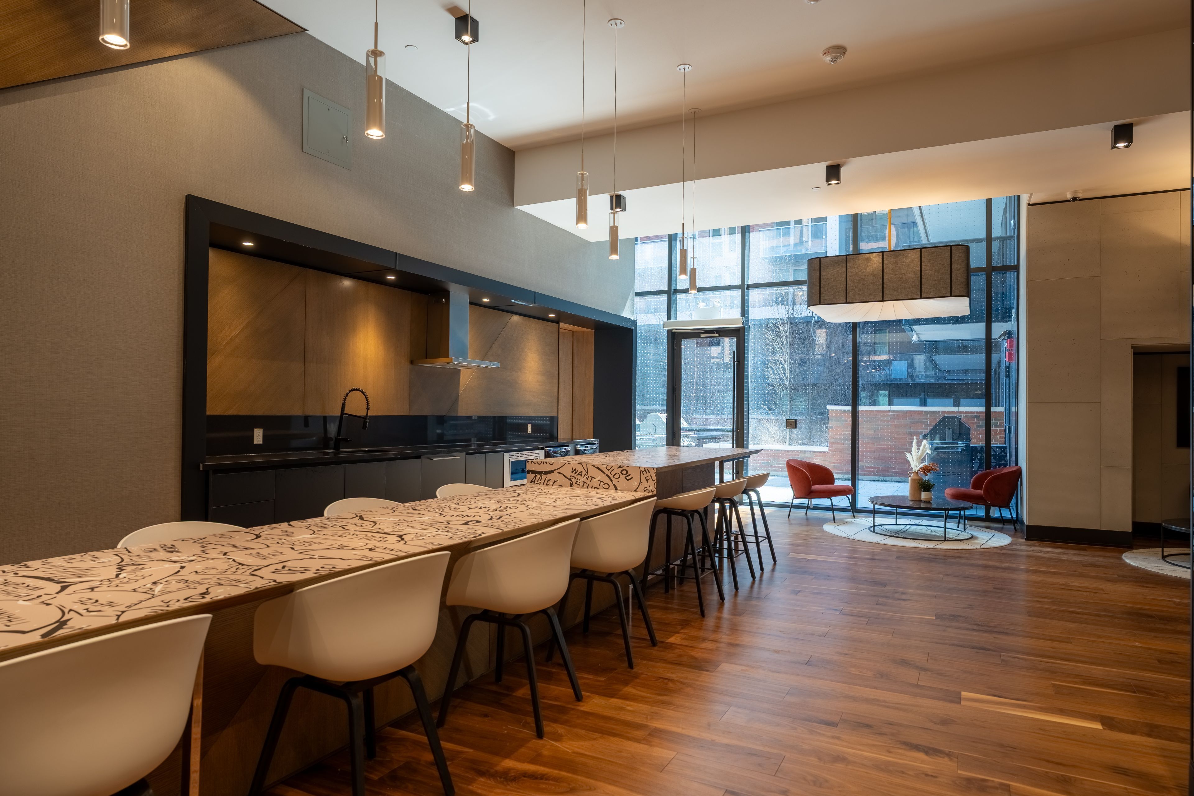 • Building amenities include gym, pet spa, rooftop deck, and party rooms.