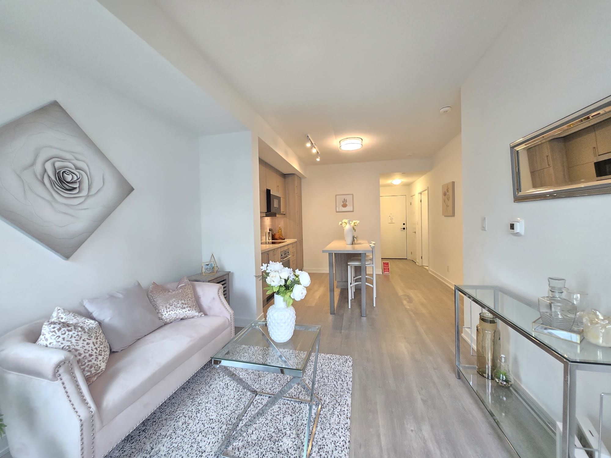 Imagine paying for a 1 bedroom + den, but enjoying the functionality of a 2 bedroom? Your opportunity has arrived at gallery square condominiums in the heart of vibrant downtown markham! Built by the remington group in 2023, this bright and stylish 636 sq ft suite features 9 ft ceilings, wide plank laminate flooring and a functional open concept layout. Contemporary kitchen with sleek cabinetry, quartz counters, stainless steel appliances and a large centre island perfect for dining and entertaining. Spacious living area walks out to a private balcony with open south-east views and abundant natural light. Primary bedroom with double closet and 4-piece ensuite bath. Generously sized den enclosed with elegant french doors, large enough to function as a second bedroom, home office or guest space. Includes a second full bathroom with glass shower for added convenience. Enjoy true urban living steps to restaurants, cafes, cineplex vip cinemas, goodlife fitness, shops, york university markham campus, parks and trails. Easy access to viva transit, unionville go station, hwy 404 & 407. Perfect for professionals, first-time buyers or investors. ** extras ** all existing appliances: built-in fridge, oven, dishwasher, over-the-range microwave; glass cook-top; white front-load washer & dryer; all existing window coverings & elfs;