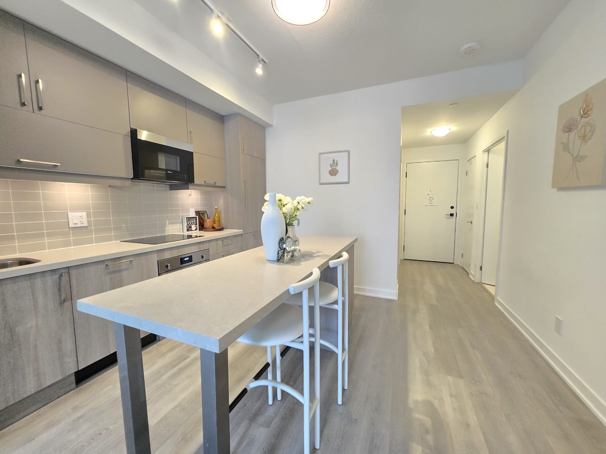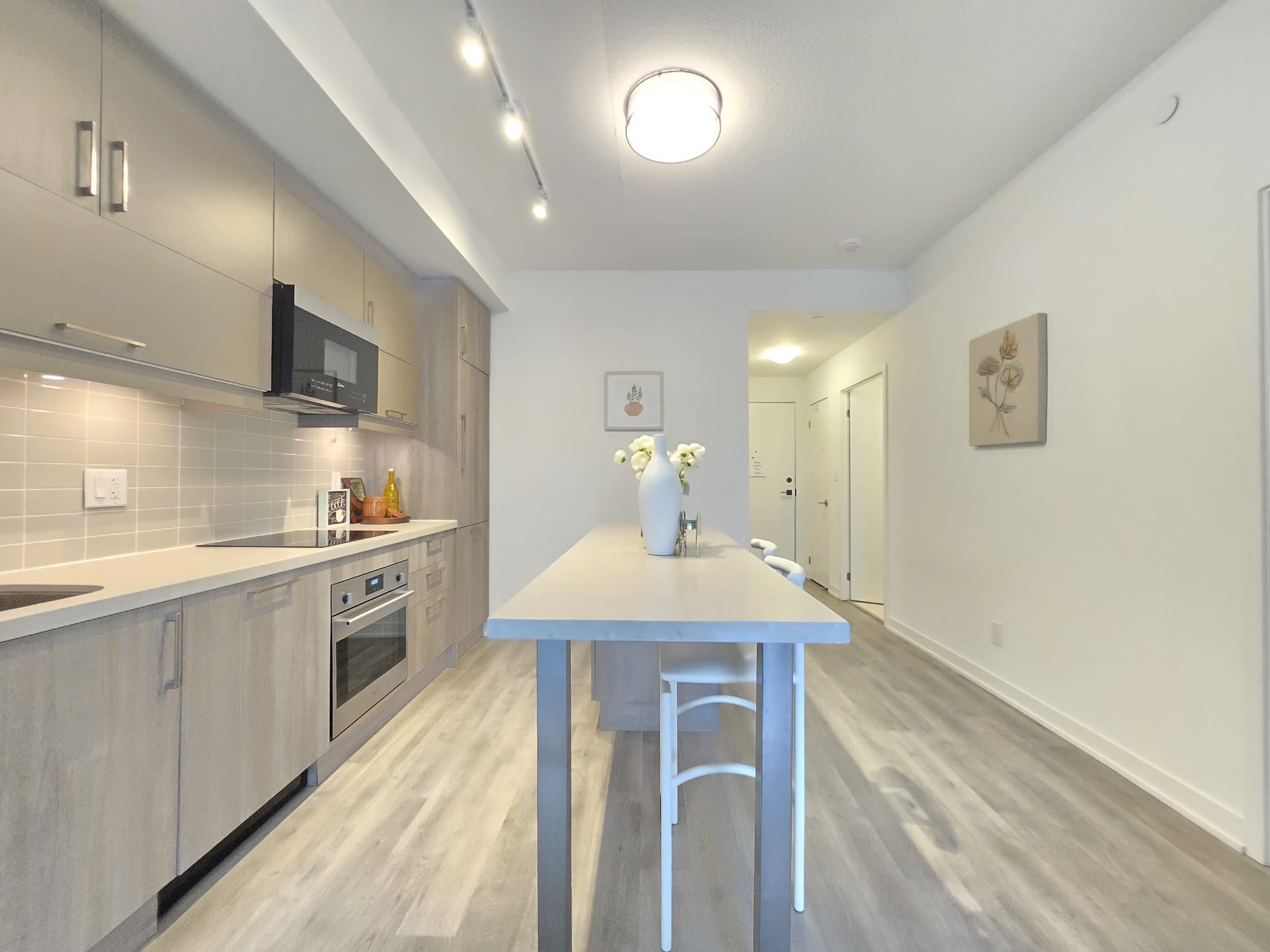 • Contemporary kitchen features quartz counters and stainless steel appliances.