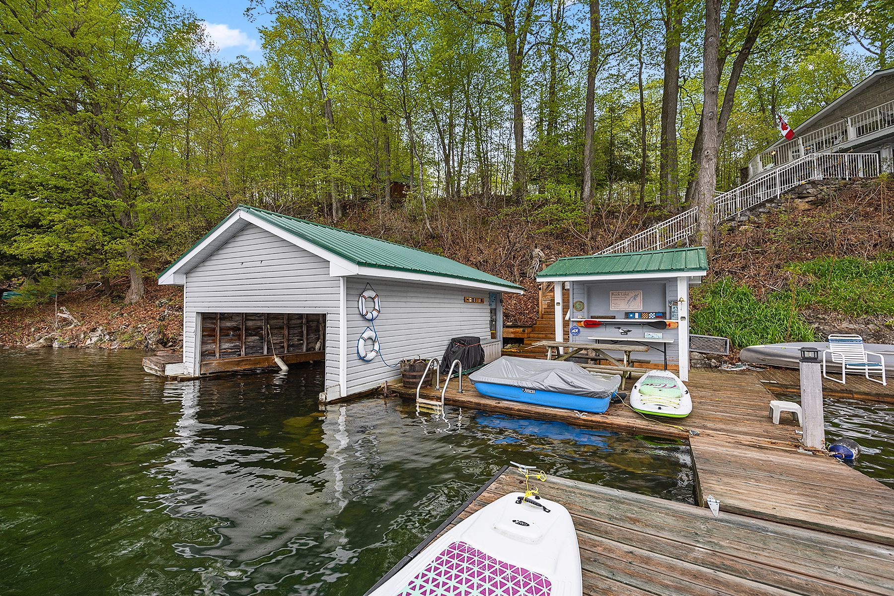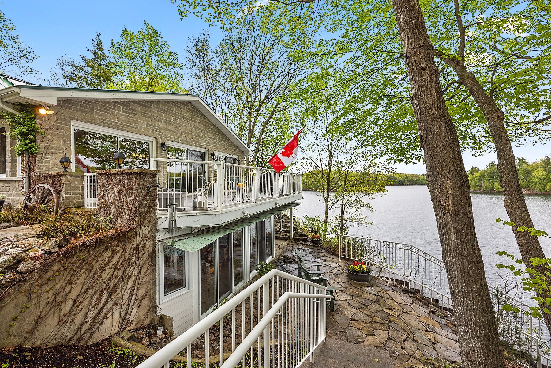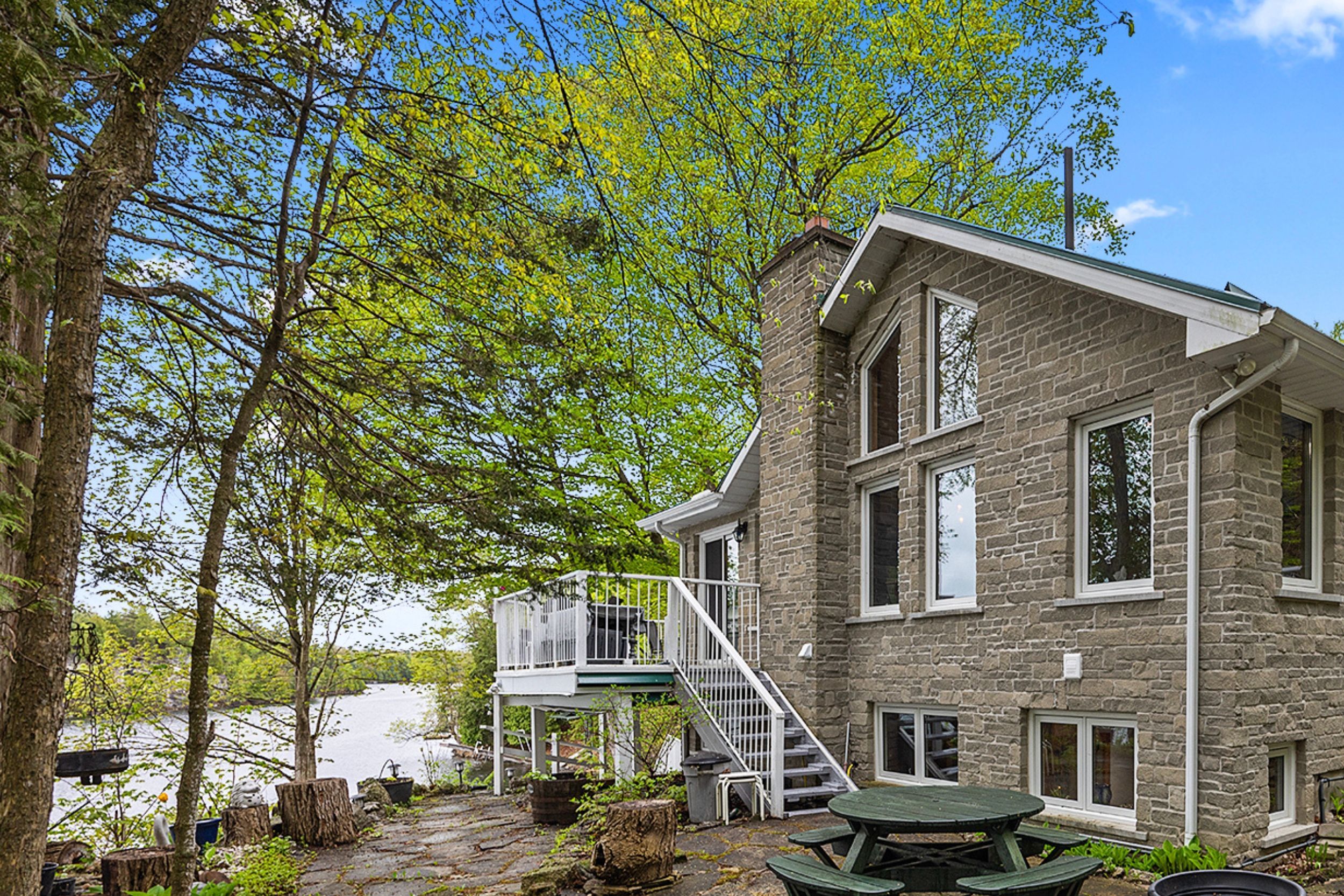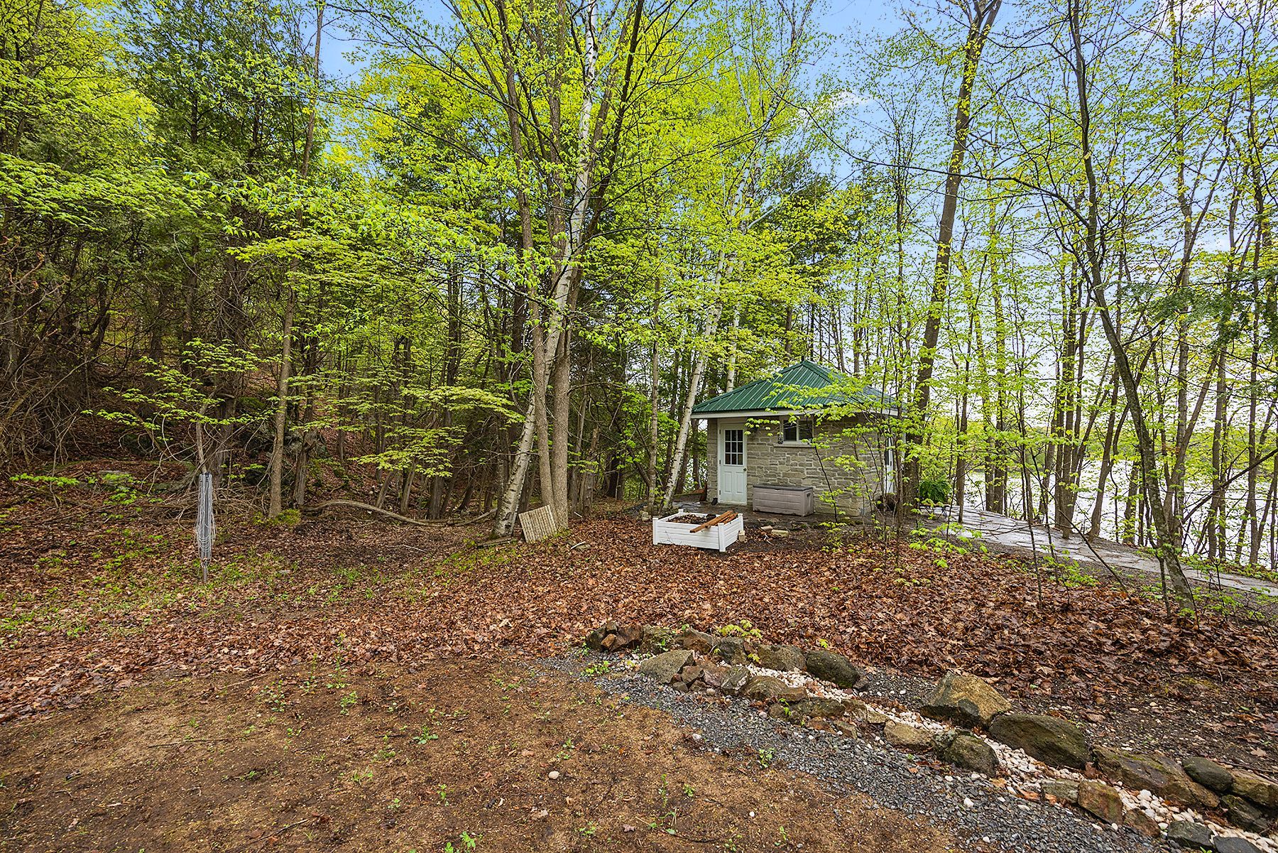Just a short drive from downtown kingston and a quick jaunt into westport, nestled among more than 20 varieties of mature trees, on spring fed buck lake and in the canadian shield, this prestigious stone, raised bungalow is waiting for you to call home. The main floor boasts floor to ceiling windows and patio doors to the wrap around deck and clear, 180 degree view of crown land including exclusive direct sight of the famous local landmark, pulpit island with the iconic "devil's pulpit". The lower level, which is a walk-out, has two additional bedrooms (that could be 3), a 4-piece bathroom, laundry closet, cozy rec room with propane fireplace and like upstairs, floor to ceiling windows and patio doors so that you never lost the view. You walk out into a three season space under the deck, here you'll spend many nights playing cards/games. Just a few steps from the main house is a beautiful 4 season guest house, complete with a single/double bunk bed, toilet, sink and outdoor shower. Take the stone steps down to the crystal clear and deep shoreline, pop open the cabana and host the best dock party around! There is plenty of room on the dock for all sorts of activities and the original solid boat house is ready, waiting to house your watercraft of choice. The period style of the building's living space (2,078 sq ft) is enhanced by artful, expansive and expensive landscaping of local stone and materials; patios, pathways, limestone steps, iron railings, border rock fences, 2 large rough cut board and batten pine sheds, with steel roofs to match the main house! Upgraded septic system, brand new kohler-generator, and bunkhouse cabin. This is a home that needs to be seen and experienced in person!
