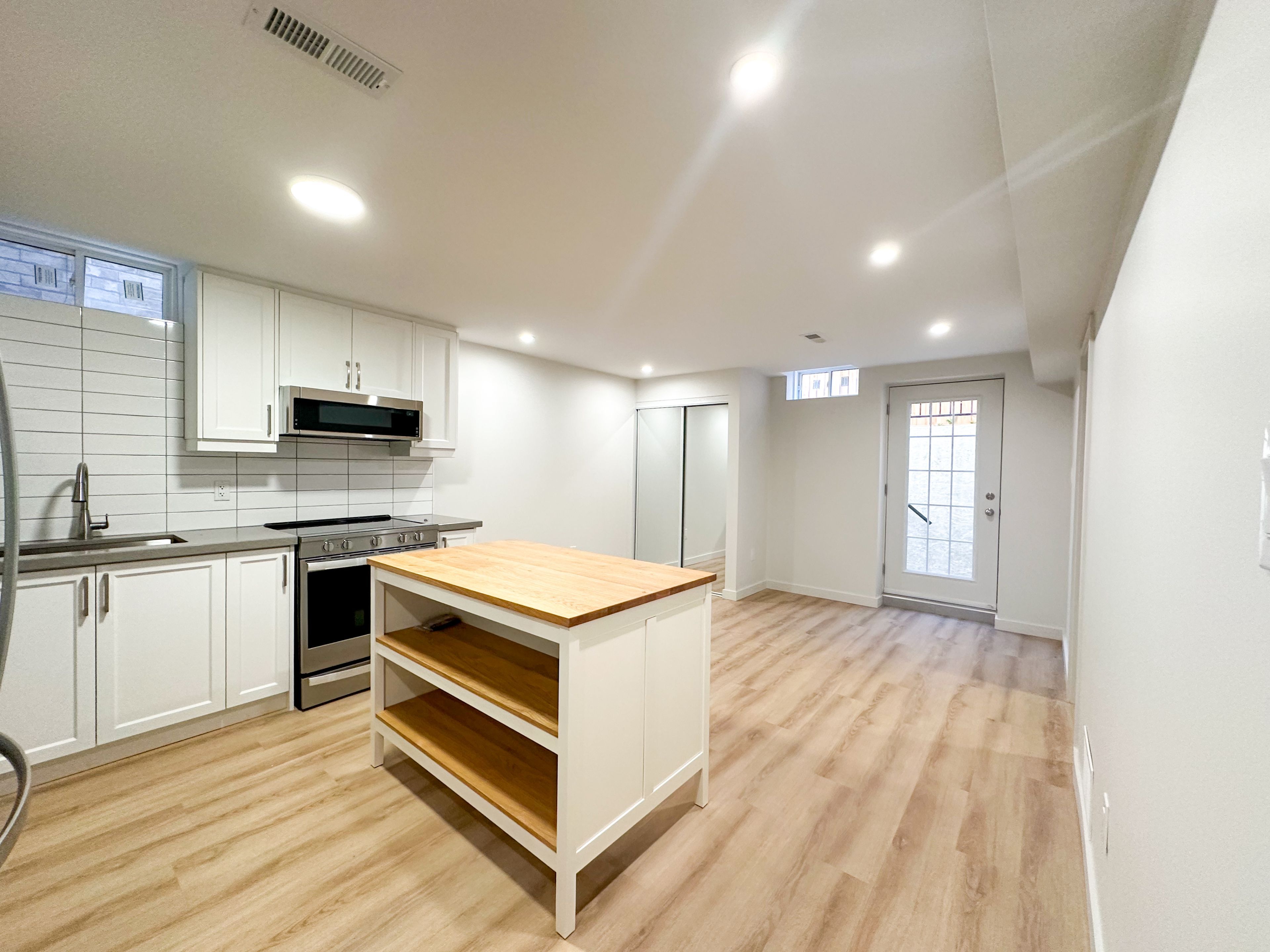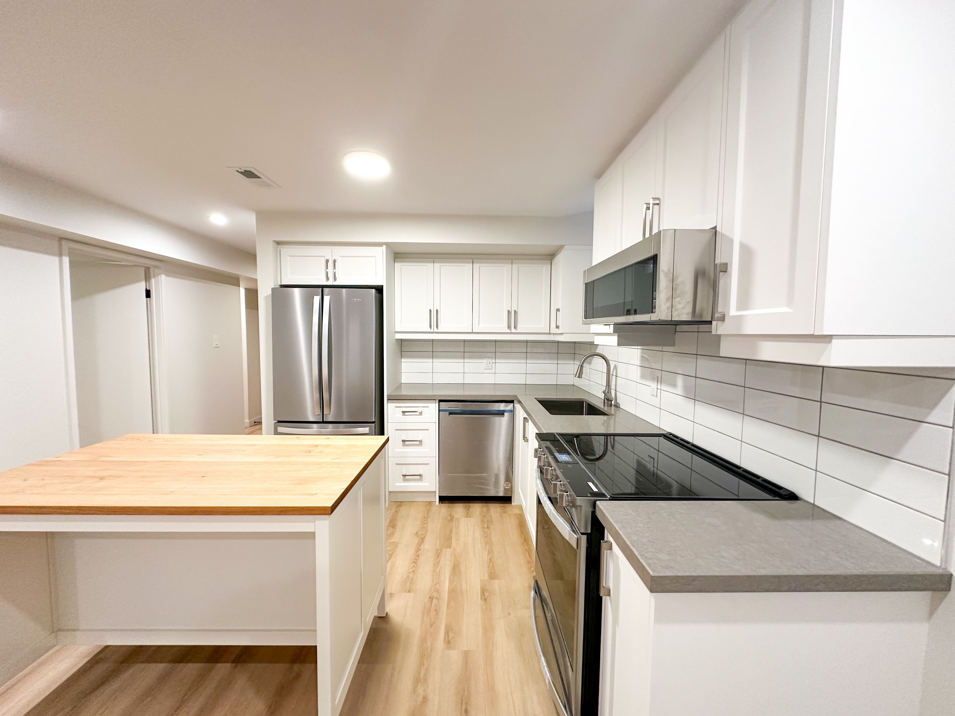 • Sleek kitchen with stainless steel appliances and work island.