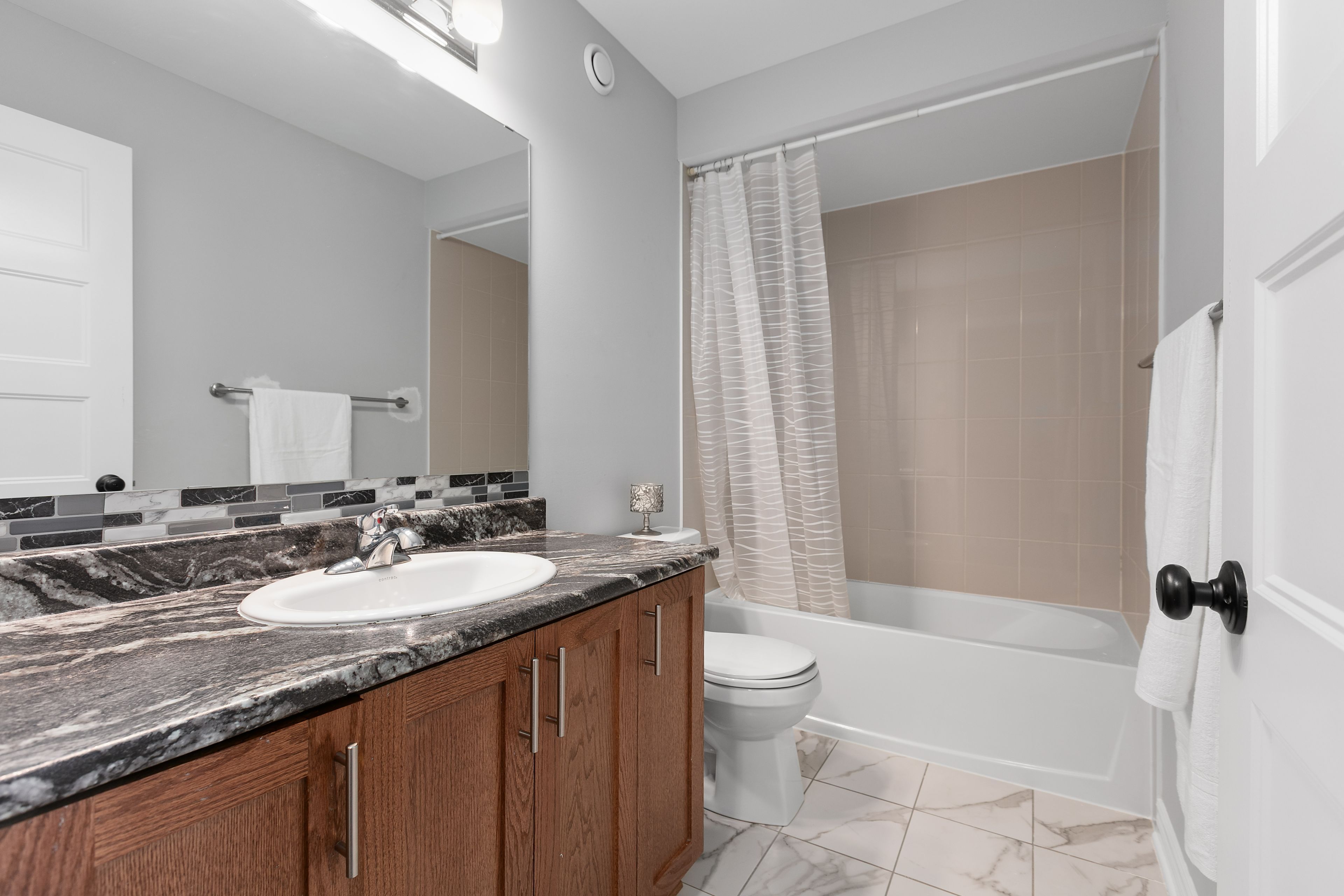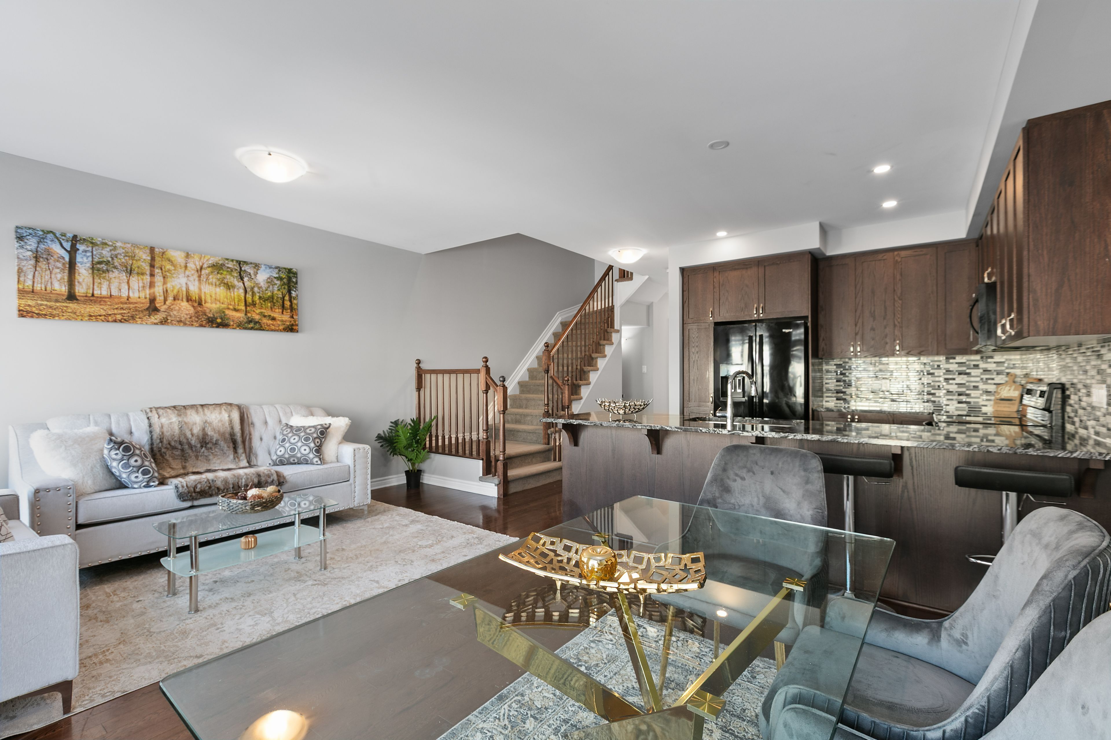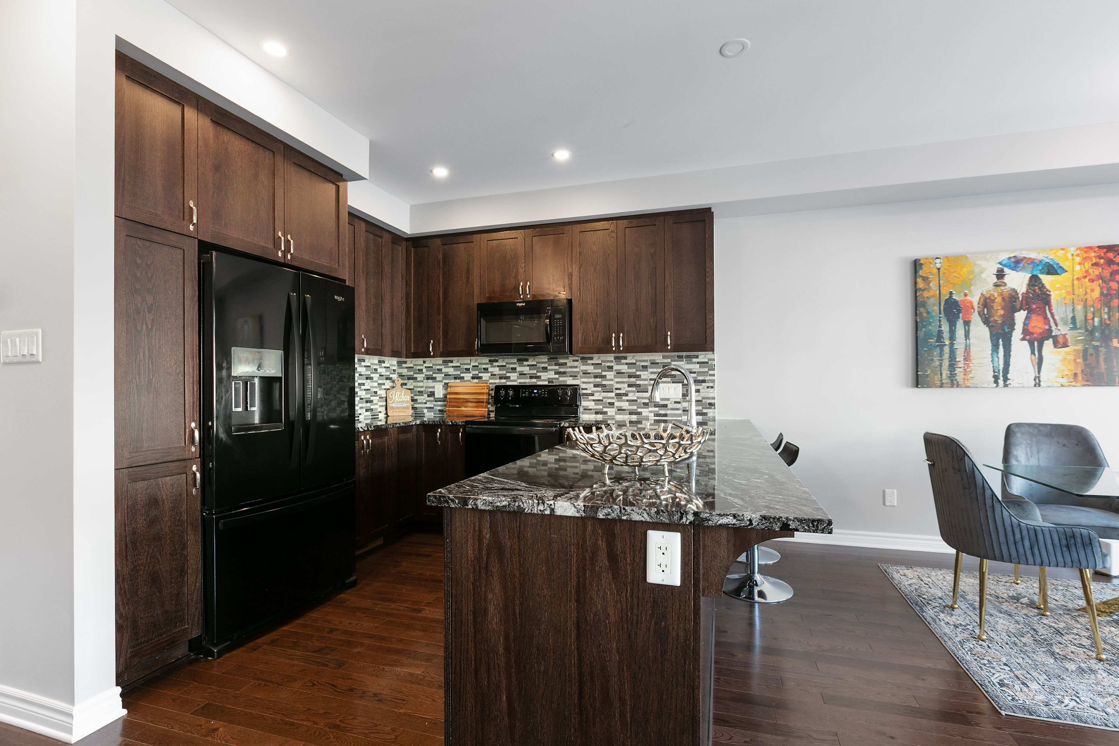 • Modern kitchen with quartz countertops and functional eating bar.