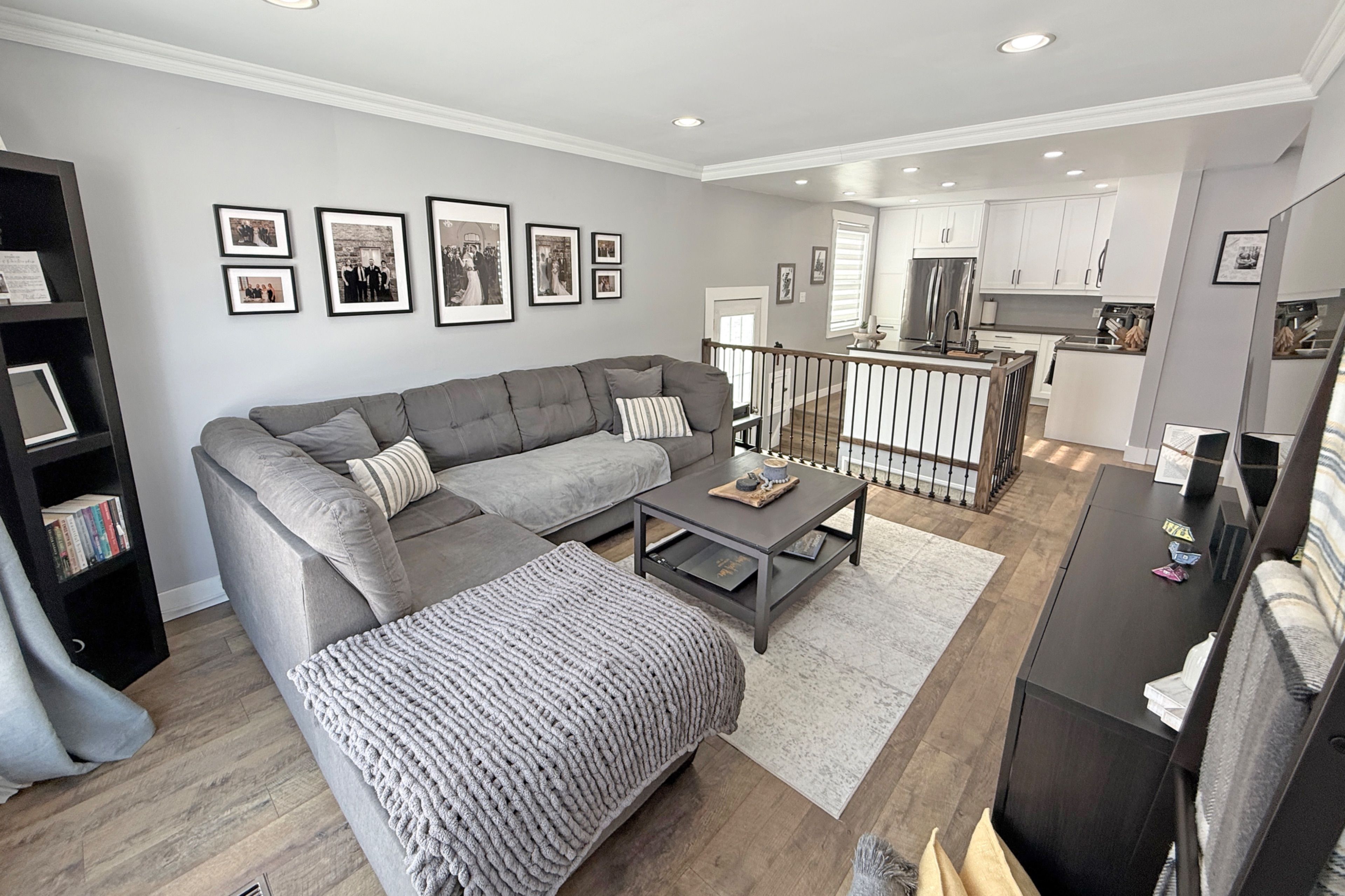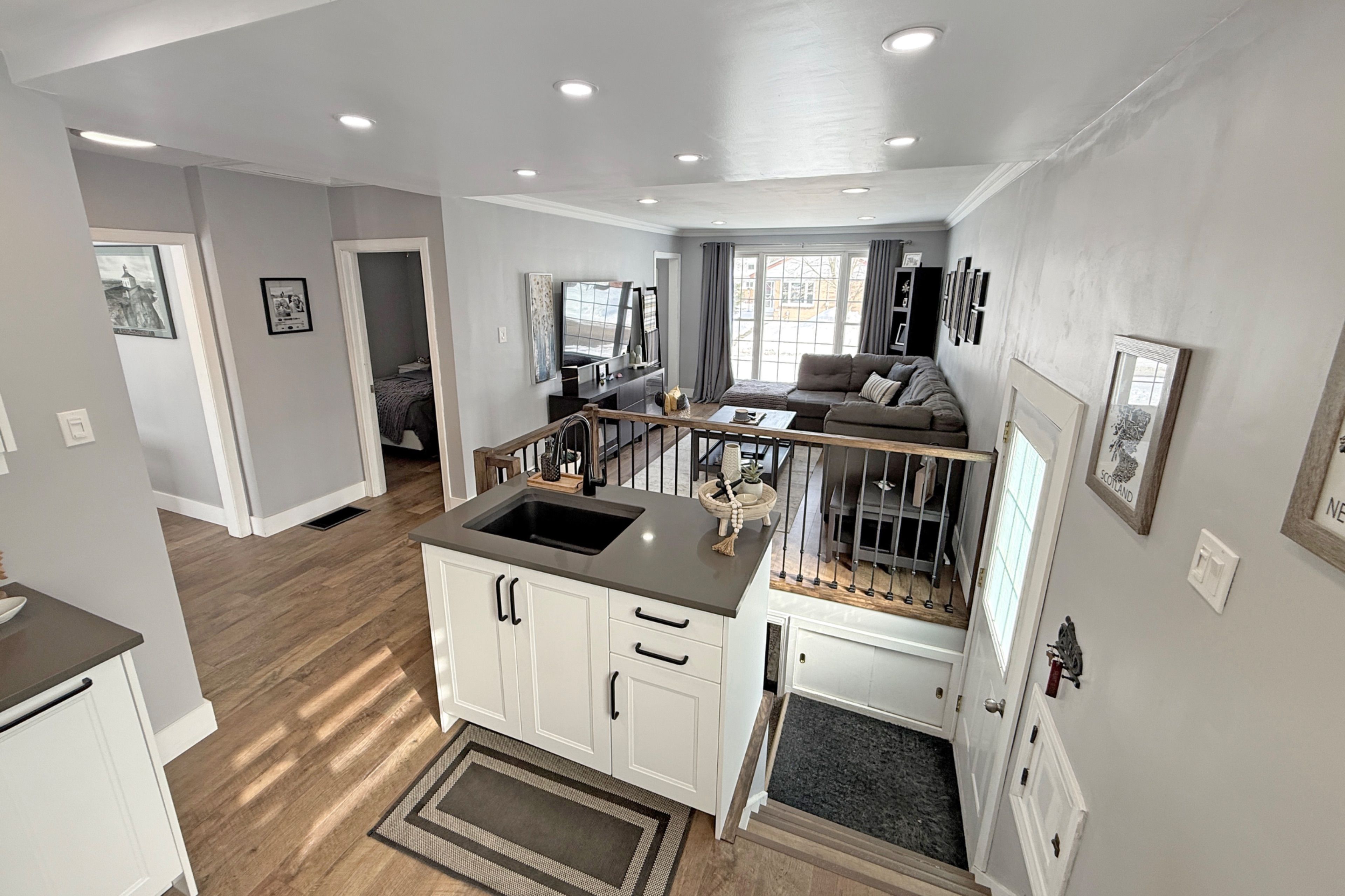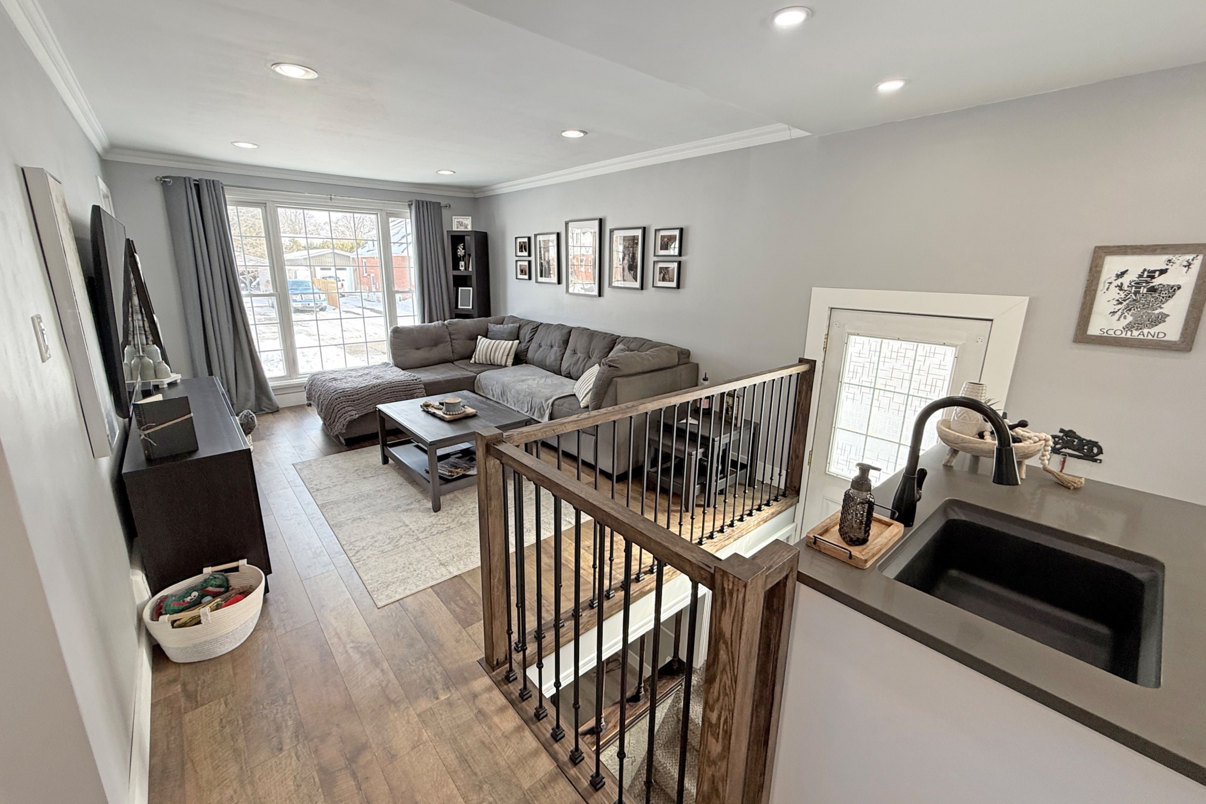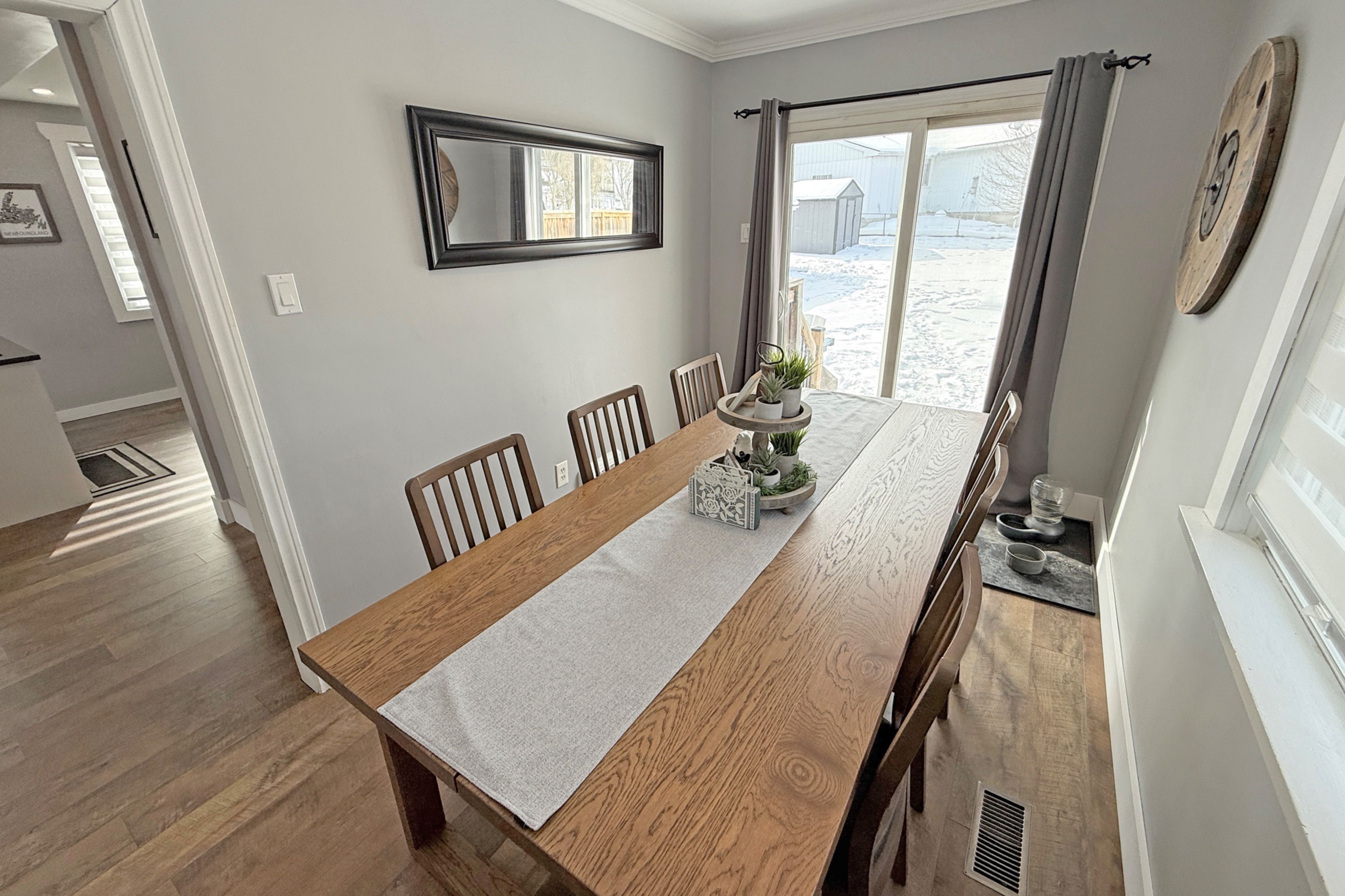 Immaculate two-bedroom bungalow on a quiet street with a large yard. This beautifully updated home features an open-concept layout ideal for entertaining, with a bright living room offering a large window for natural light. Living room flows into the updated kitchen with ample storage. There are two bedrooms on the main floor, with the second currently used as a dining room and featuring patio doors that lead to the back deck. The finished lower level includes a spacious family room perfect for movie nights or watching the game, along with an office, large utility/laundry room, and cold storage. A long driveway leads to the heated garage, and the fully fenced backyard offers a shed and plenty of space for gardening, kids, and pets. Recent updates include the porch (2021), house roof (2022), fence (2023), kitchen (2023), eavestroughs and downspouts (2023), garage door (2023), garage roof (2024), and a/c rental (2024).