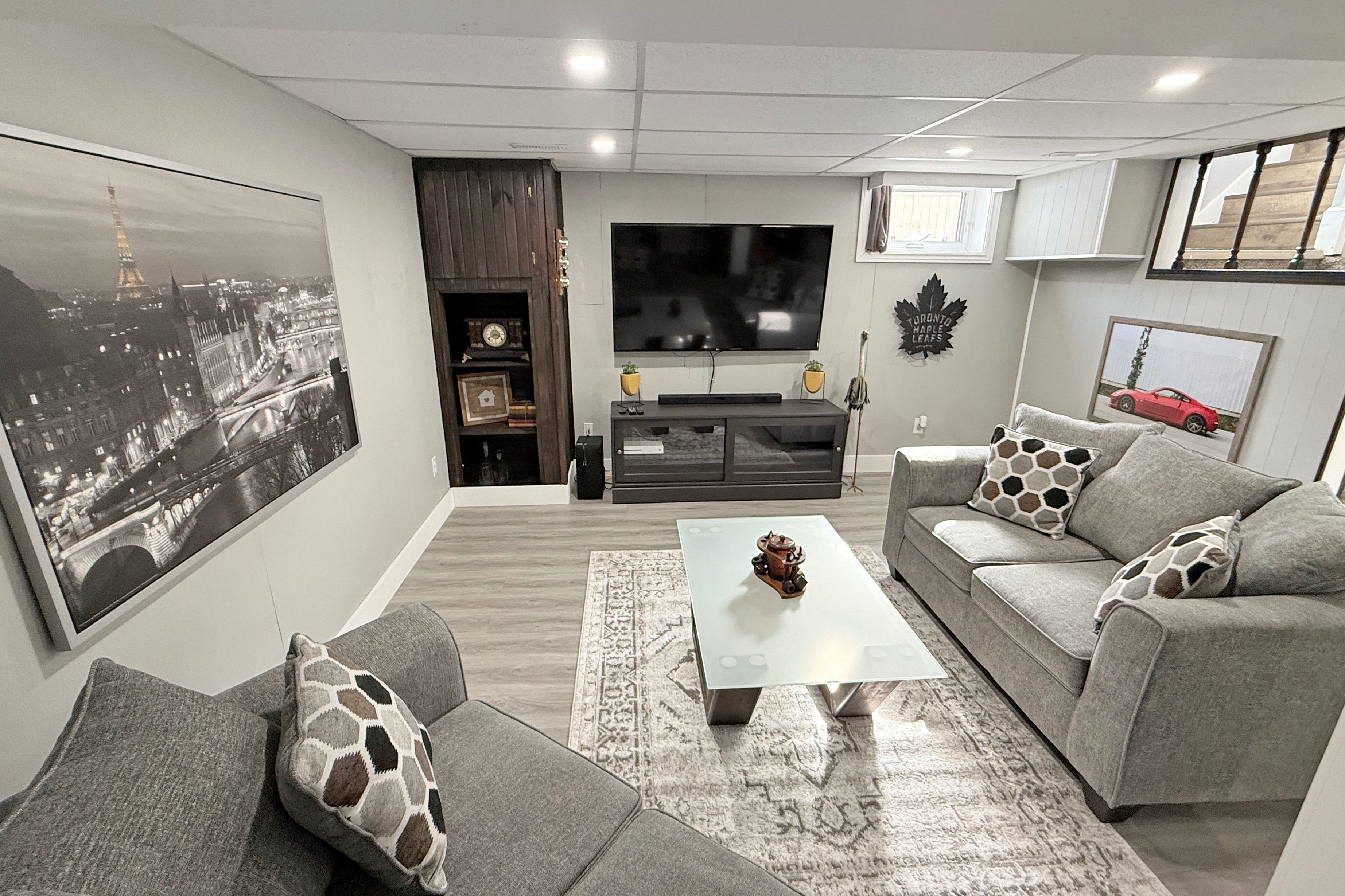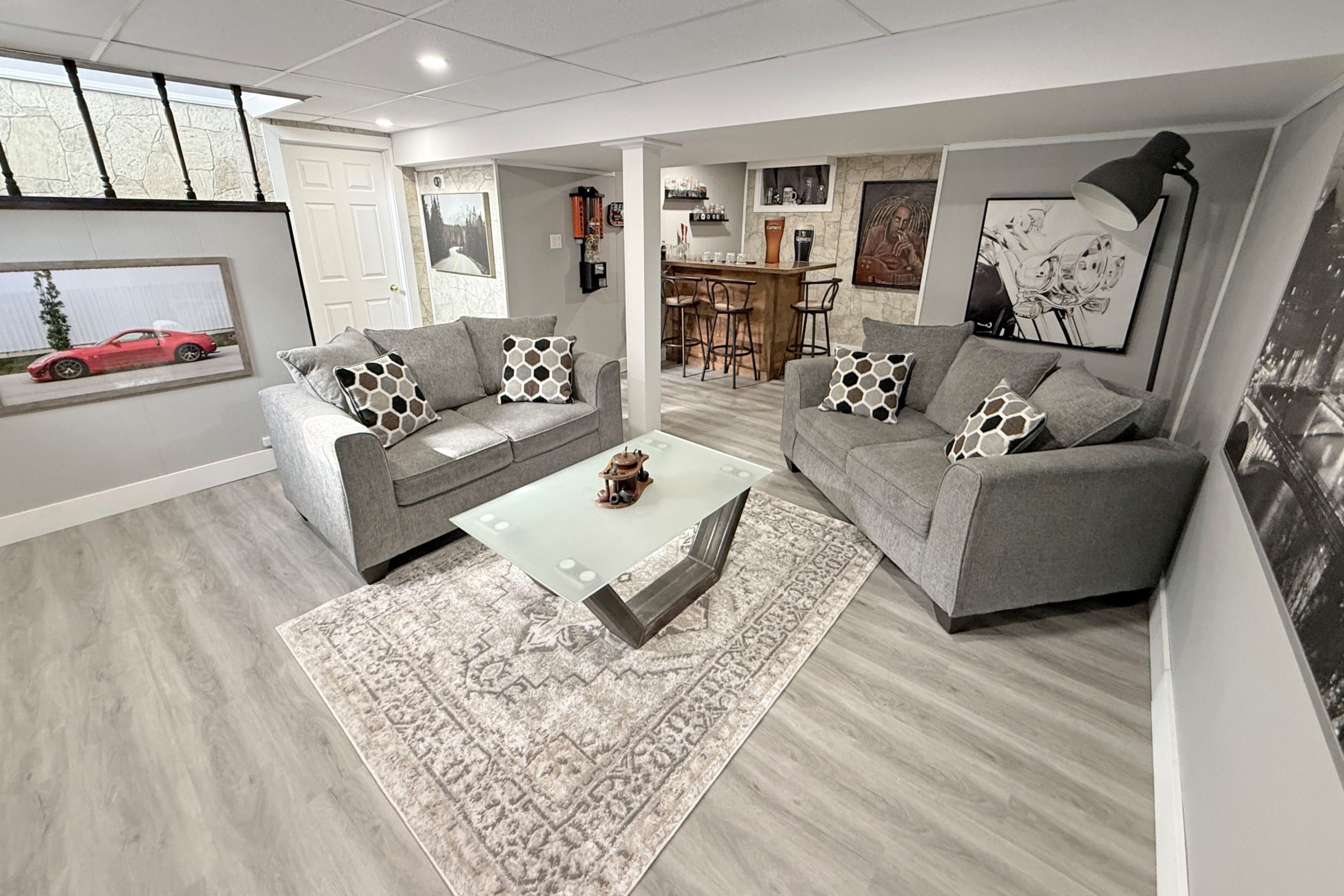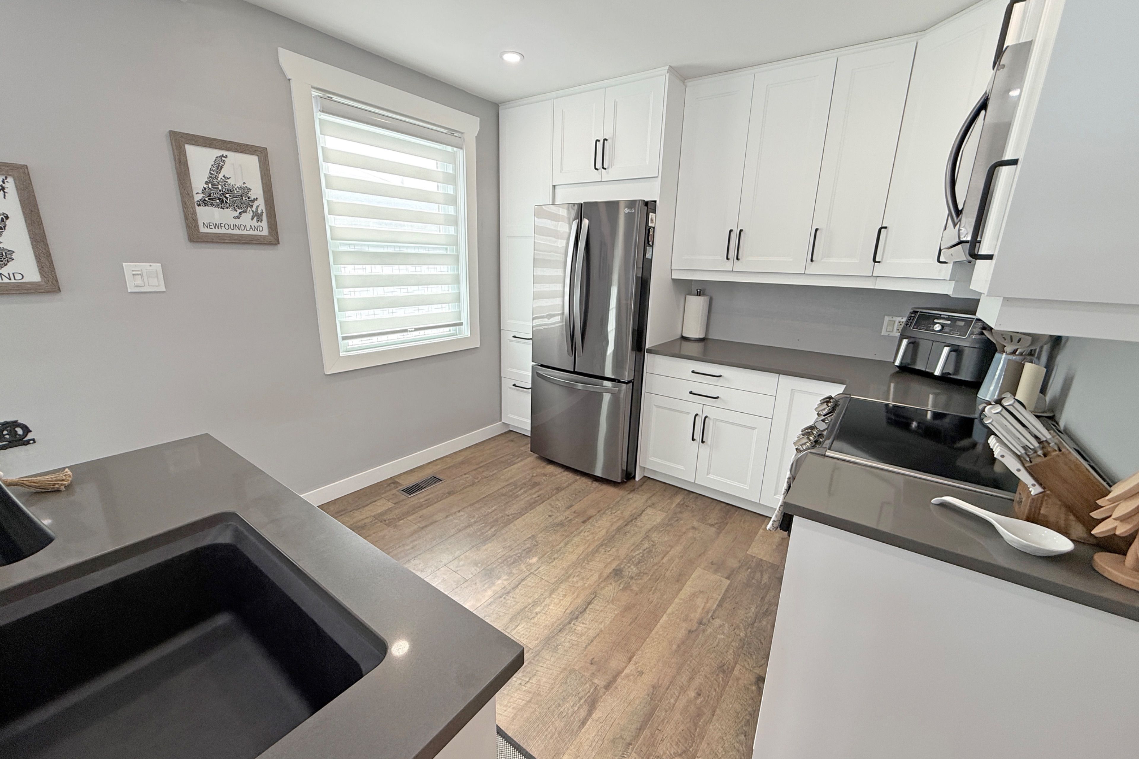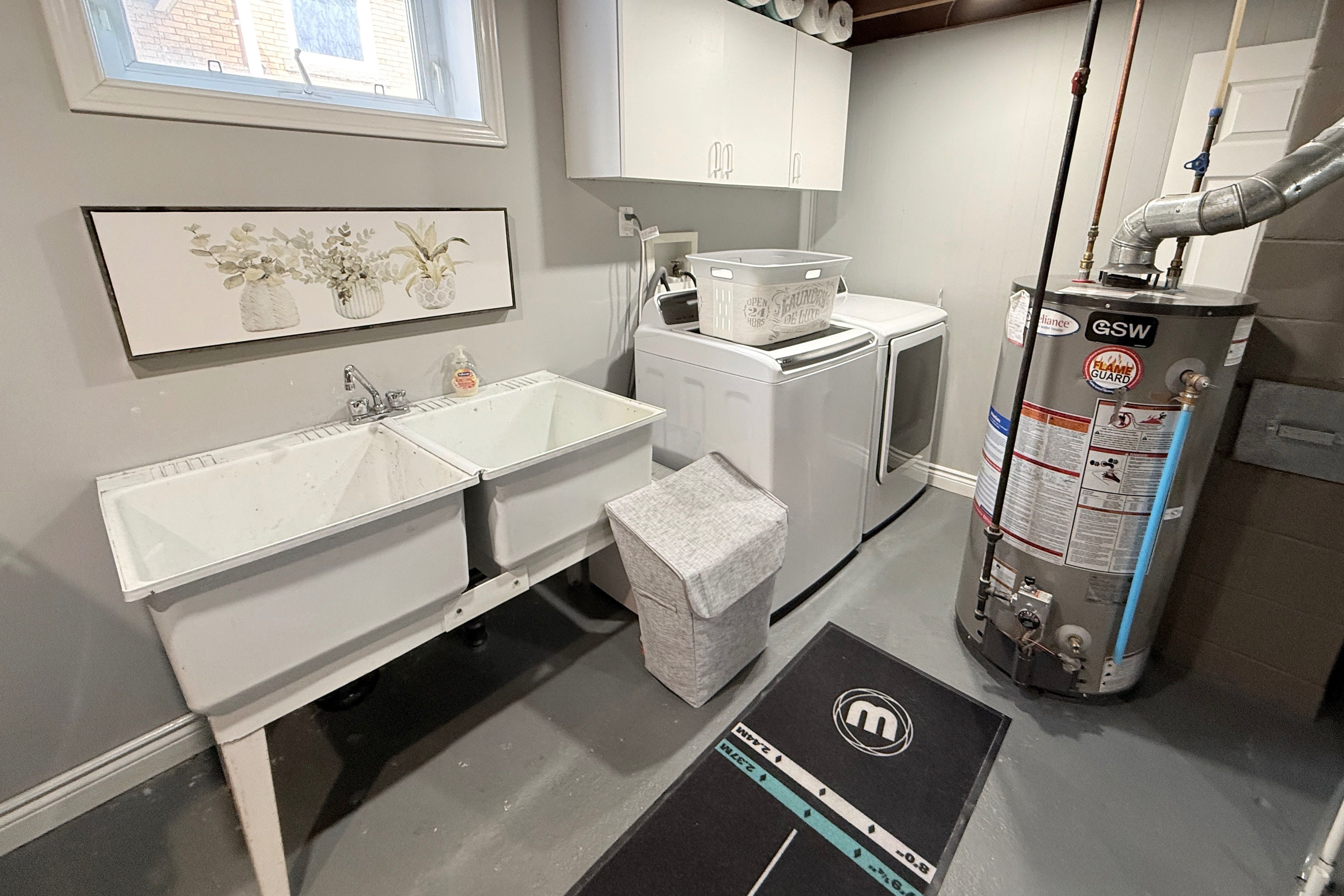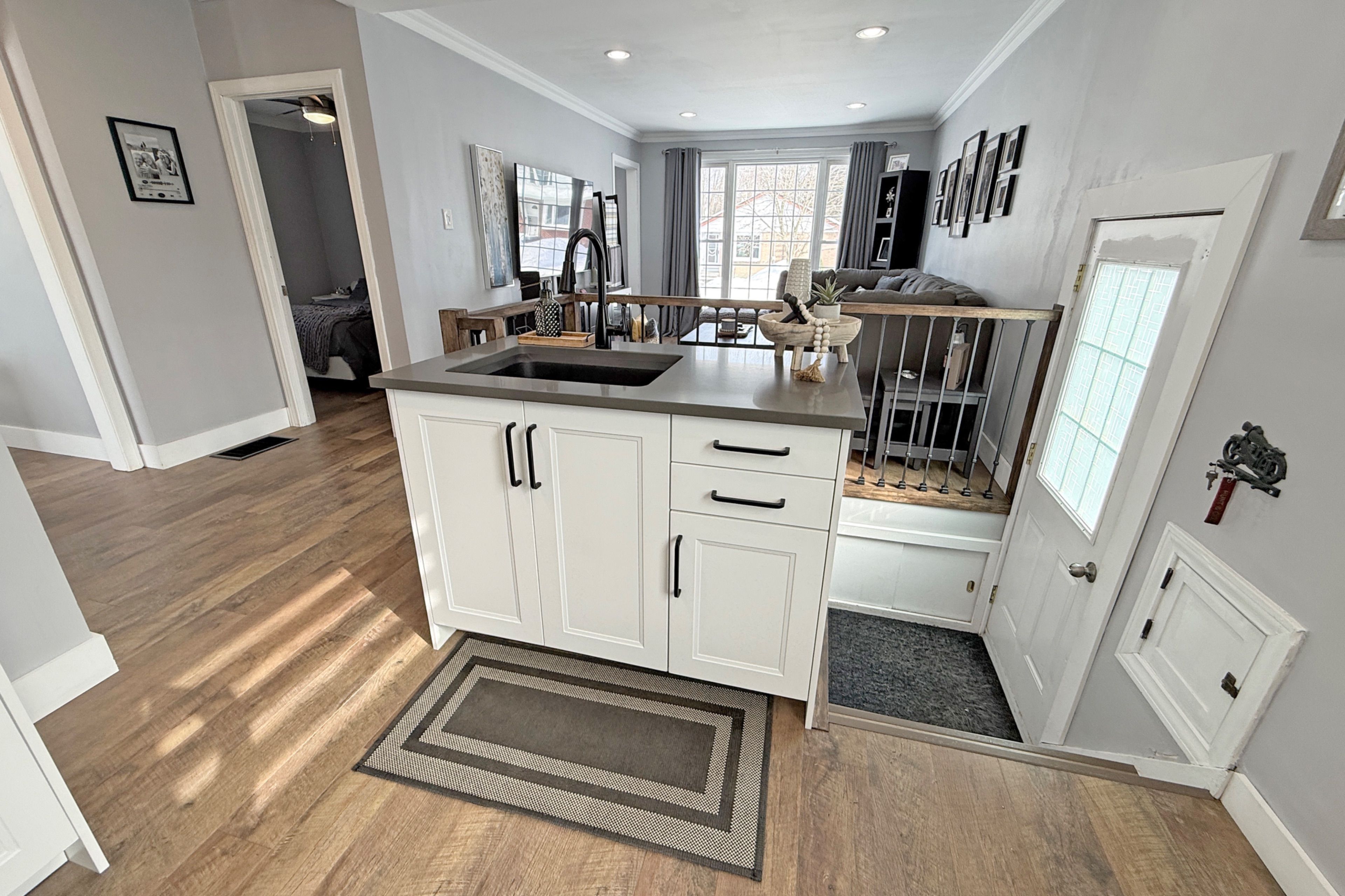 Immaculate two-bedroom bungalow on a quiet street with a large yard. This beautifully updated home features an open-concept layout ideal for entertaining, with a bright living room offering a large window for natural light. Living room flows into the updated kitchen with ample storage. There are two bedrooms on the main floor, with the second currently used as a dining room and featuring patio doors that lead to the back deck. The finished lower level includes a spacious family room perfect for movie nights or watching the game, along with an office, large utility/laundry room, and cold storage. A long driveway leads to the heated garage, and the fully fenced backyard offers a shed and plenty of space for gardening, kids, and pets. Recent updates include the porch (2021), house roof (2022), fence (2023), kitchen (2023), eavestroughs and downspouts (2023), garage door (2023), garage roof (2024), and a/c rental (2024).