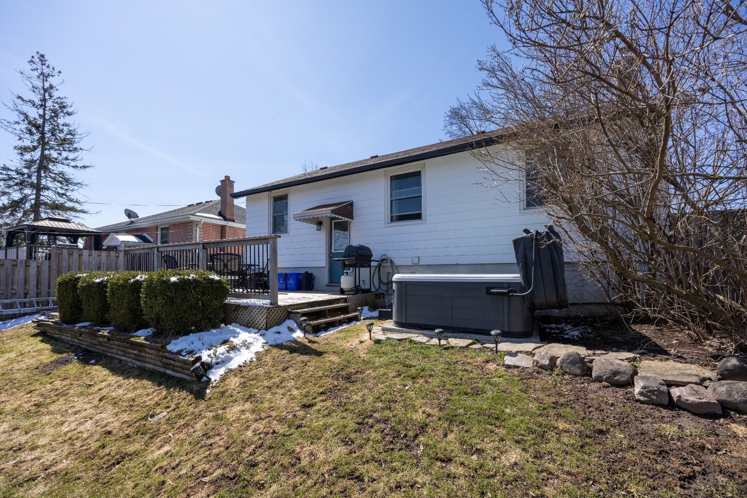 Welcome to 814 downie street located in a desired family friendly peterborough neighborhood. This home offers many updates including a beautifully renovated kitchen newer stainless appliances, glass accents to upper cabinets. New vinyl flooring throughout the main level, newer bay window in the living room allows natural light to flood indoors. Three bedrooms and full 4pc bathroom. The basement allows for additional living space or in law potential, finished rec room combined with a kitchenette area, bedroom, and full 4pc bathroom, separate side entrance. Relax at the end of the day in the hot tub while entertaining on the deck. Privately fenced yard. Wide driveway provides extra parking paved in 2021. This home is perfect for first time home buyer or retirees looking to downsize.