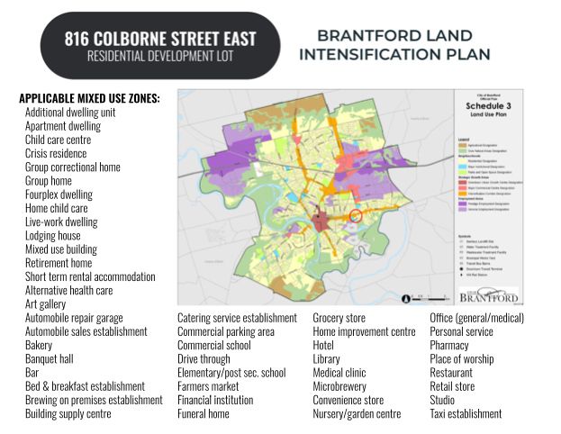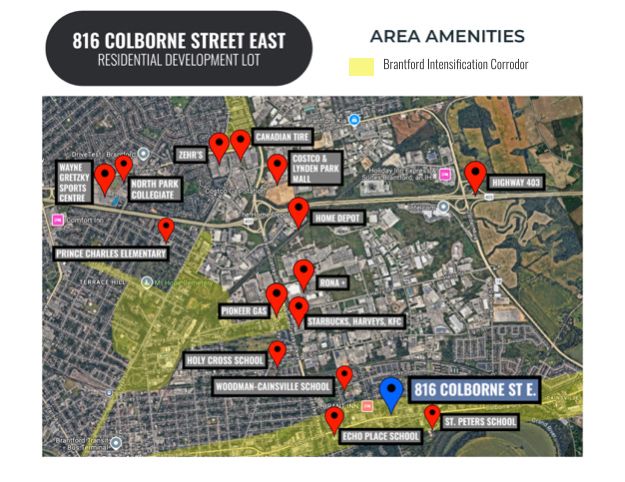 Attention developers! Welcome to 816 colborne street, brantford! Nestled in the desirable and family-friendly echo place neighbourhood, this property offers the perfect blend of convenience and potential. Situated on an impressive lot measuring approximately 43. 86ft x 90. 63ft x 451. 59ft x 94. 71ft x 407. 48ft, this residential gem is part of brantford's intensification corridor, providing excellent opportunities for future growth. Under the new zoning by-laws with the city of brantford, the lot will accommodate a total buildable footprint of 10,167 square feet, with a height of 38 meters. Amenities abound with shopping centres, big-box stores, and a variety of restaurants just moments away along wayne gretzky parkway and colborne street. In proximity to schools and parks, as well as easy access to highway 403! Serviced by the grand erie district school board and the brant haldimand norfolk catholic district school board, this property perfectly suits future families seeking a community atmosphere.