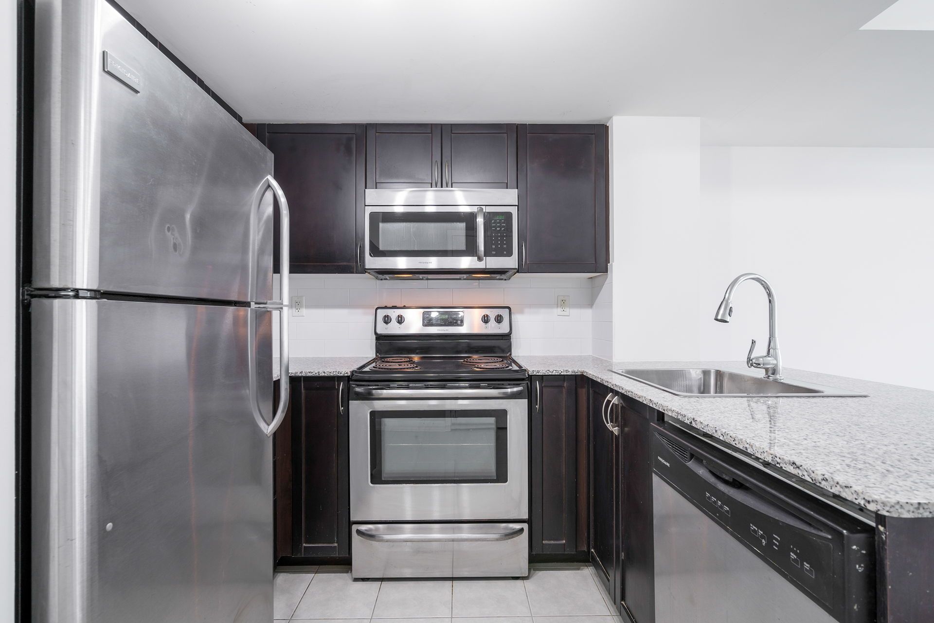 • Modern kitchen featuring granite countertops and breakfast bar for casual dining.