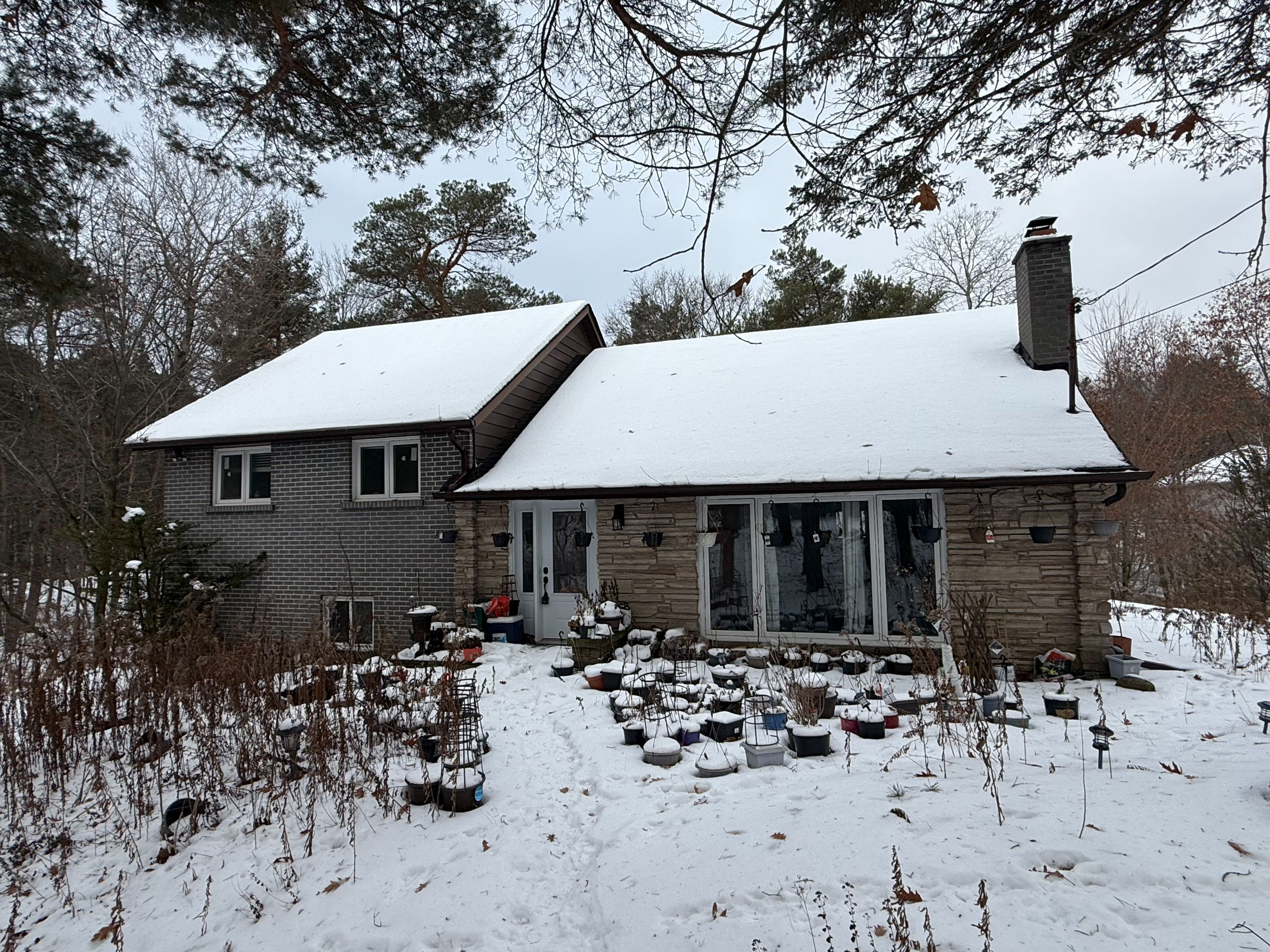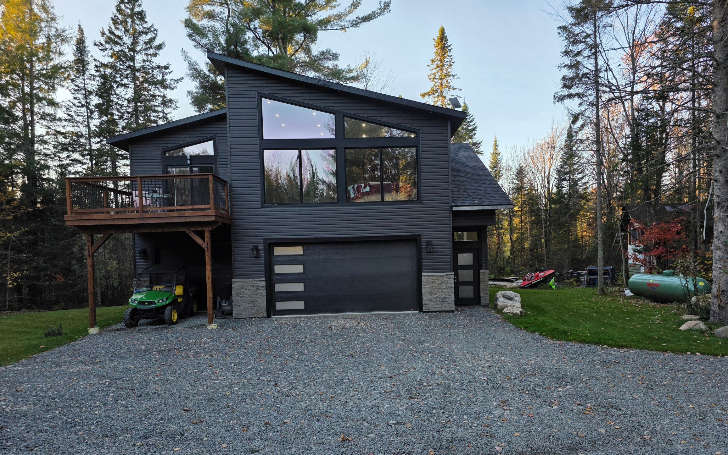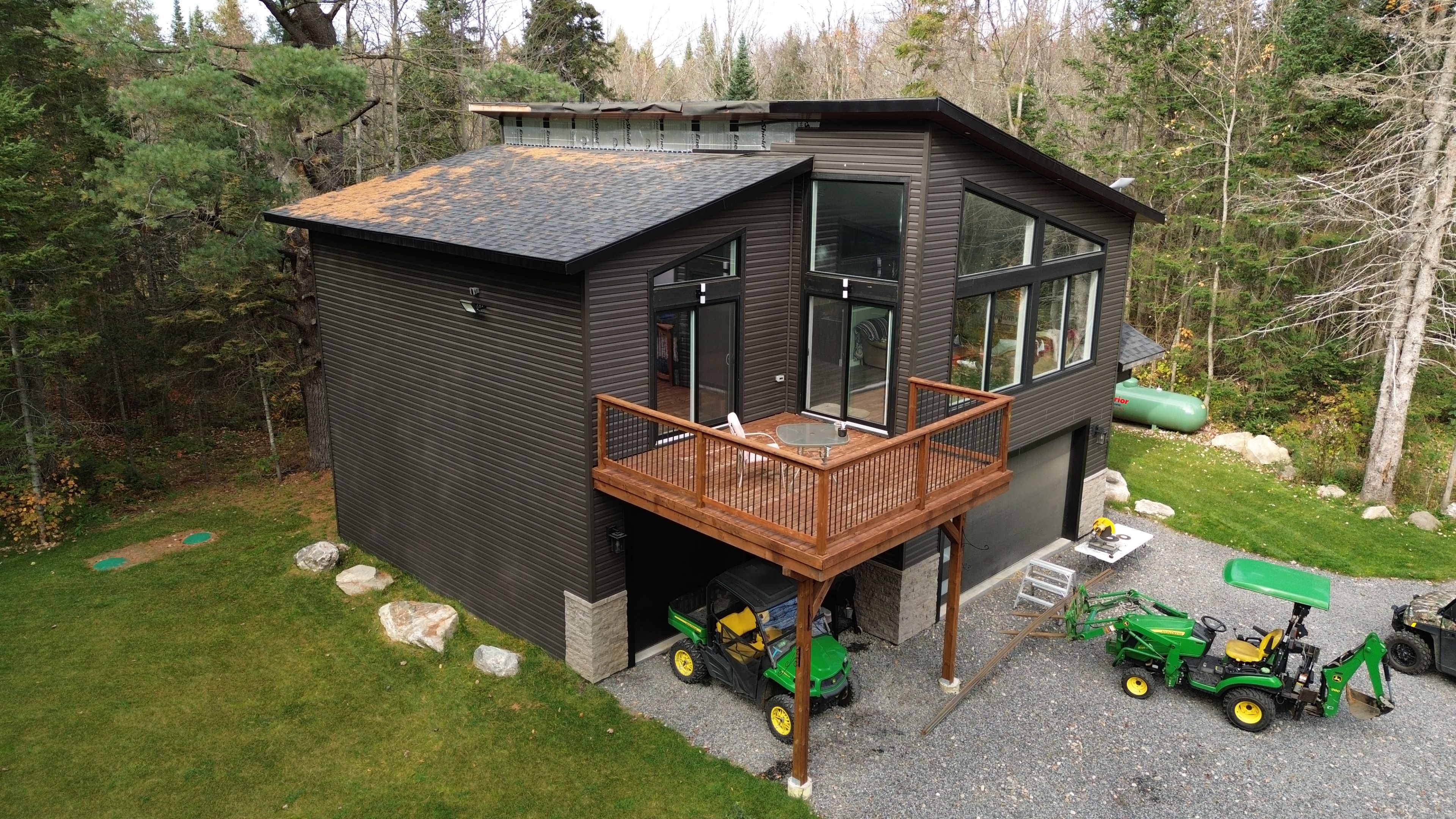 Built in 2023, this beautifully crafted home blends contemporary design with the peaceful charm of a forest setting. Nestled among the trees on a private one-acre lot, it offers the perfect balance of comfort, style, and practicality just 30 minutes from huntsville. Step inside to an inviting open-concept living space featuring soaring cathedral ceilings, energy-efficient pot lighting, and large windows that frame tranquil views of nature. The kitchen is a chefs dream, equipped with a professional wolf range and generous counter space for entertaining or everyday cooking. With two spacious bedrooms and two full bathrooms, each with its own large walk-in shower, the layout combines functionality with luxury. An extra-wide staircase easily accommodates a chair-lift, ensuring accessibility for all. The home's thoughtful features continue with a huge three-car garage, complete with in-floor heating, battery-backup garage door openers that can be operated remotely, and a full generac generator for peace of mind. The main living level is warmed by efficient forced-air heating and air conditioning can be easily added for year-round comfort. Enjoy morning coffee or evening sunsets from the expansive decks at both the front and rear, surrounded by the quiet beauty of the forest. If you've been searching for a modern, energy-smart home with privacy, practicality, and just the right touch of luxury - this one checks every box. Bonus: part of the garage can be converted into an inlaw suite (roughed in)! This property is ideal for those who are interested in the outdoors. It is across from the ofc d trail and atv trail.