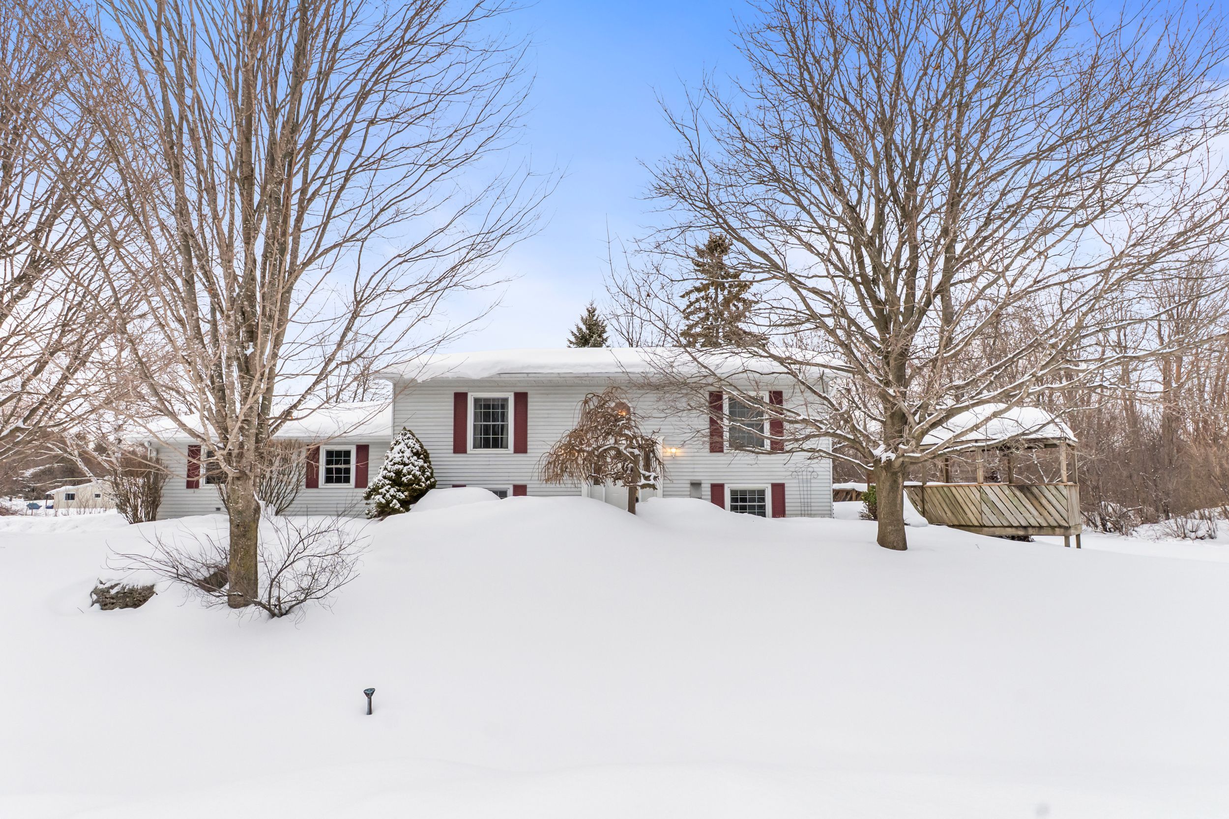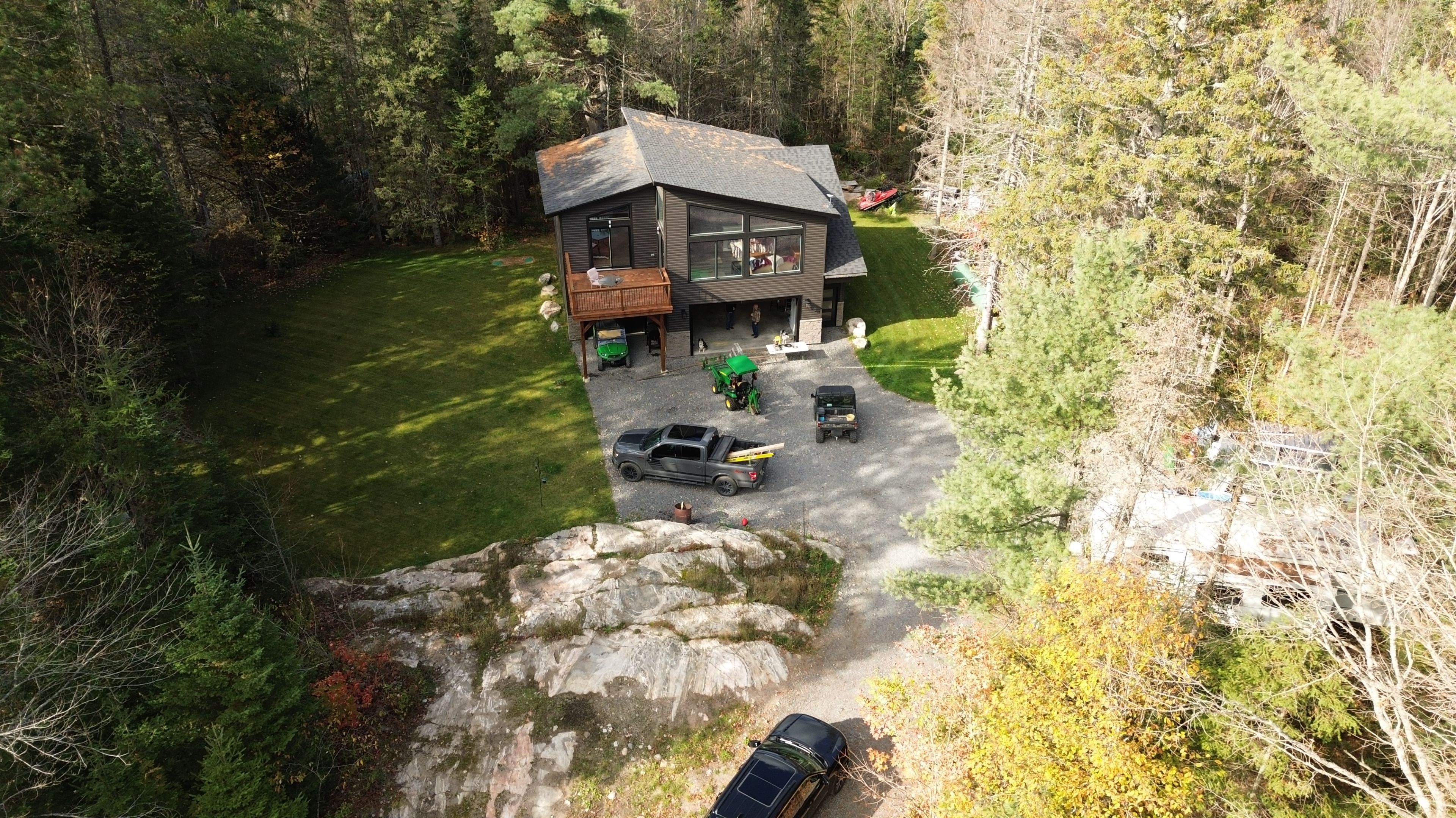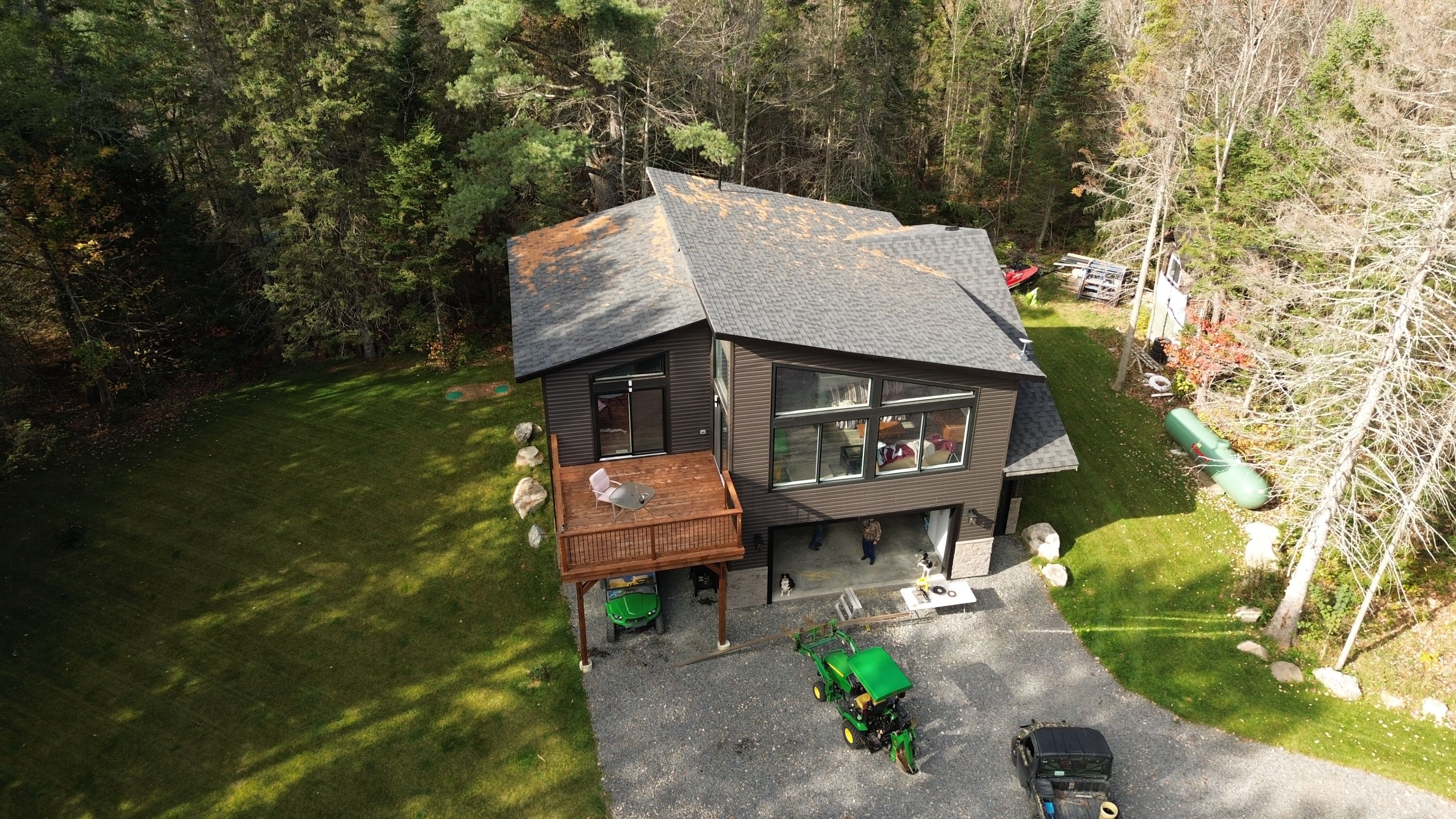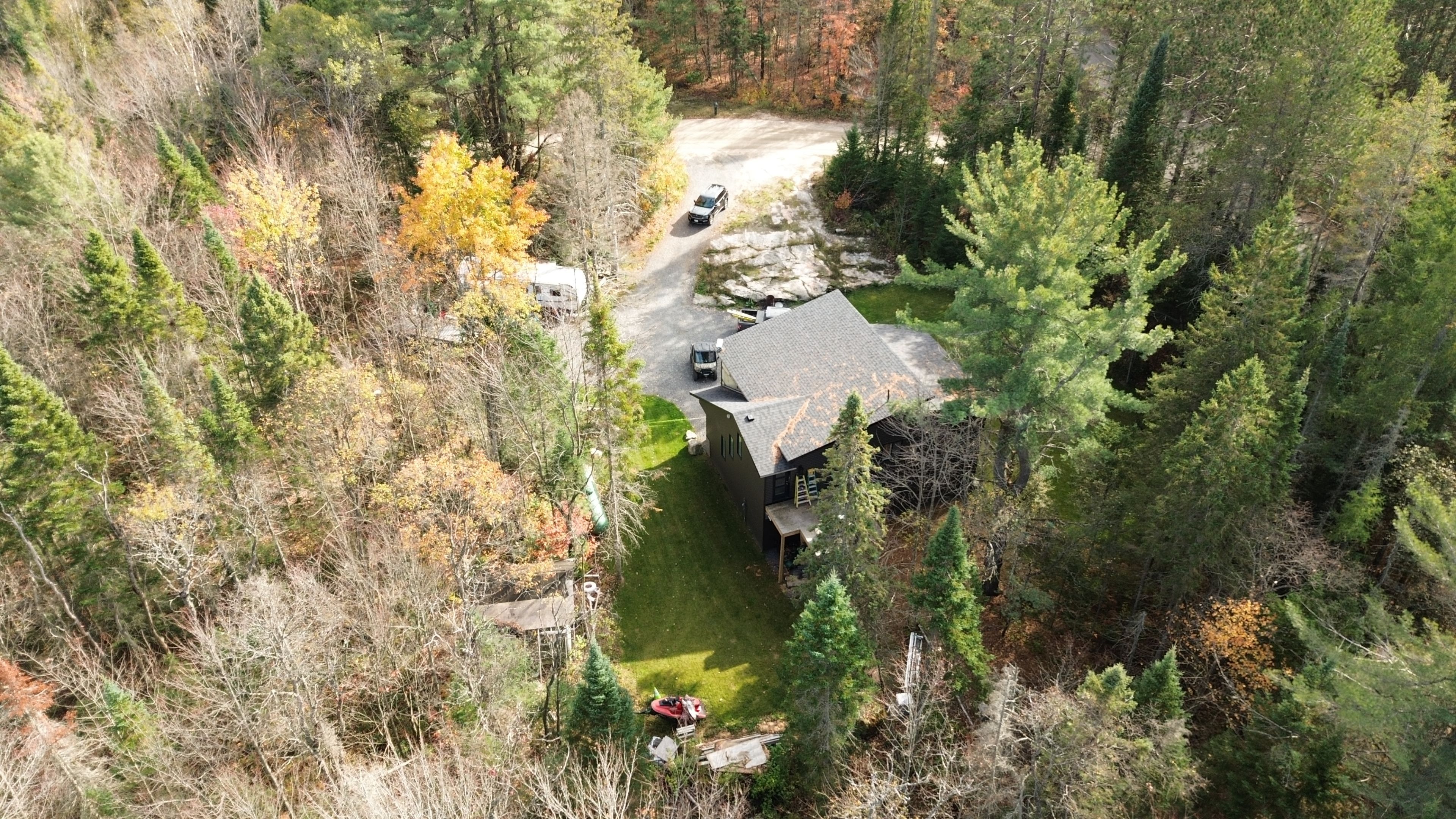 Built in 2023, this beautifully crafted home blends contemporary design with the peaceful charm of a forest setting. Nestled among the trees on a private one-acre lot, it offers the perfect balance of comfort, style, and practicality just 30 minutes from huntsville. Step inside to an inviting open-concept living space featuring soaring cathedral ceilings, energy-efficient pot lighting, and large windows that frame tranquil views of nature. The kitchen is a chefs dream, equipped with a professional wolf range and generous counter space for entertaining or everyday cooking. With two spacious bedrooms and two full bathrooms, each with its own large walk-in shower, the layout combines functionality with luxury. An extra-wide staircase easily accommodates a chair-lift, ensuring accessibility for all. The home's thoughtful features continue with a huge three-car garage, complete with in-floor heating, battery-backup garage door openers that can be operated remotely, and a full generac generator for peace of mind. The main living level is warmed by efficient forced-air heating and air conditioning can be easily added for year-round comfort. Enjoy morning coffee or evening sunsets from the expansive decks at both the front and rear, surrounded by the quiet beauty of the forest. If you've been searching for a modern, energy-smart home with privacy, practicality, and just the right touch of luxury - this one checks every box. Bonus: part of the garage can be converted into an inlaw suite (roughed in)! This property is ideal for those who are interested in the outdoors. It is across from the ofc d trail and atv trail.