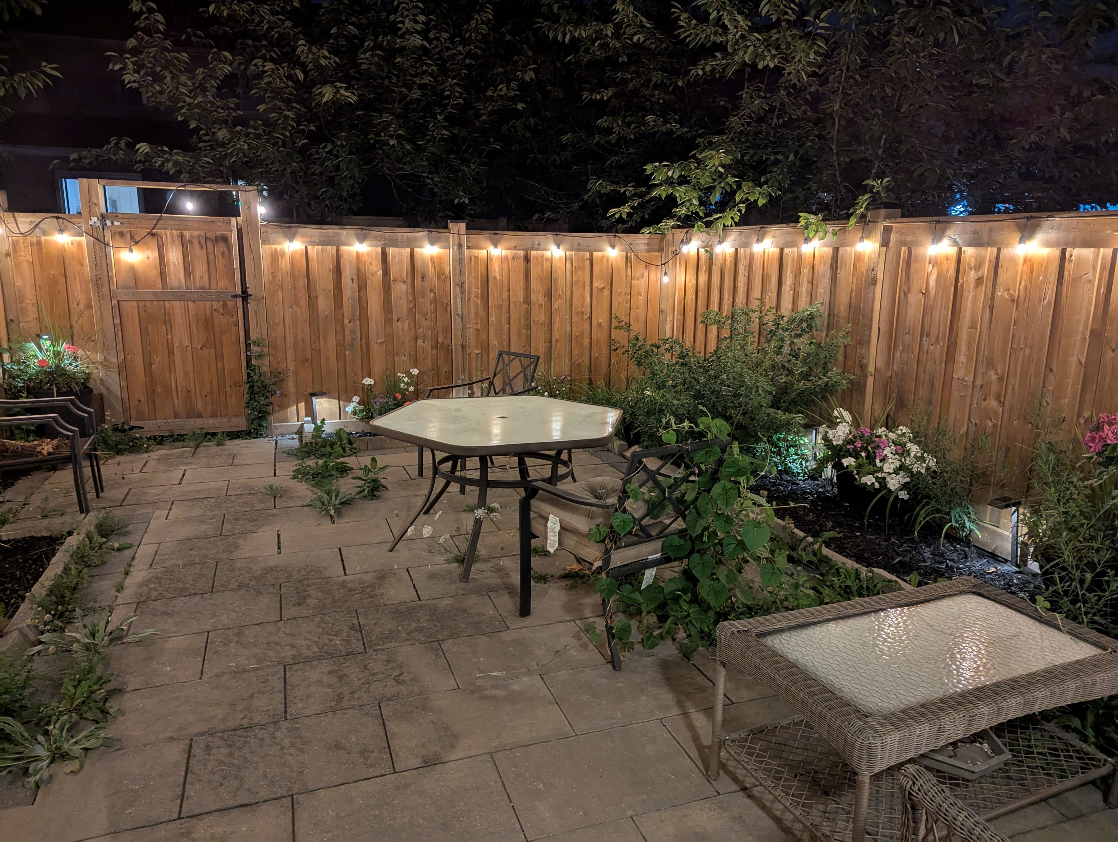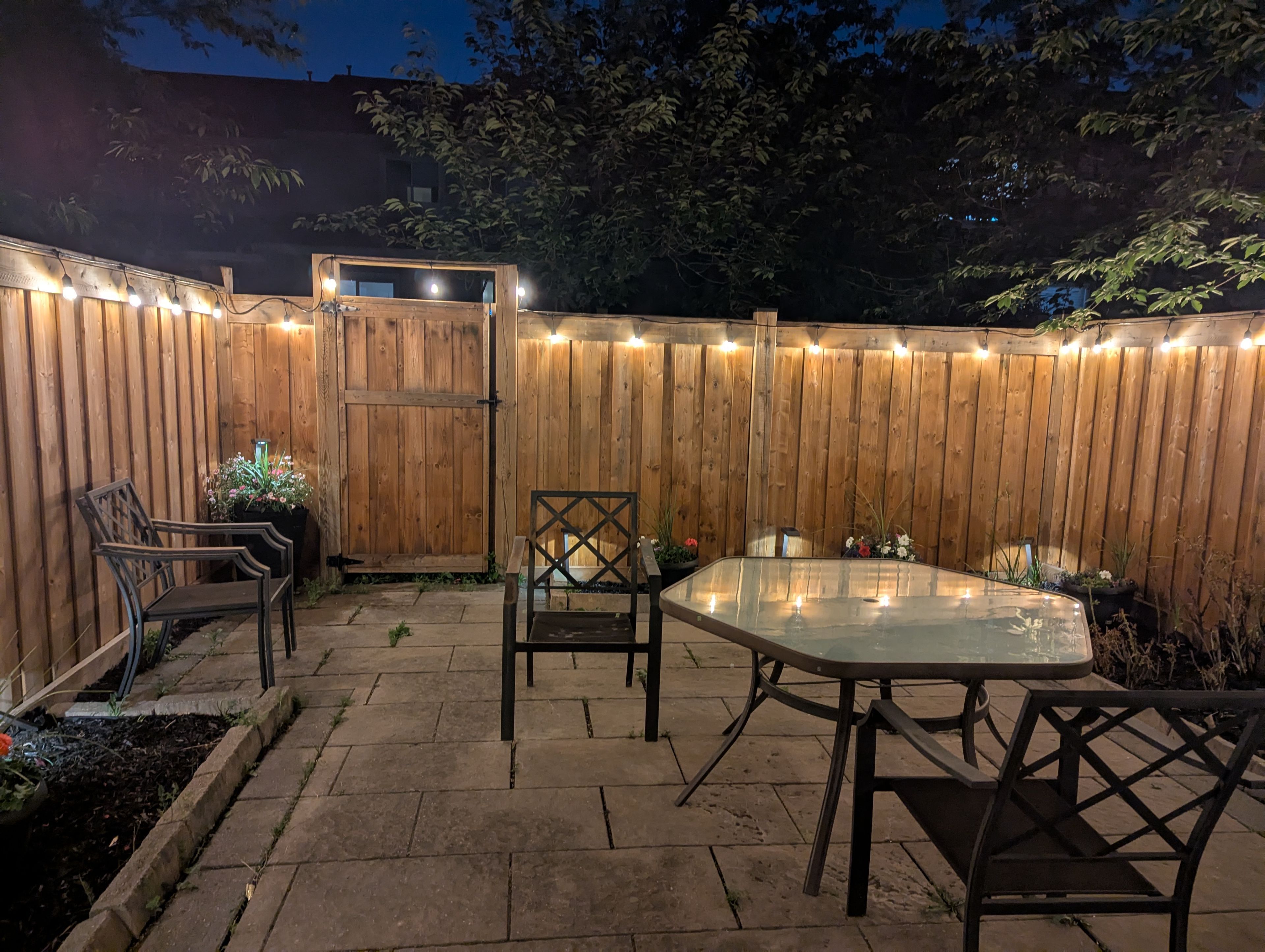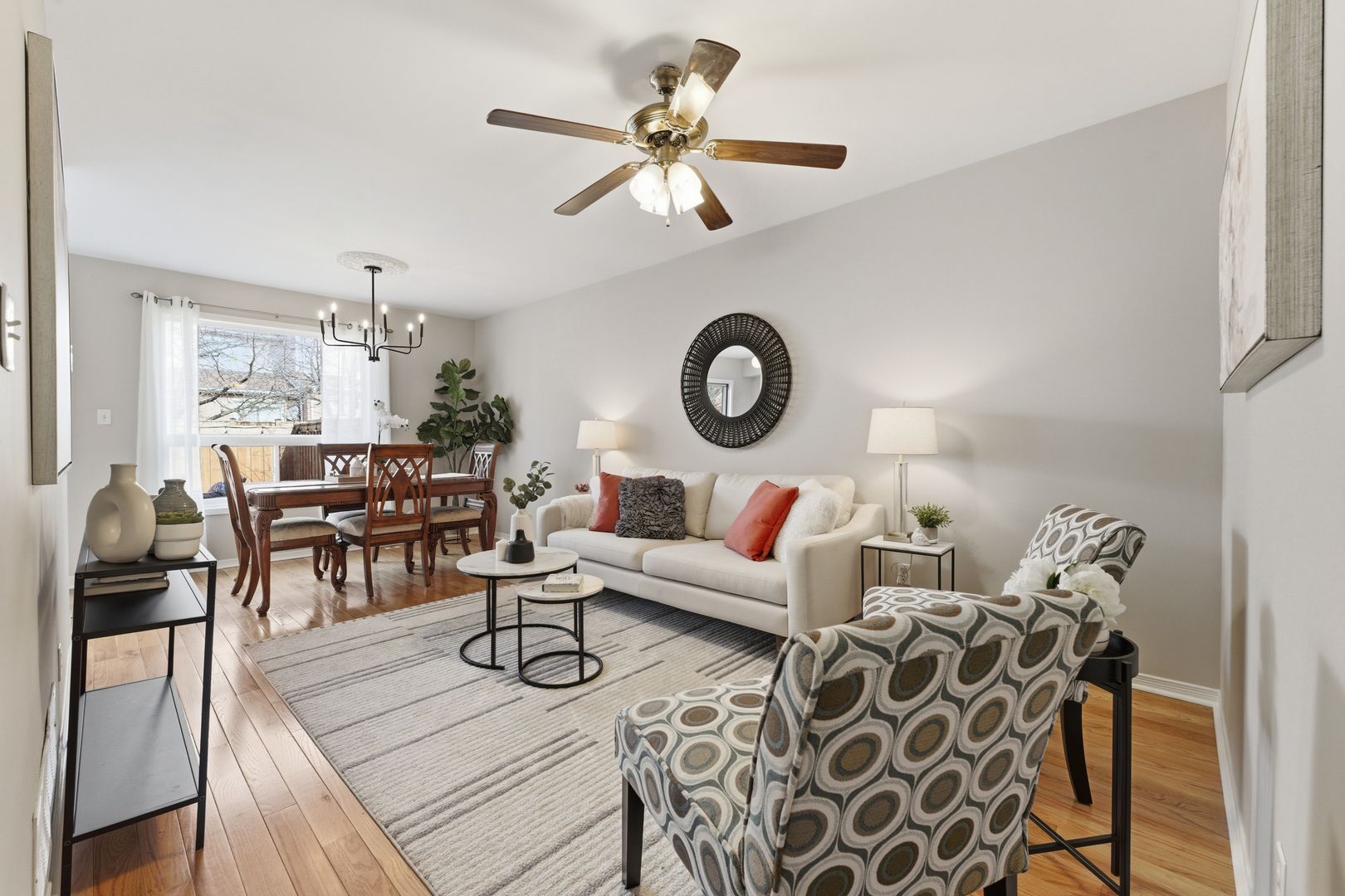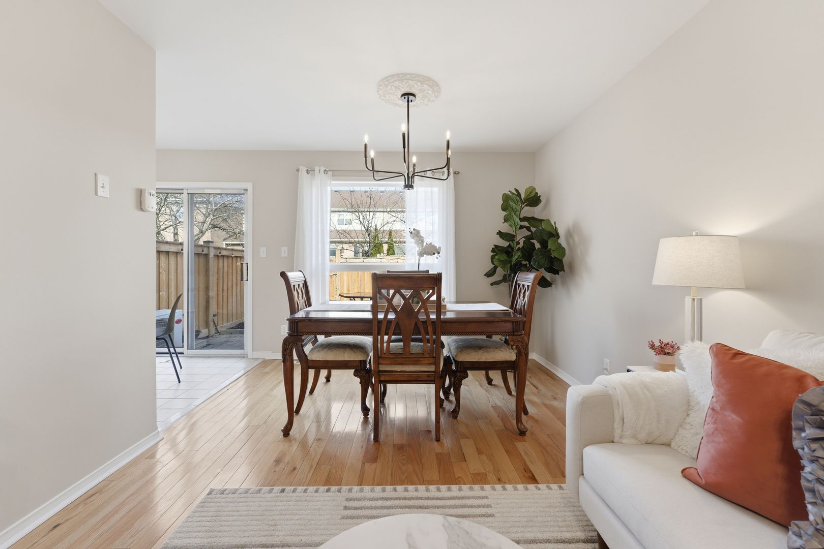 • Open concept living and dining area with a view of the private backyard.