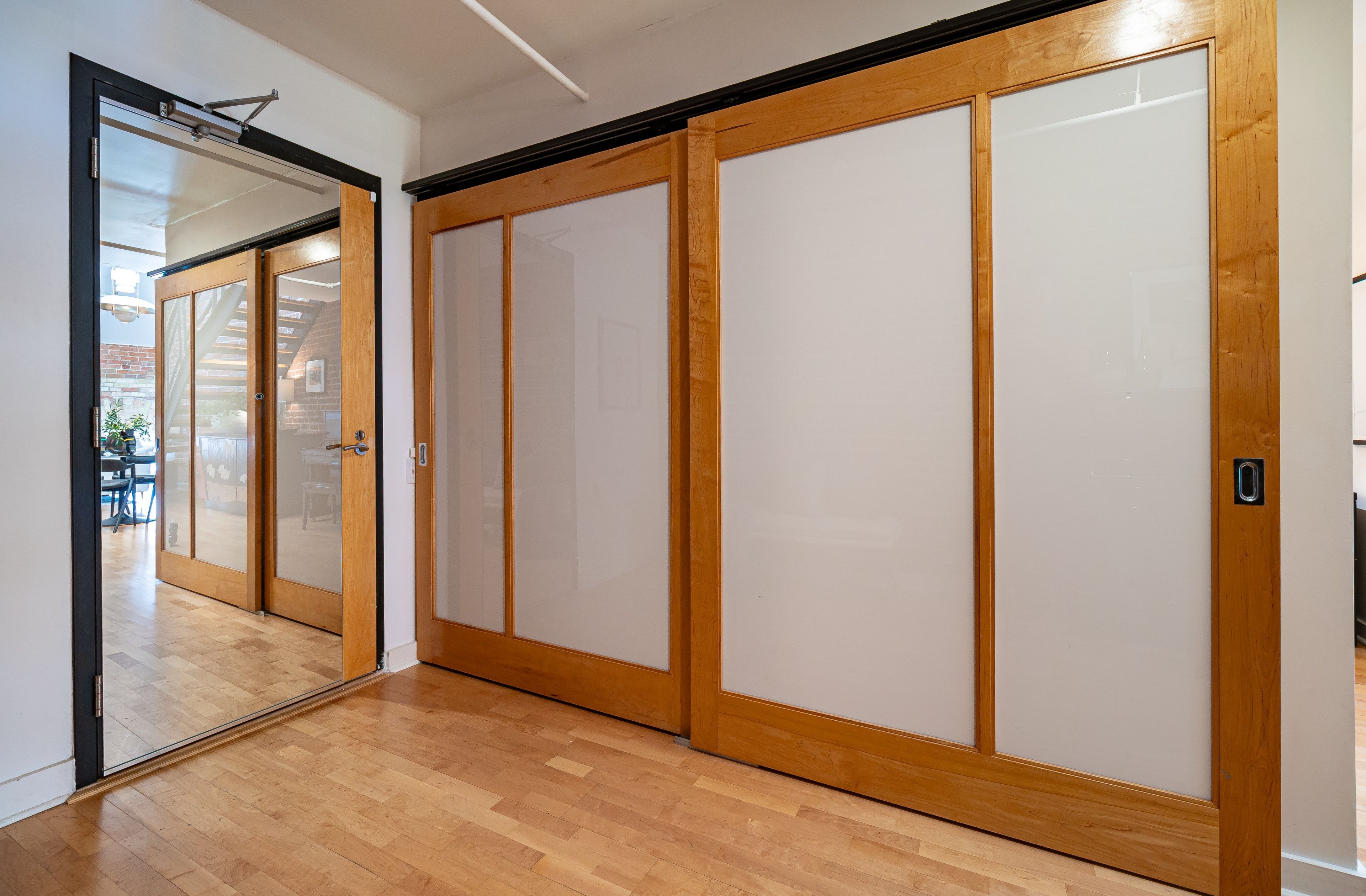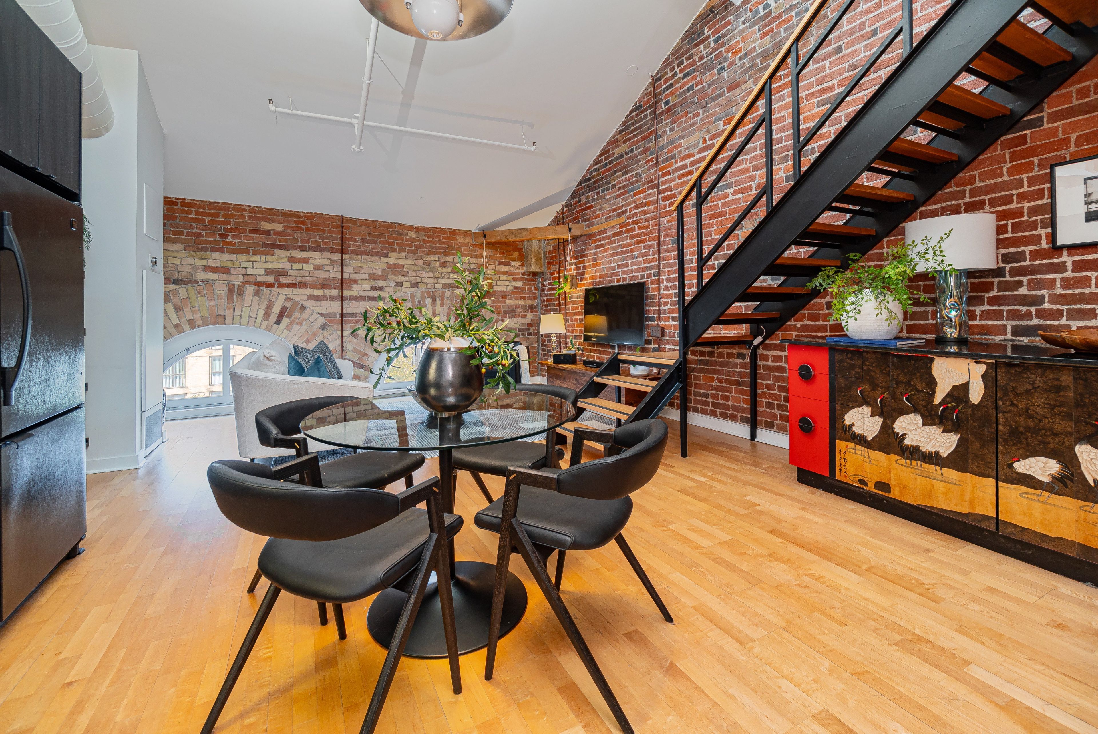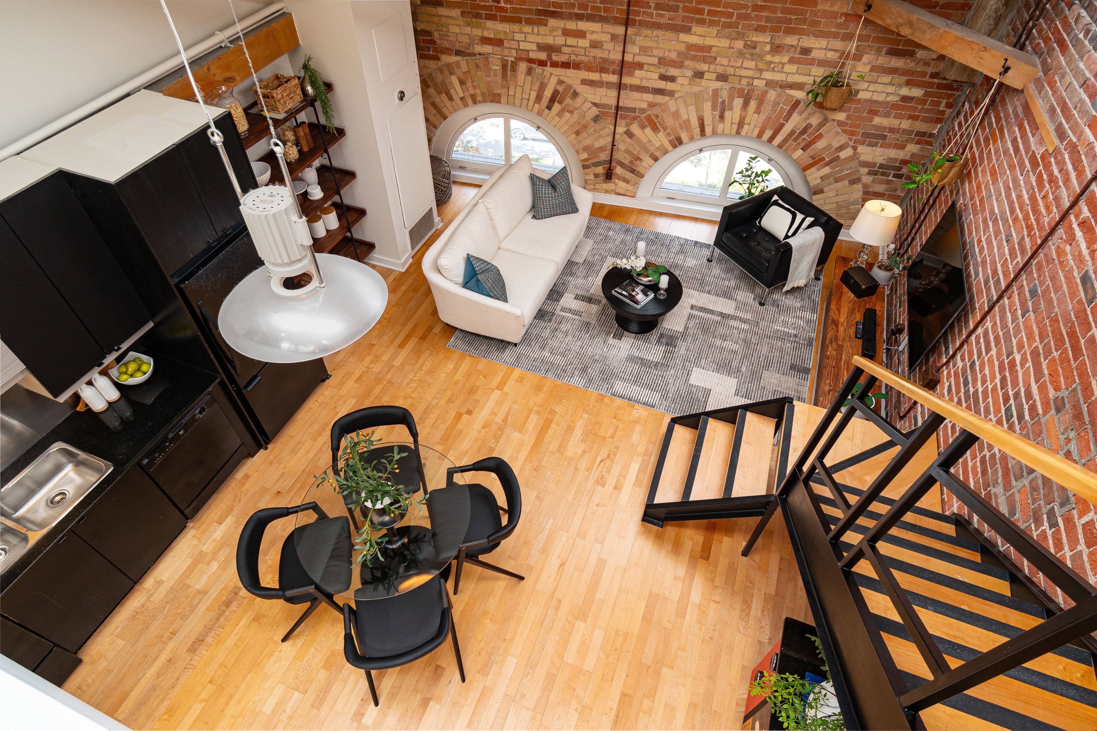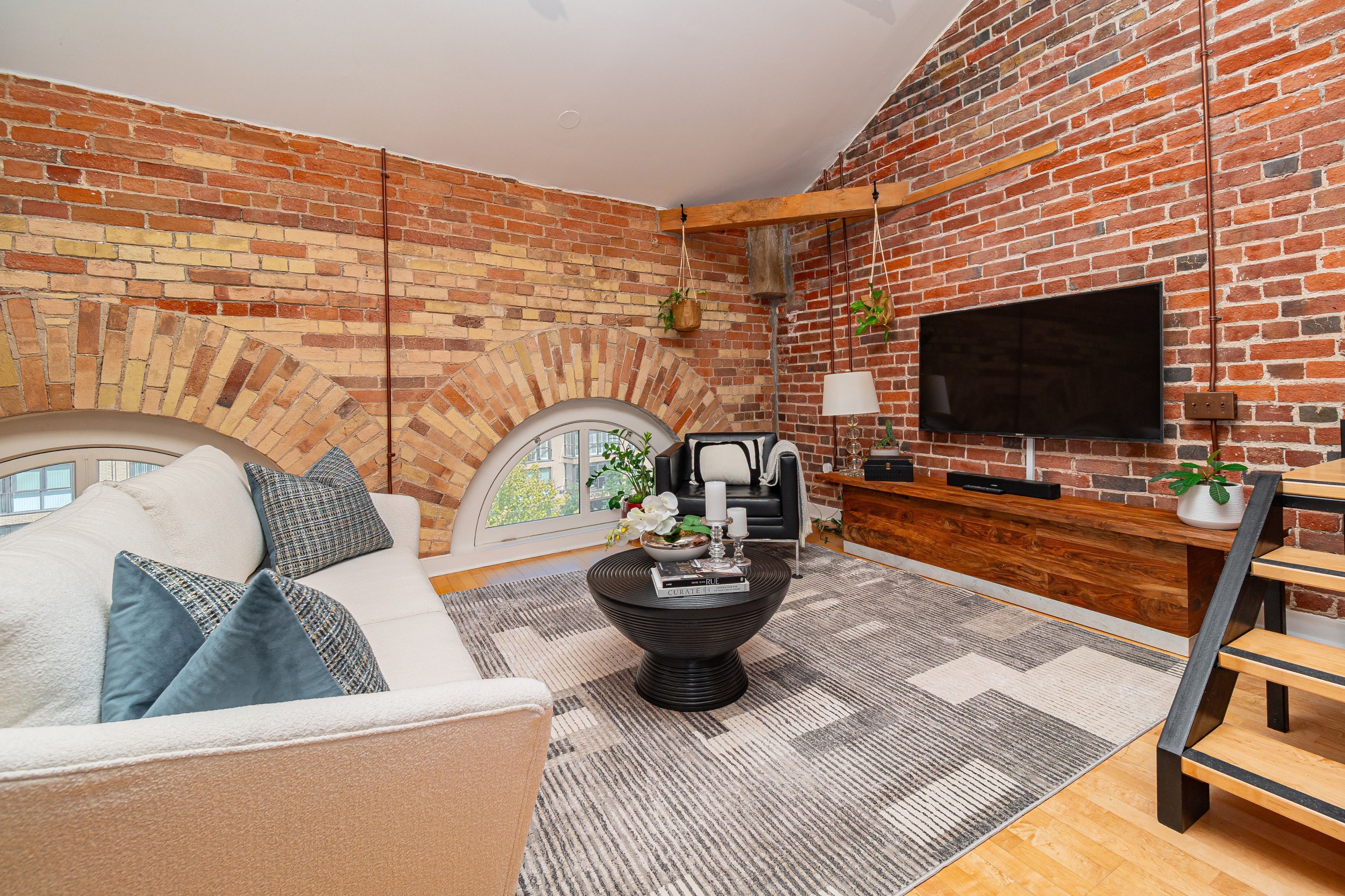 • Soaring ceilings with skylights and exposed brick for character.