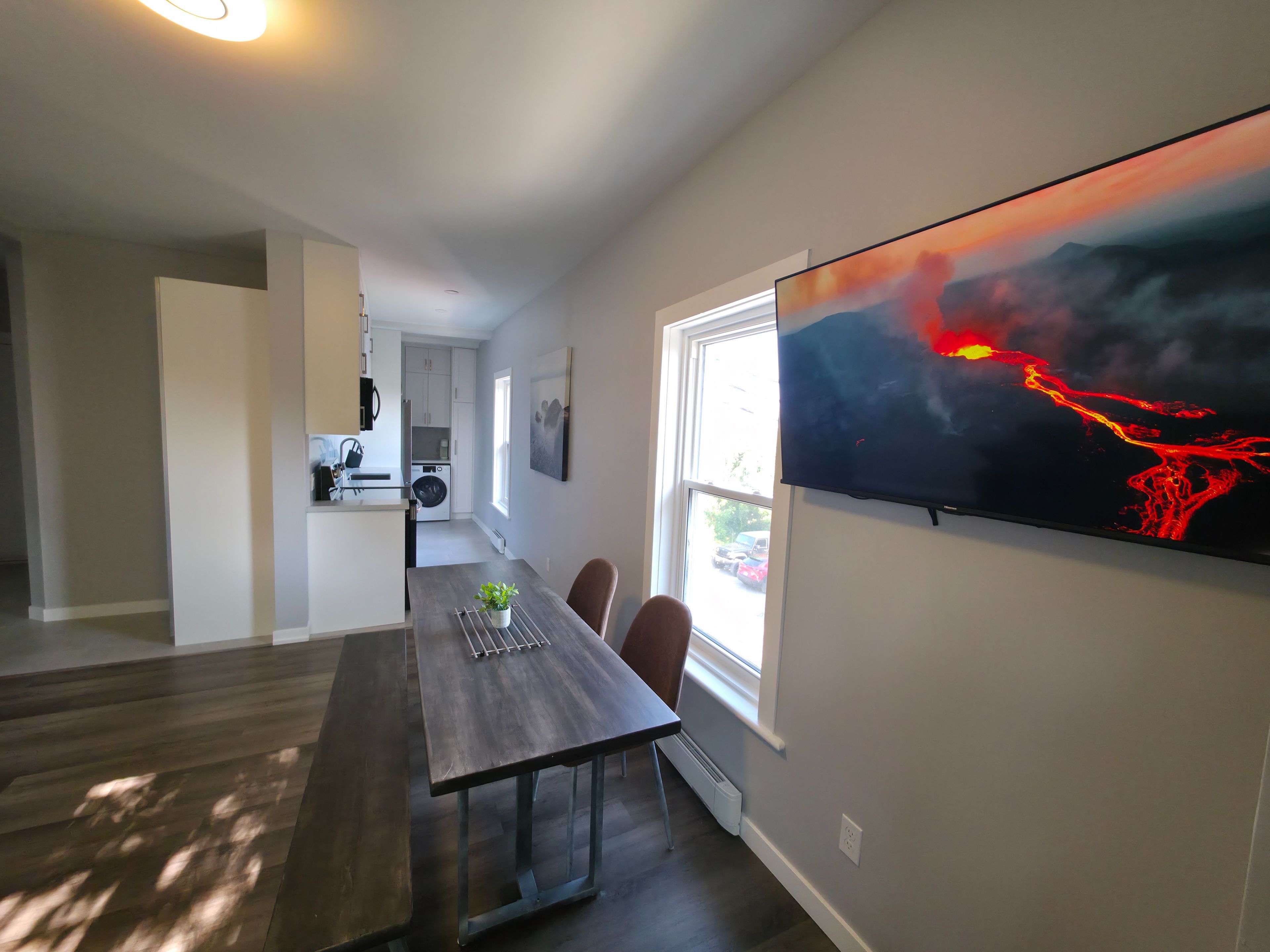 • Wall-mounted smart TV with Netflix and Prime included.
