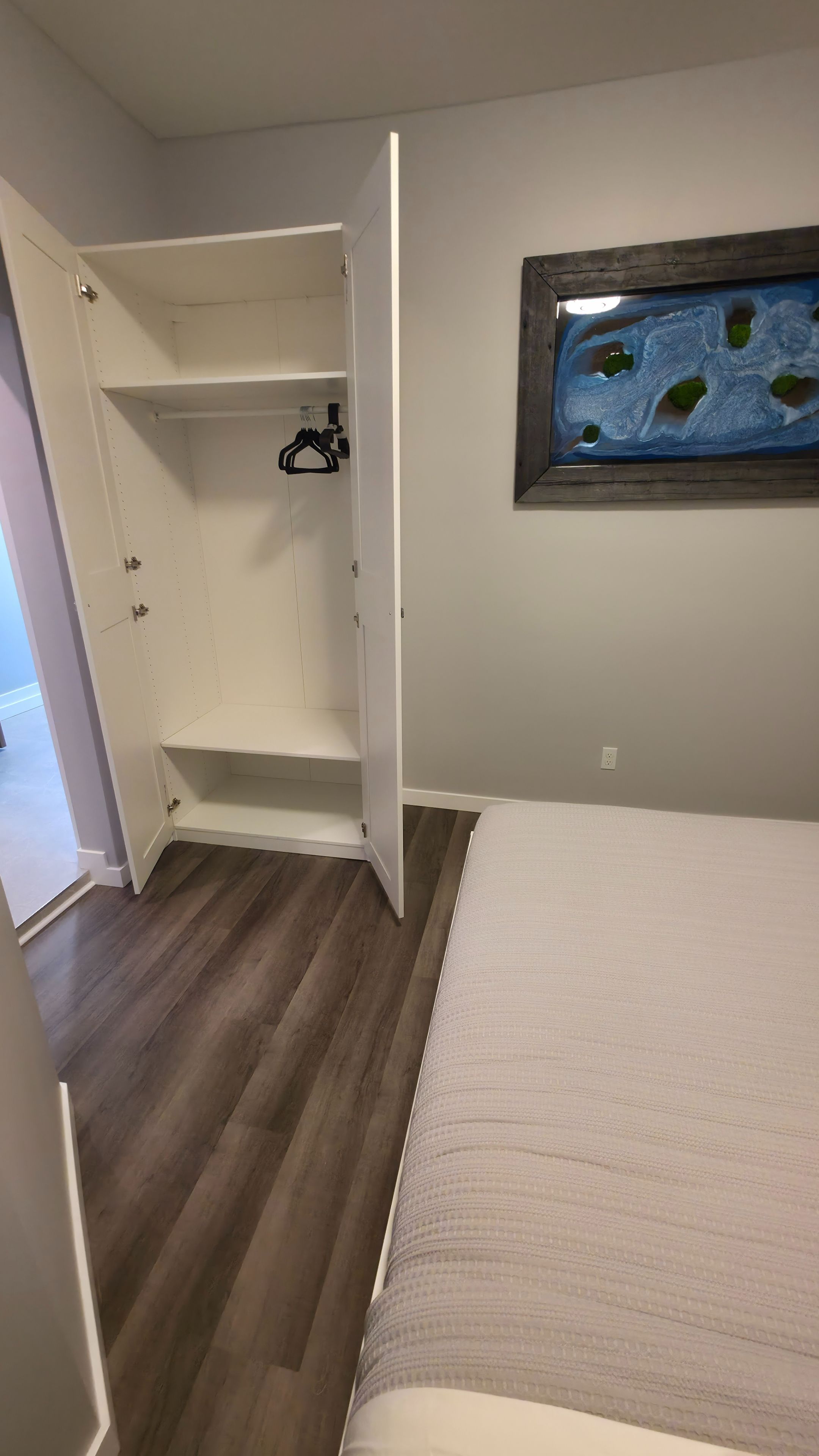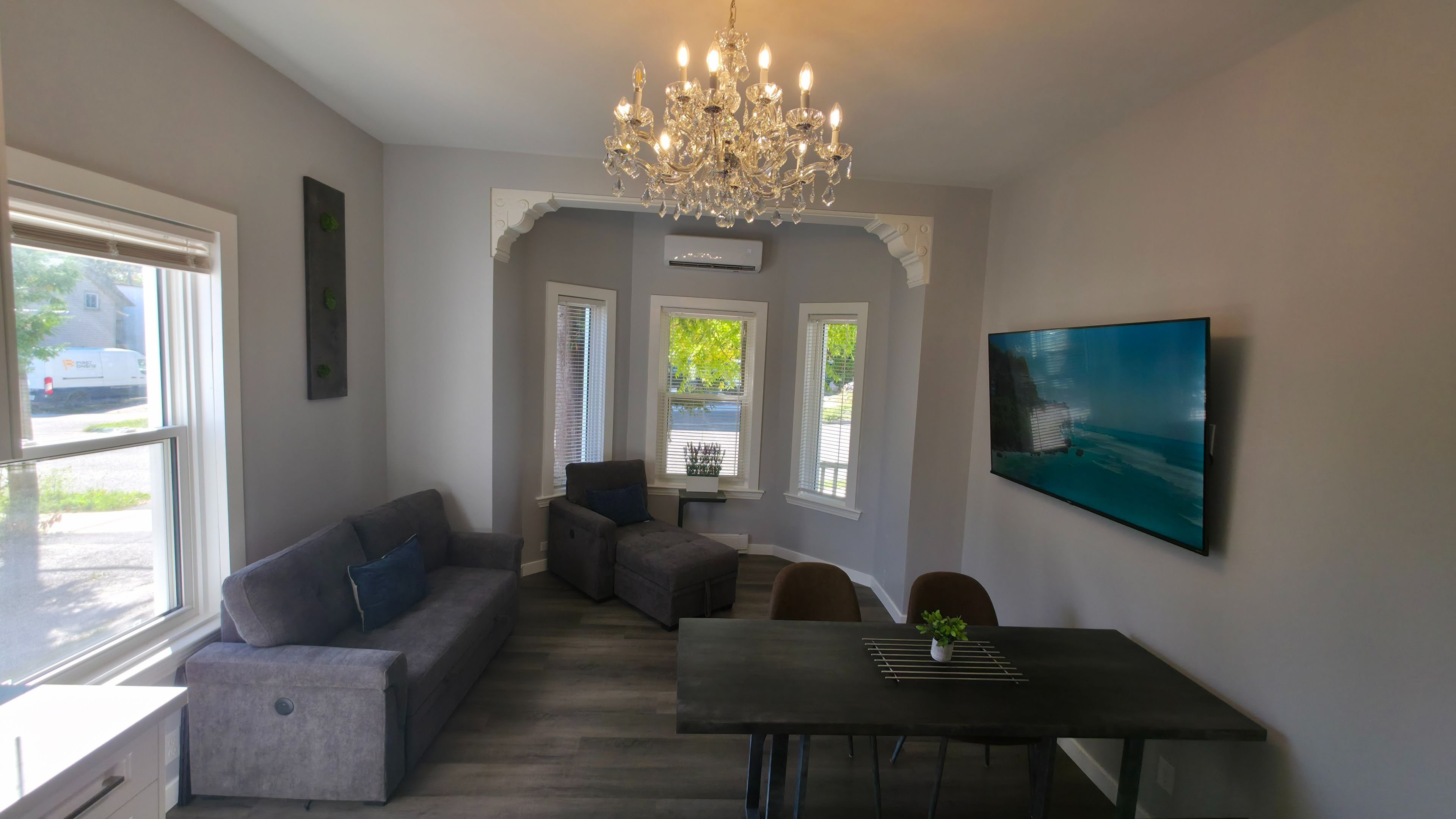 Never lived in, new everything, bright, fully furnished, modern 1-bedrrom apartment (no bed door) with high end luxury finishes. 3gb fiber wifi included. Stainless steel appliances including dishwasher and washer/dryer combo. The bathroom and entrance have in-floor heating for your comfort. Air conditioner. Huge, fully equipped kitchen with all dishes and cookware, including a kettle, toaster, etc. Elegant quartz countertops & backsplash with undermount sink. Queen bed with never used sheets/linens and huge under bed storage drawers. The couch pulls out to a double size bed. Wall mounted 4k smart tv with netflix & prime included, hdmi in your devices. Parking available if required. Located north of coldwater in a beautiful family friendly neighbourhood. Perfect location, just steps from downtown, 600 metres from memorial hospital, walking distance to couchiching beach. Main transit line on coldwater makes getting around quick & easy. Why fully furnish an apartment yourself when you can move in here and save 10s of thousands. If you're looking for simplicity, high end comfort in a great location, this could be the place for you. Host / owner has vast experience working with professional, corporate, and senior clients. The building has 6 apartments in total which could be packaged together for a client looking for multiple units. Please note appliances will be maintained for the entire tenancy. All other furnishings will not be replaced as they age out of their useful life. Please ask for specific details. Rent plus electric plus parking if needed.