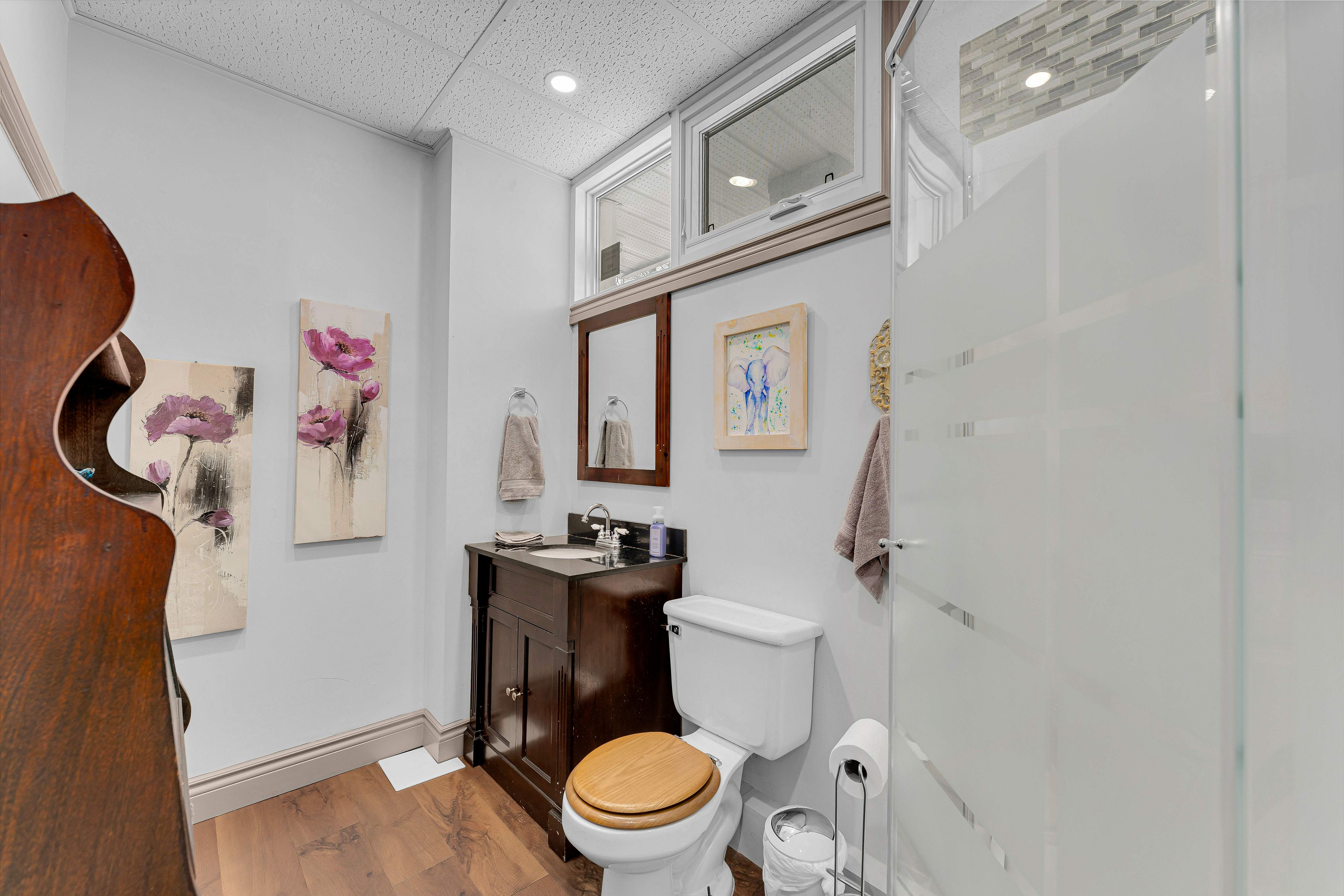 • Convenient full bathroom with shower for employees and clients.