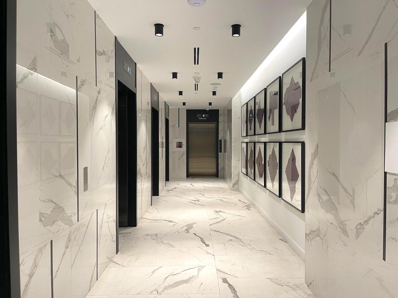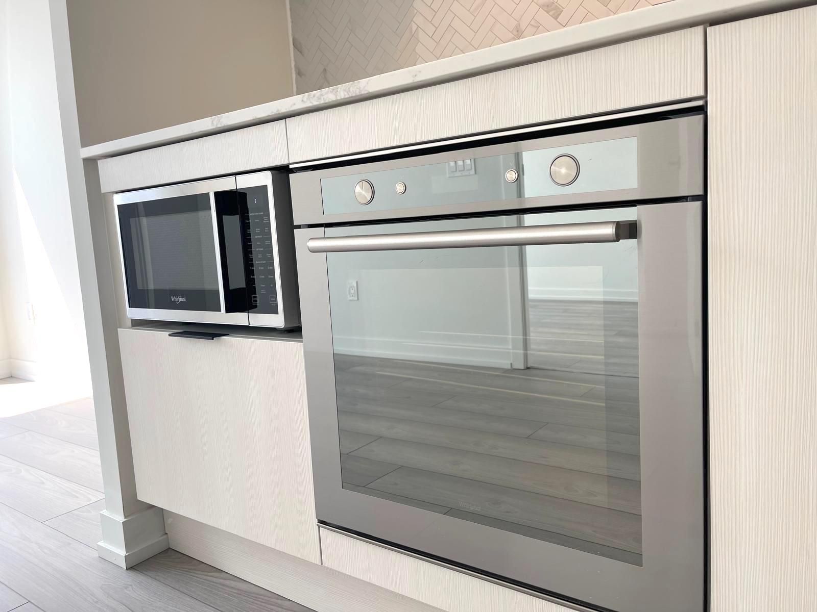 • Modern design featuring 9 ft ceilings and sleek kitchen appliances.