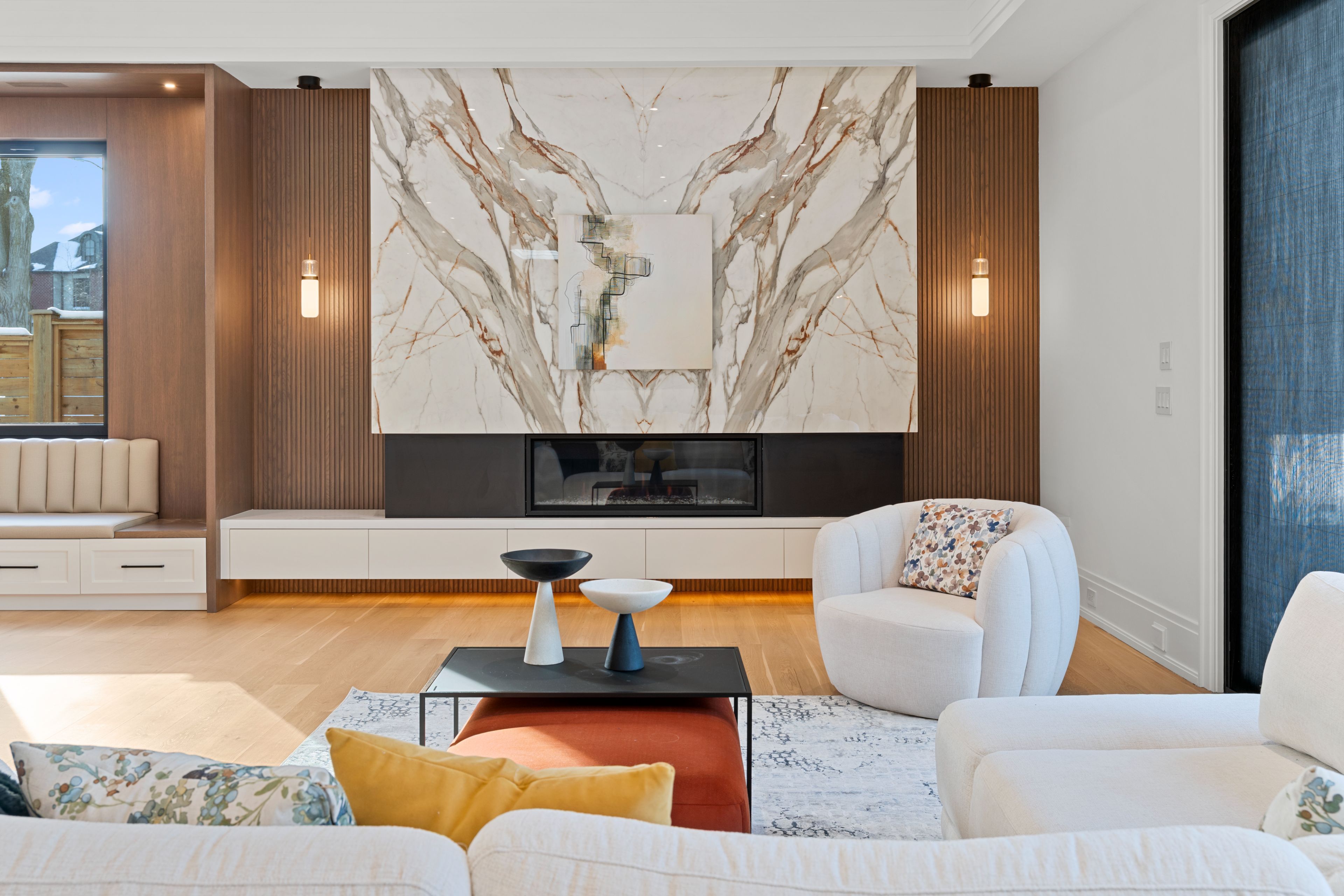 • Chef's kitchen with custom cabinetry, marble countertops, and premium appliances.