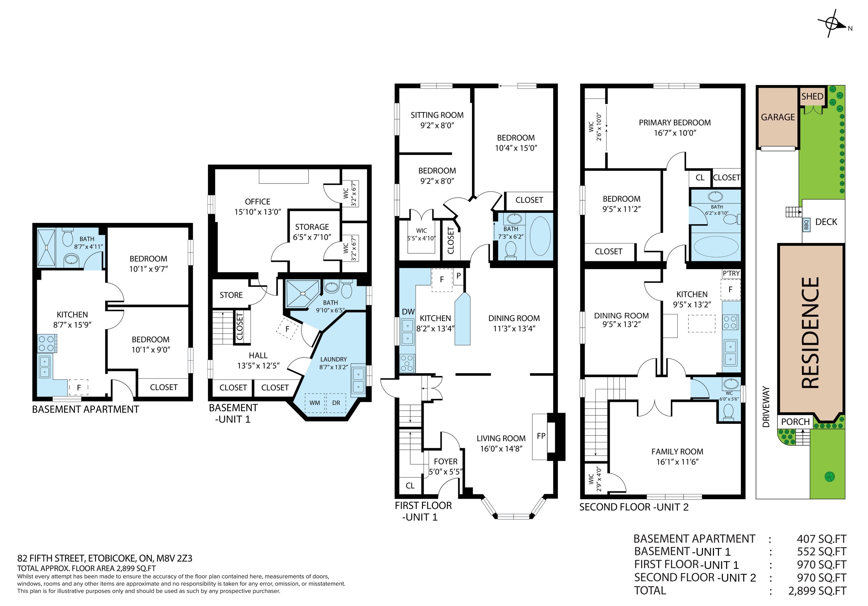 Welcome to 82 fifth street - welcome to life by the lake! Massive triplex with private drive, tons of parking and detached garage on one of new toronto's most coveted streets, south of lakeshore! Steps to lake, shopping, restaurants, schools, parks and transit. Easy access to highways, downtown and airport. Home offers possibilities galore: 2900 square feet of finished living space currently set up as 3 self-contained units. Live in one unit and have your tenants pay the mortgage; use as multi-generational home; convert upper levels into a family home with in-law suite or income generating suite in the basement; or use existing l-a-r-g-e footprint and renovate into a huge single family home on this friendly street! Unit 1 boasts high ceilings, an inviting living room complete with fireplace, large kitchen overlooking formal dining room, 2 bedrooms (one with a walk-out to gorgeous backyard and deck), 2 bathrooms and a below grade rec room/office that could be used as a 3rd bedroom. Tons of storage. Unit 2 also has 2 bedrooms and 2 bathrooms, a large, eat-in kitchen (with skylight!), a formal dining room (could be used as 3rd bedroom) and a dedicated living room. A 2 bedroom/1 bathroom basement apartment with separate entrance located at rear of the home. This home has been lovingly owned and maintained by the same family for more than 4 decades - and is awaiting your updates to be enjoyed for the next 40 years!
