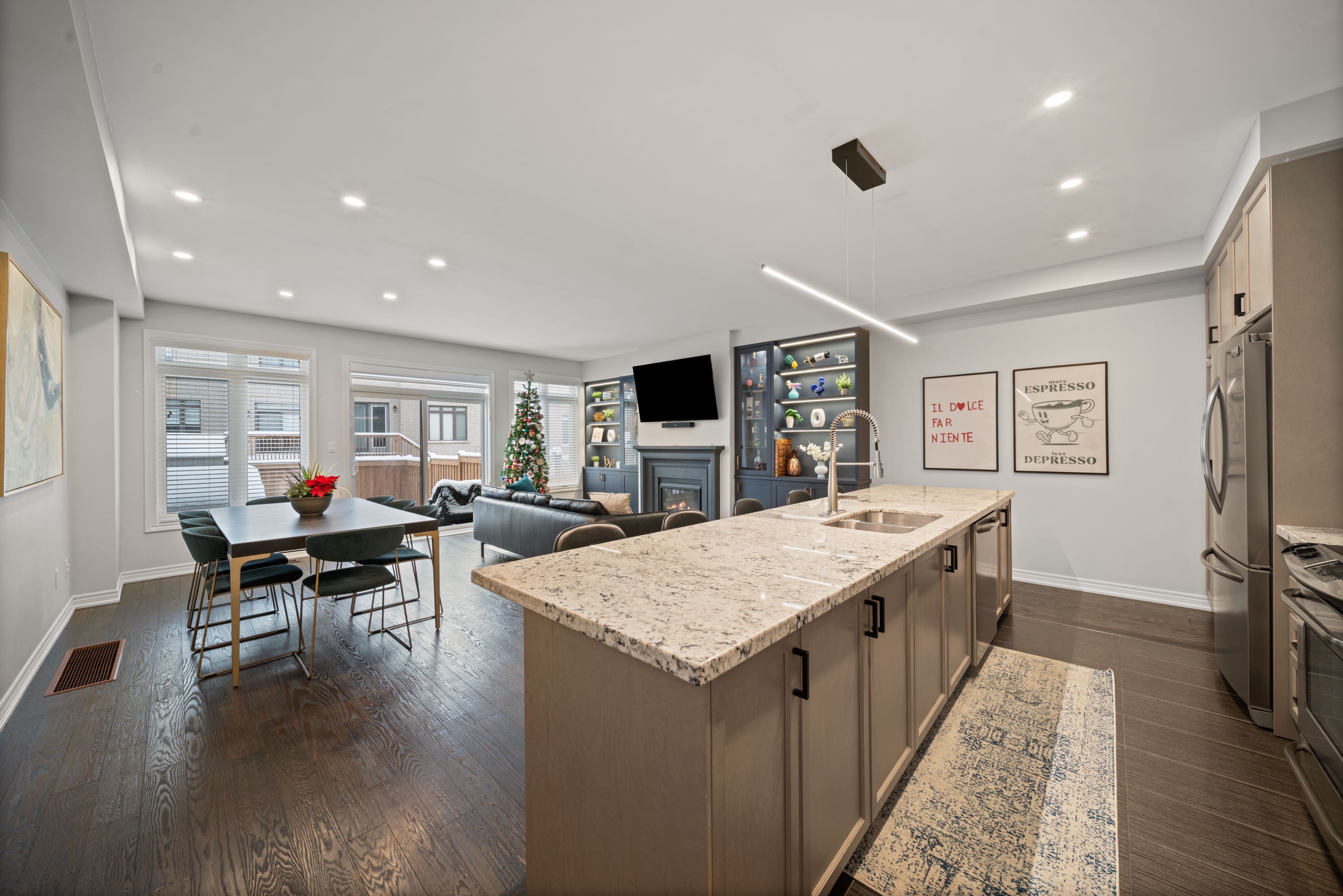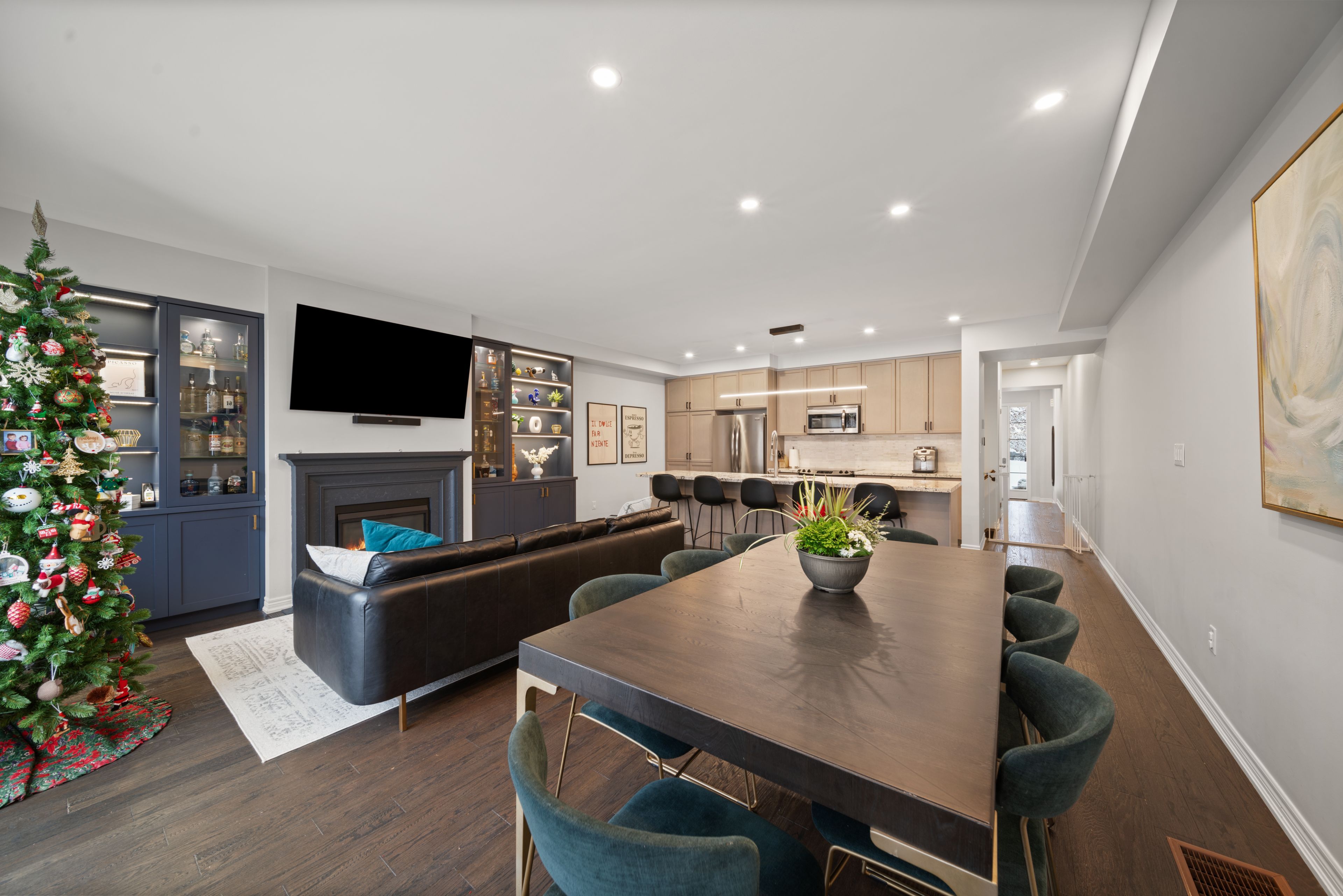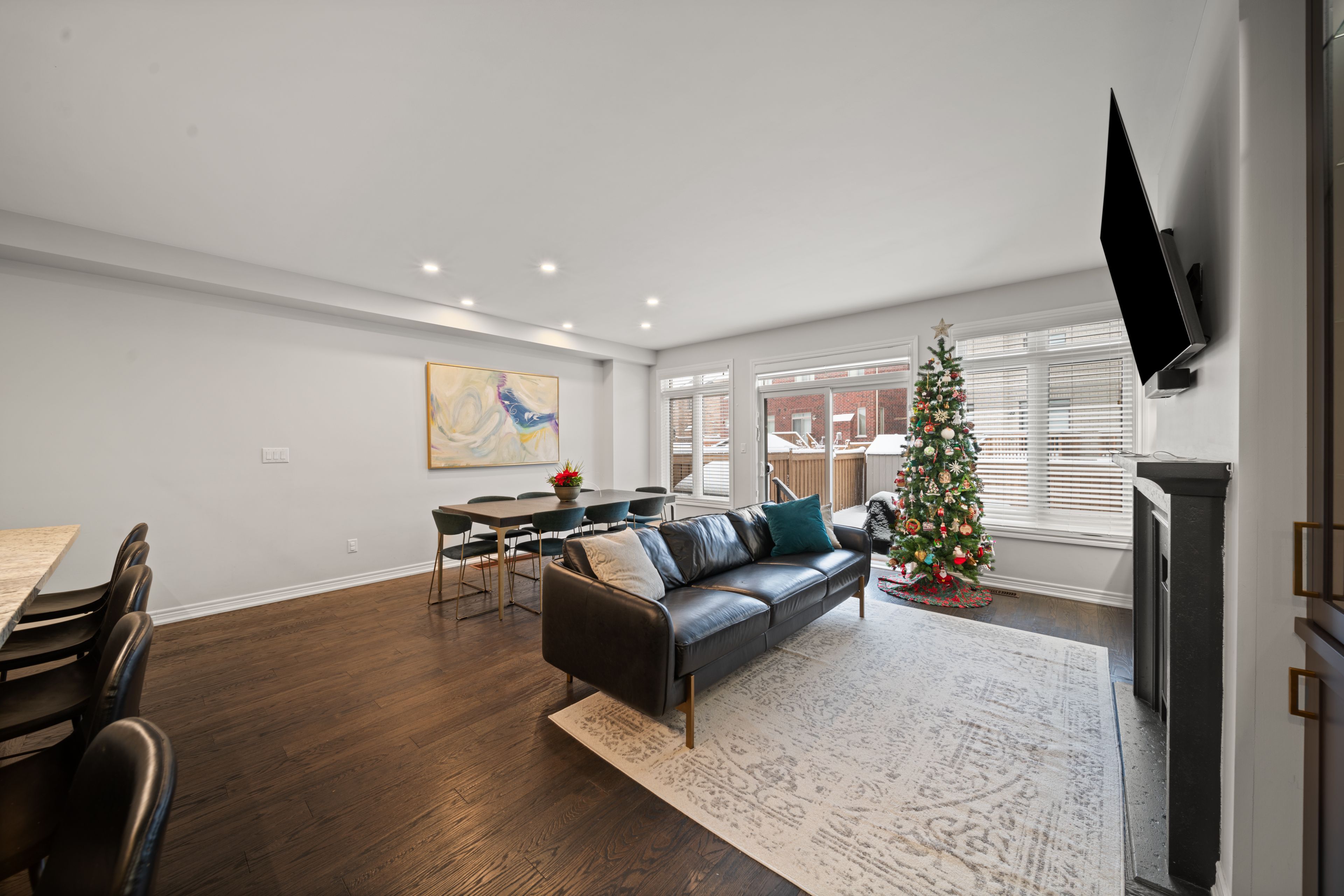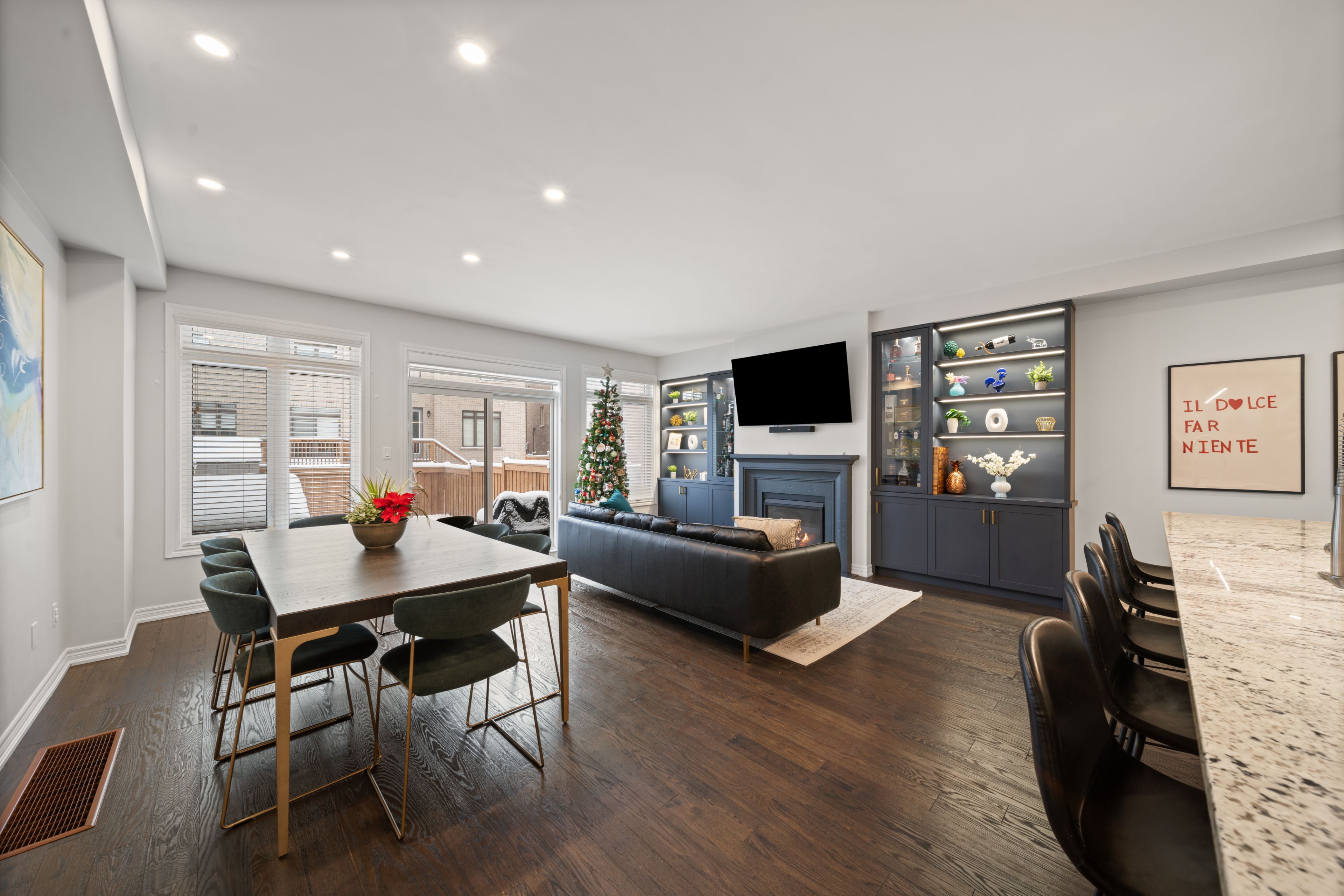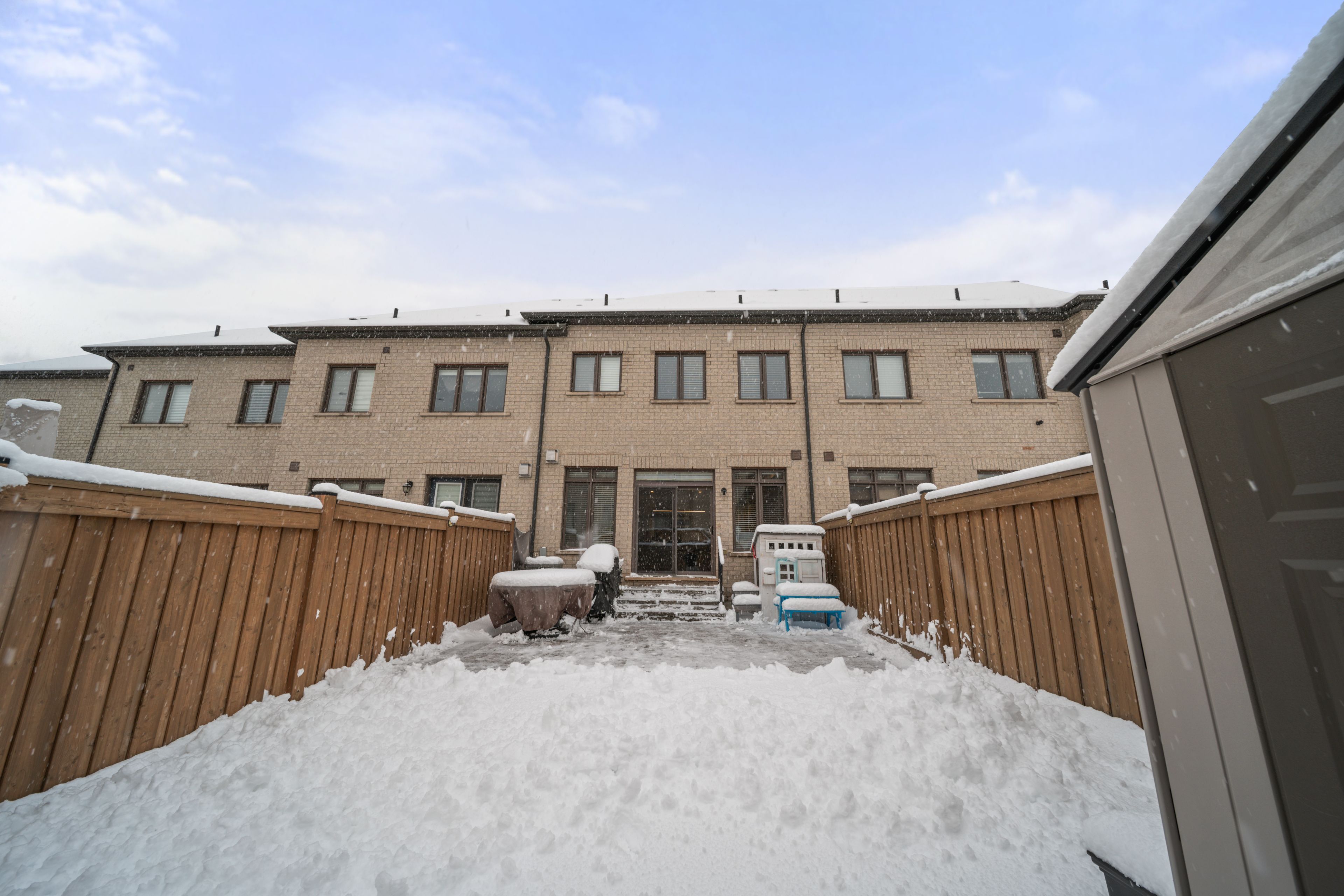 Welcome to this stunning townhouse located in the highly sought-after aurora trails community. This beautifully upgraded home features an open-concept design with smooth ceilings, pot lights, and hand-crafted hardwood throughout. The living area is anchored by a gorgeous fireplace surrounded by a built-in bookshelf. Spacious modern kitchen complete with granite countertops and large family sized island. Enjoy 9 ft. Ceilings on both the main and second floors. The home also includes a convenient second-floor laundry updated in 2021 and a fully finished basement renovated in 2023, perfect for additional living or entertainment space. The fenced backyard offers a patio, gas hookup for bbq and a shed set on a concrete base. The luxurious primary ensuite features a free-standing tub and a glass-enclosed shower. With countless upgrades throughout, this home is truly a must-see!