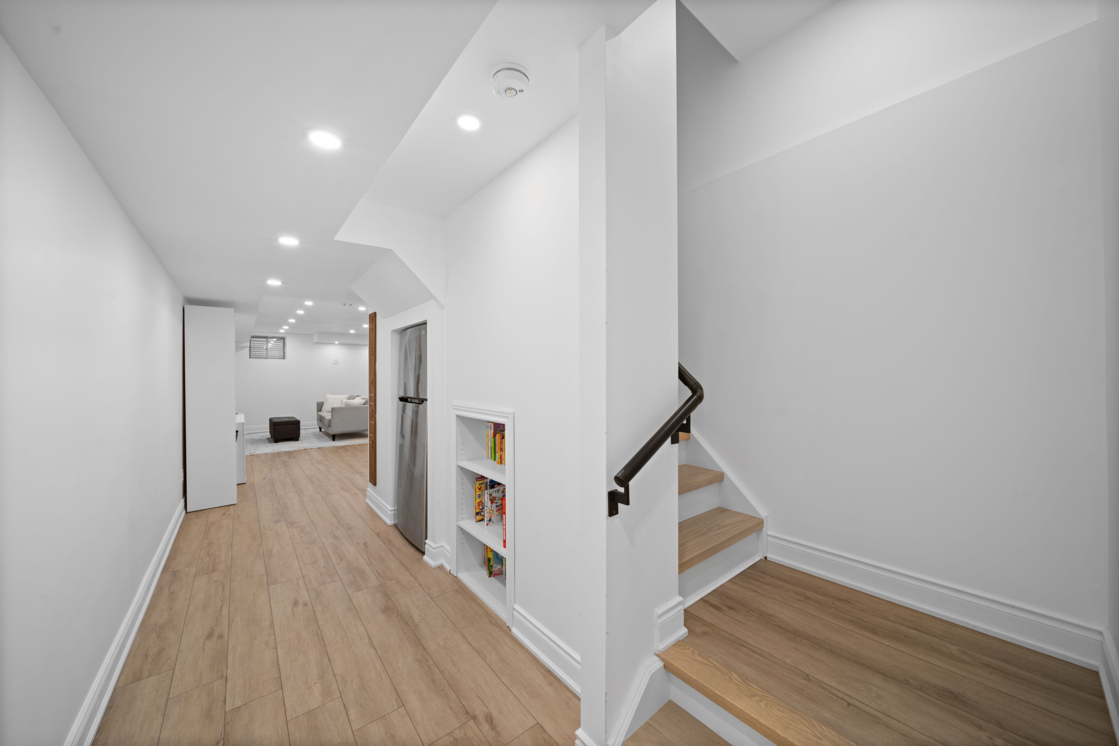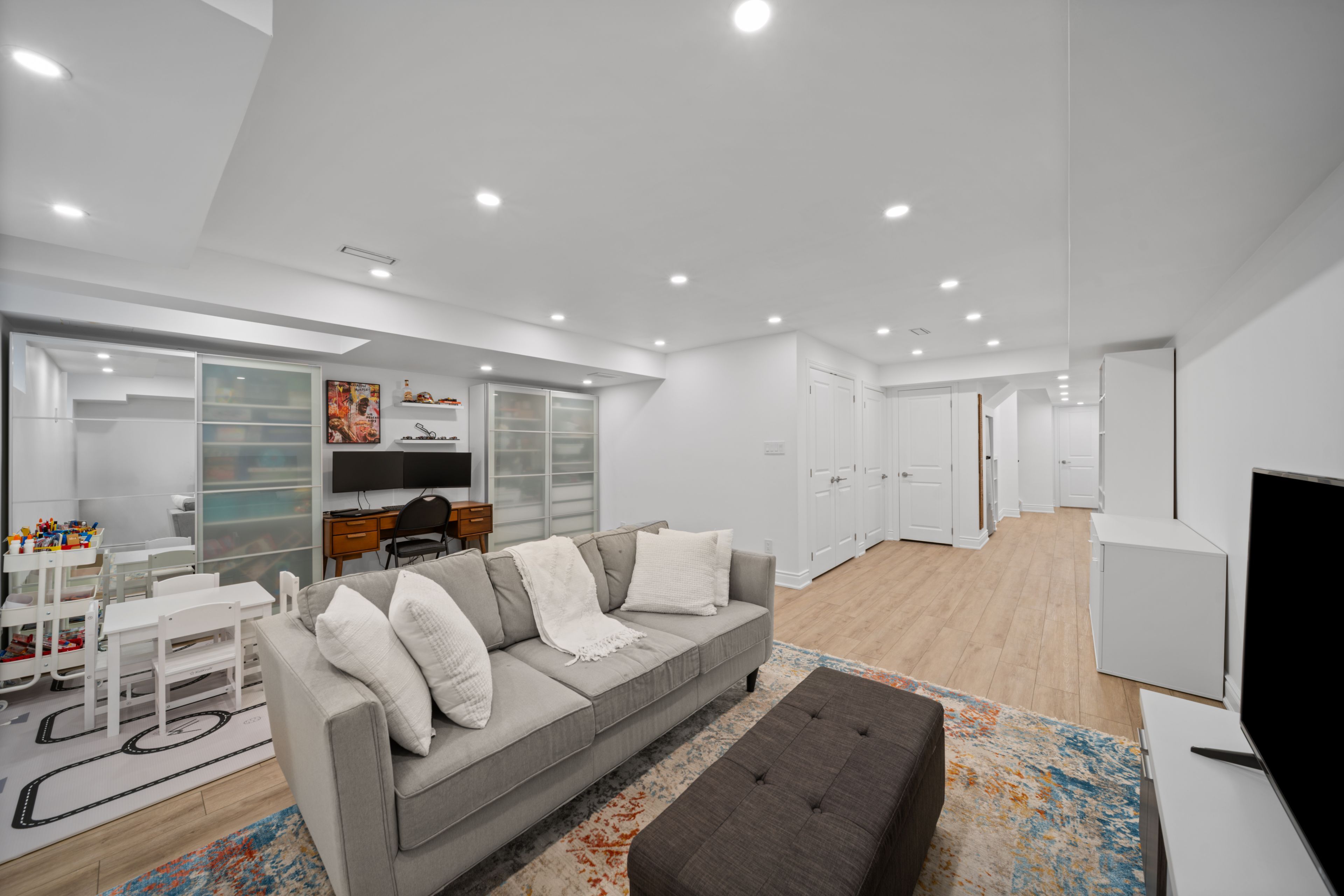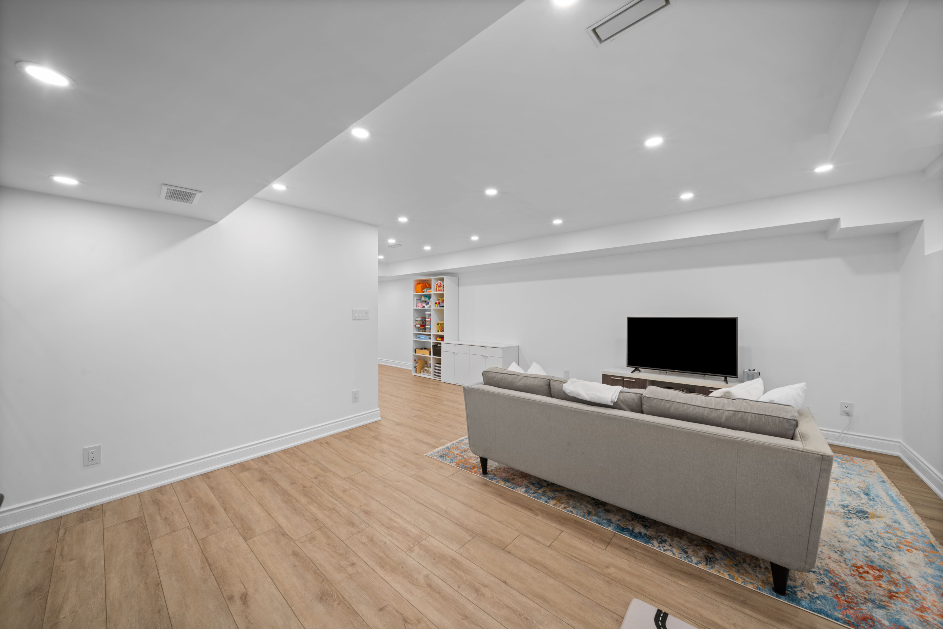 • Open-concept design with smooth ceilings and built-in bookshelf.