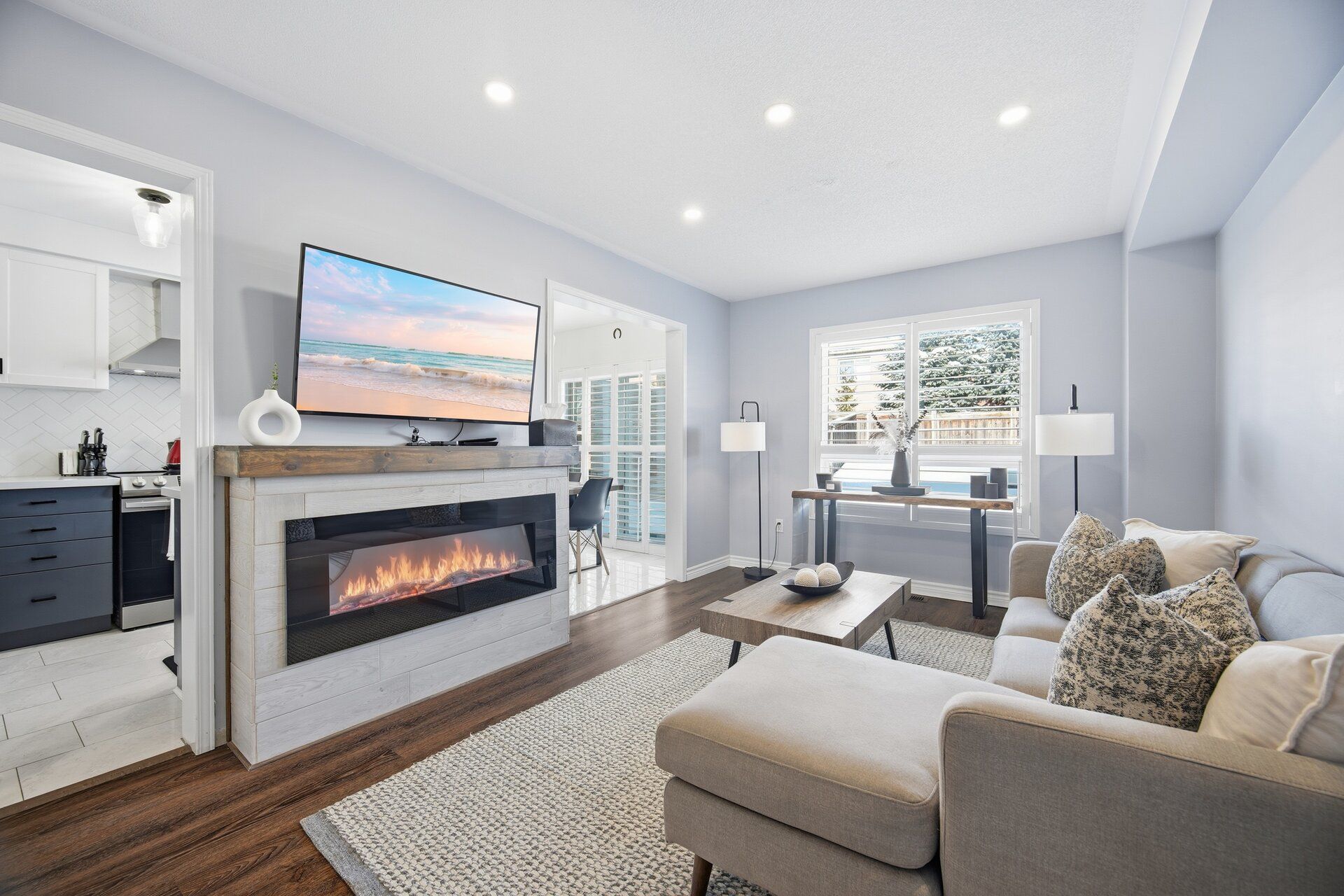 • Bright living/dining room with a built-in electric fireplace.