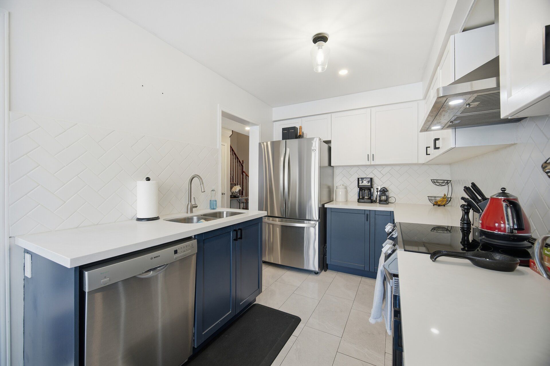 • Renovated kitchen featuring stainless steel appliances and quartz countertops.