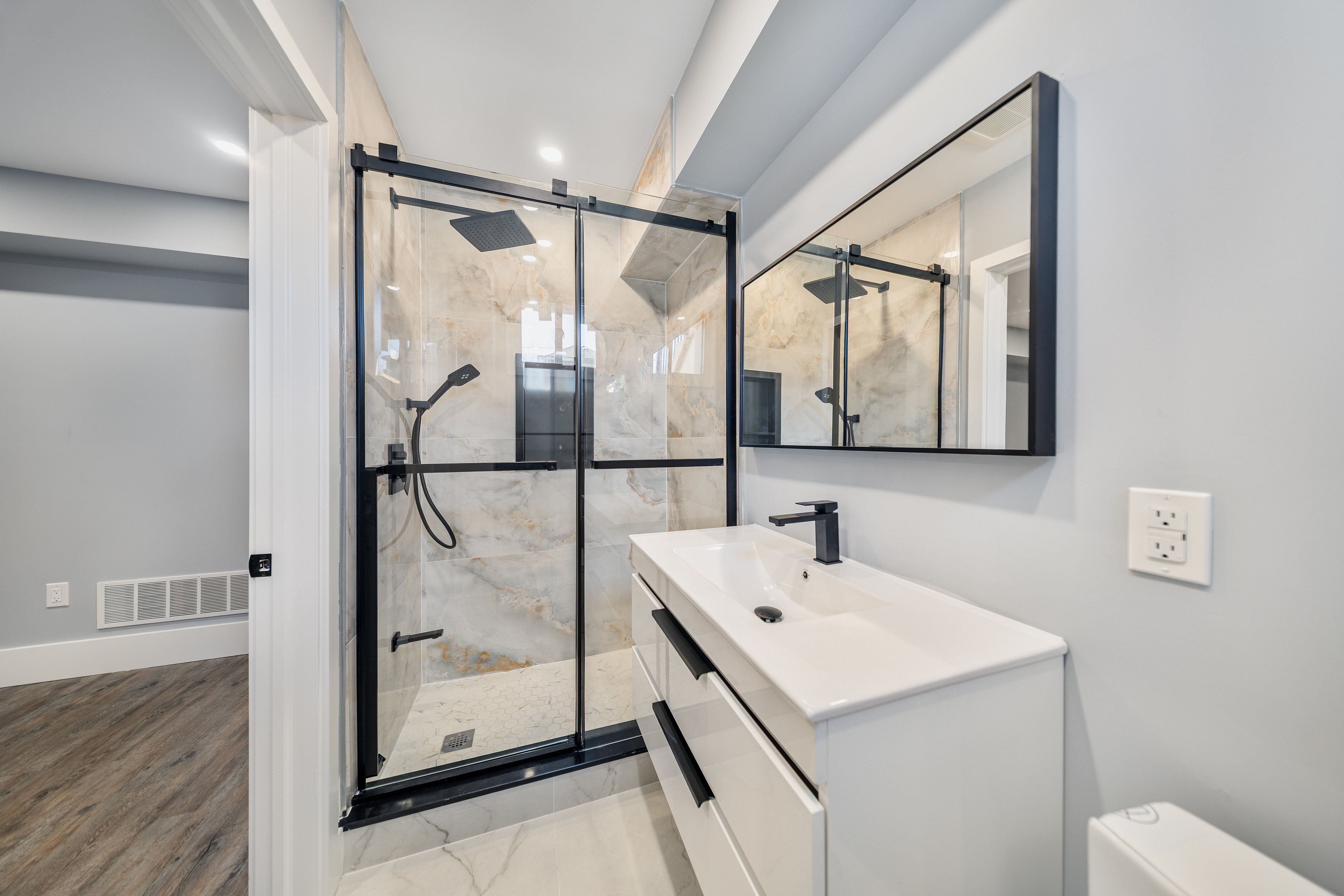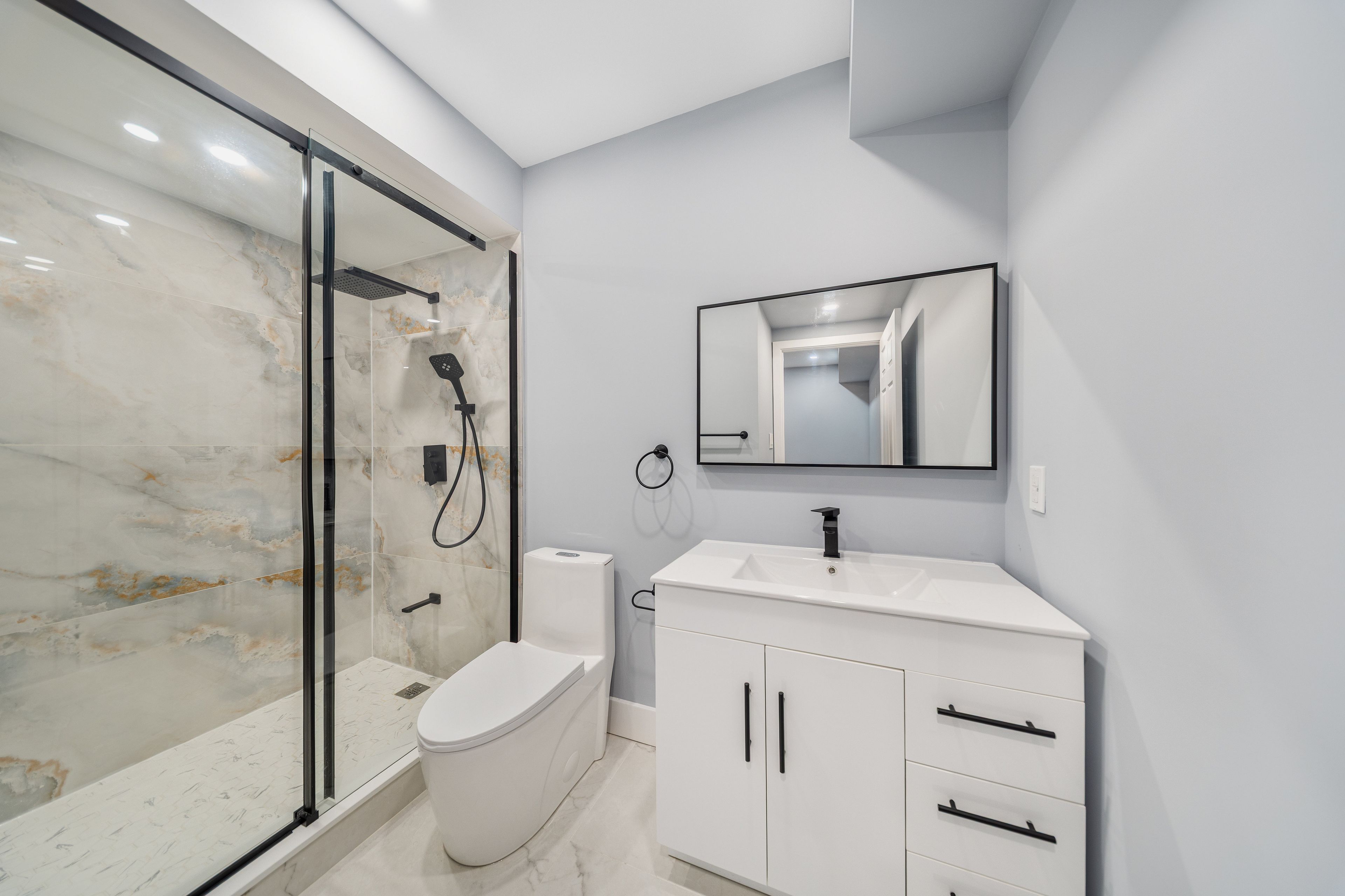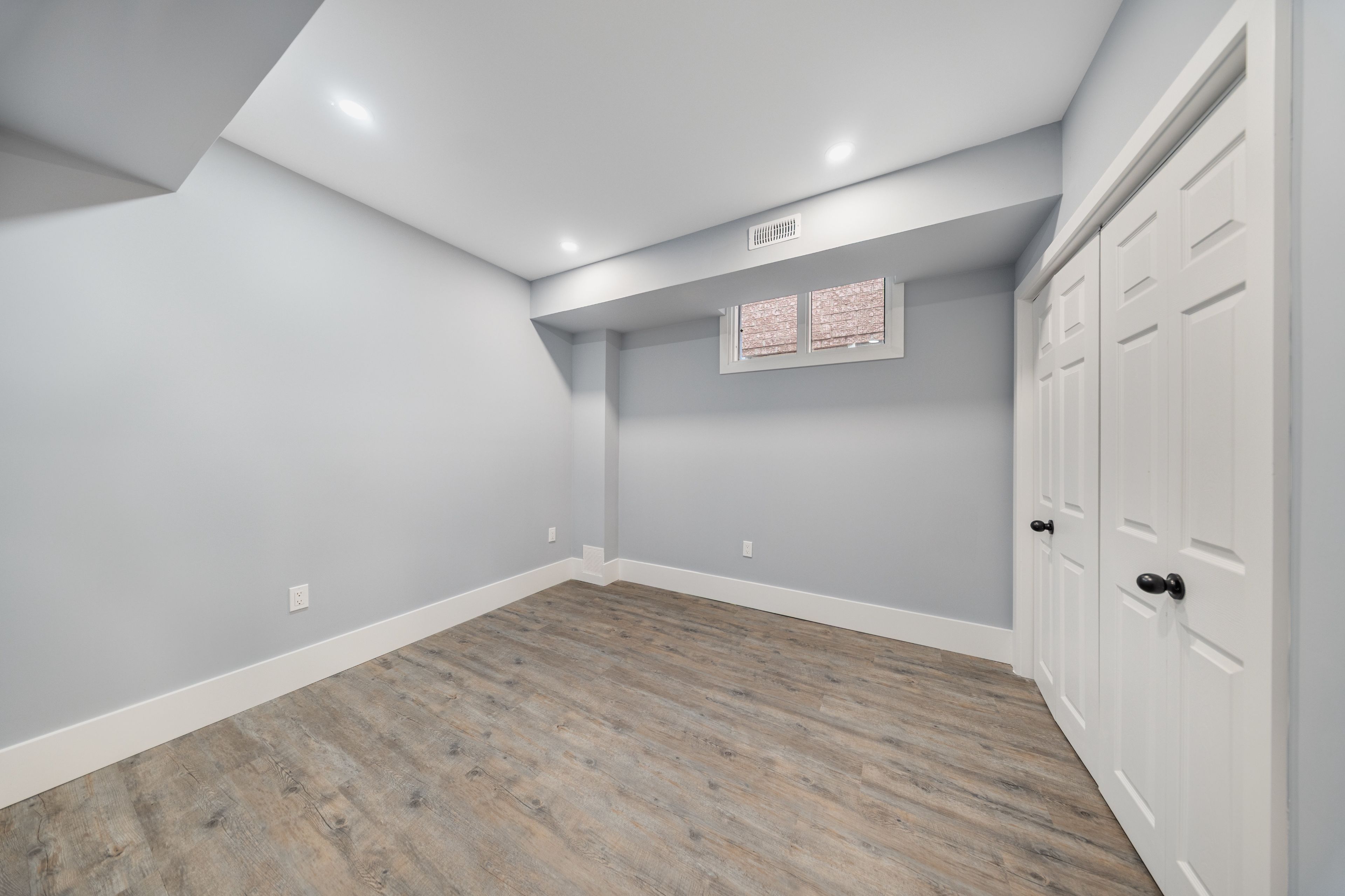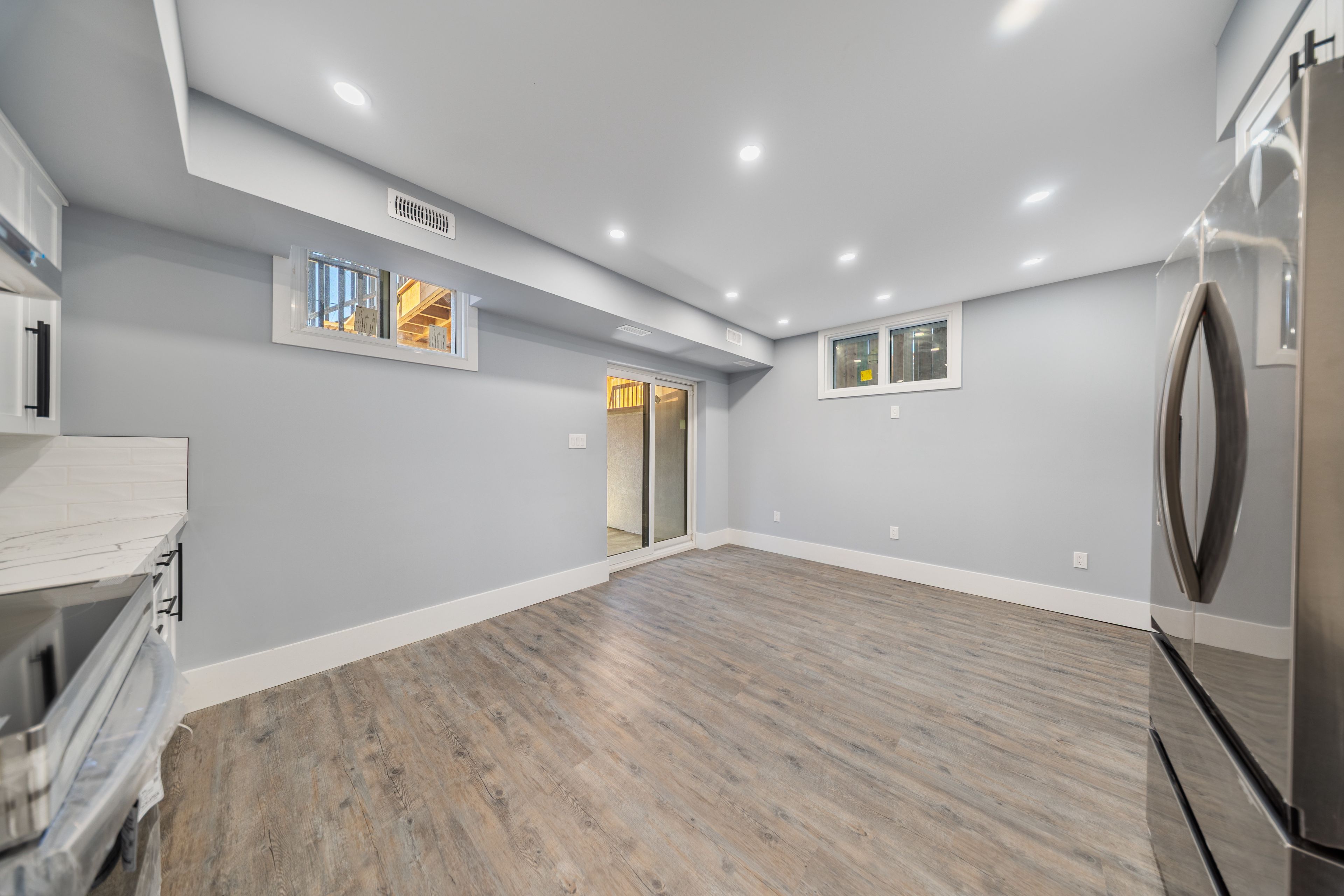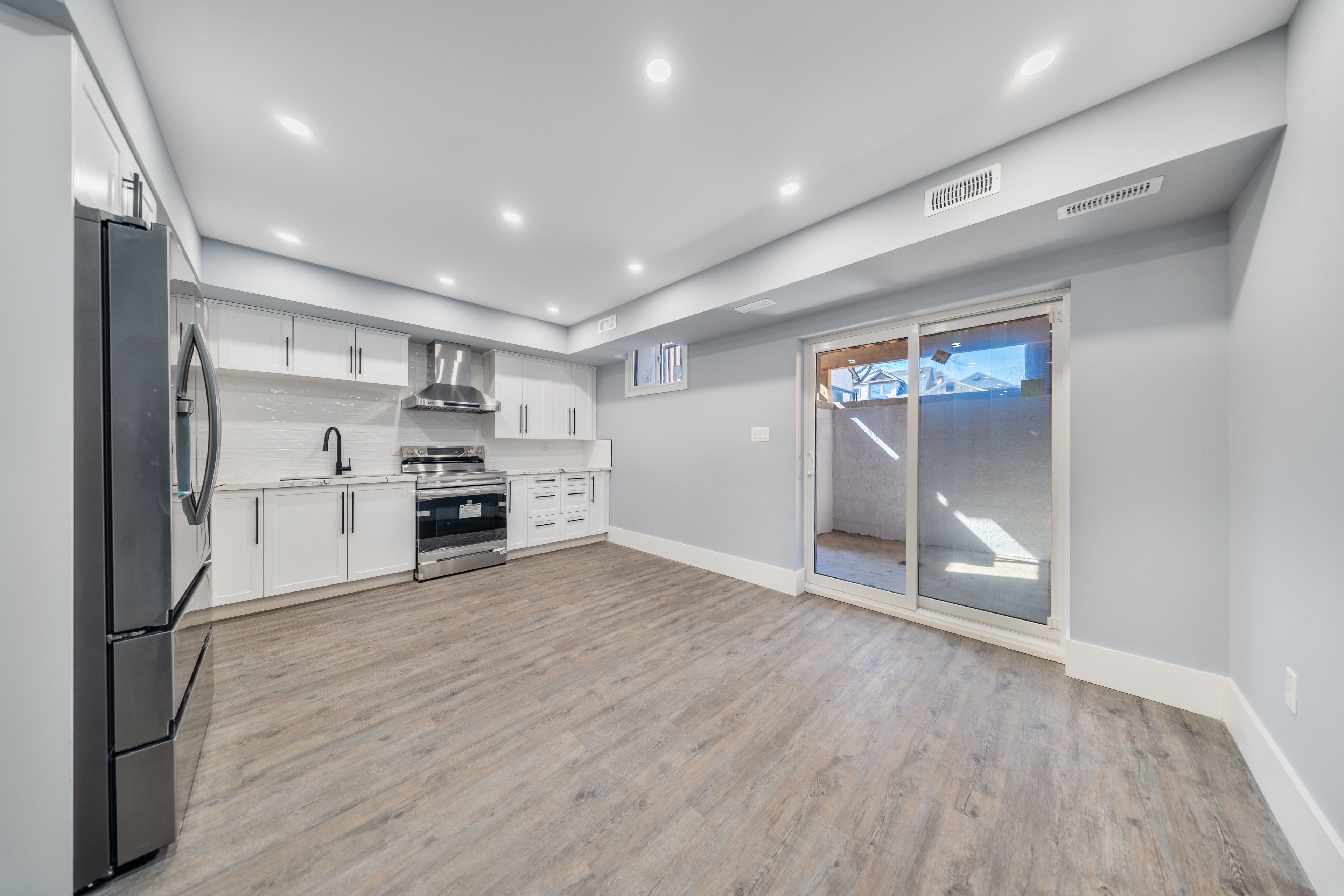 Rarely offered brand new detached legal triplex unit 3- this bright basement-level unit boasts 8 ft ceilings, 2 bedrooms each with their own ensuite bathrooms, and a spacious open-concept living/dining area. The modern kitchen features quartz countertops, stainless steel appliances, and abundant natural light, with direct walk-up access to the backyard. Enjoy additional features including in-suite laundry, engineered hardwood flooring, and pot lights throughout. Ideally located within steps to public transit, schools, and everyday amenities.