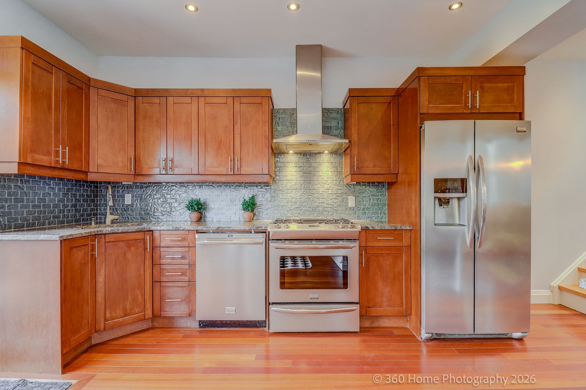• Spacious kitchen with stainless steel appliances and breakfast area.