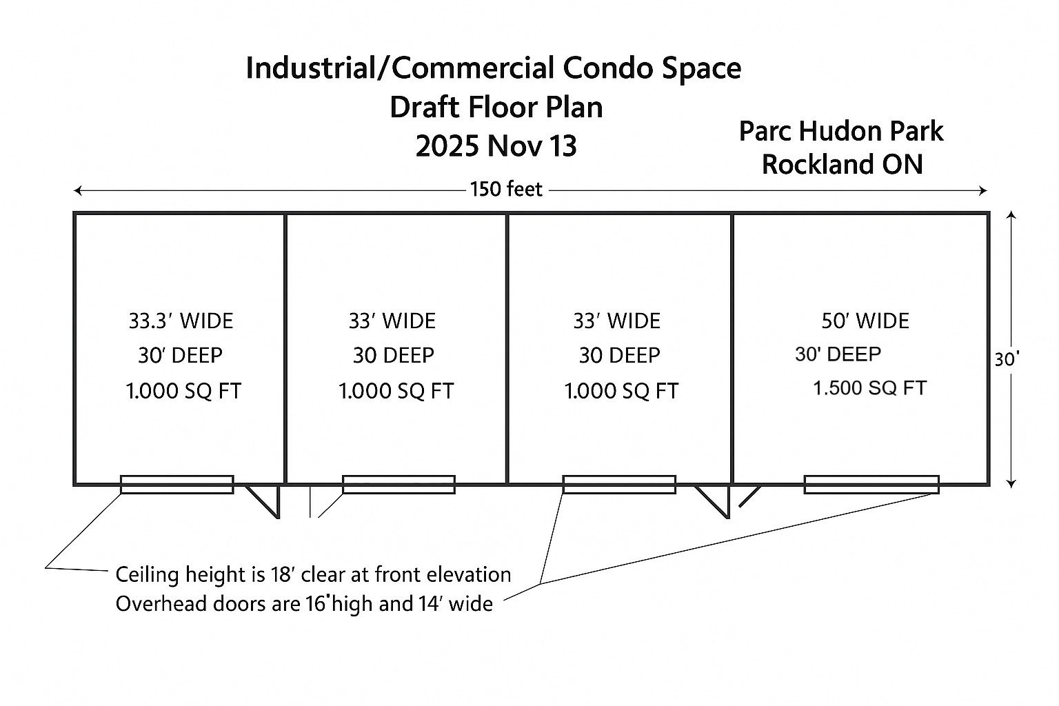 Own your own space/stop renting! Build equity in both your space and your business. Prime commercial/industrial condo bays in rockland available for purchase on county road 17 highway. A great place for your business to succeed in a fast developing area. Close to belanger chrysler, rockland golf club, clarence-rockland arena, stores, restaurants, new homes and many successful enterprises. Be part of an emerging new business park called parc hudon park. Traffic count (2017) shows 12,000 to 12,500 vehicles per day. Highway commercial zoning allows for custom workshops, personal service establishments, day care, outside miniature golf, tourist establishment, motor vehicle body shop, motor vehicle dealership, motor vehicle rental facility, industrial condos, retail store, chip wagon, farmers market, restaurant, and much more. Excellent signage opportunities. Locate your business plus own your own property and space next to the new flixbus eastern ontario hq and getspace ltd's storage and workshop site. Be part of the new parc hudon business park. Get your own address on summit private. Bays range from 1,000 sq ft to 1,500 sq ft each. Great space with large overhead doors (16' high, 14' wide), person door, ceiling height of 18', bathroom. Brand new. 4 bays available in phase 1. Be part of a supportive community. If you need more space, just combine bays. Perfect for trades & contractors, makers & fabricators, automotive, storage & logistics, artists &photographers, film, stage, or set designers, nonprofits or community groups, yoga studios, registered massage therapists, physiotherapists, acupuncturists, etc etc. Take advantage of nearby small and large secure contractors yards for ios (industrial outdoor storage): smaller yards available: 50' x 50' (2,500 sq ft) yard for just $350 per month plus hst. Larger ones available on request.