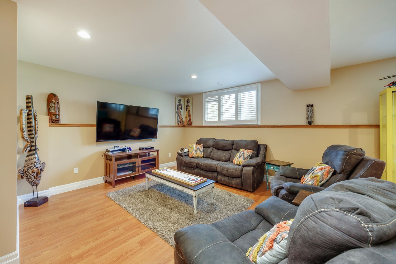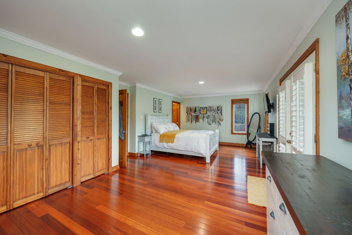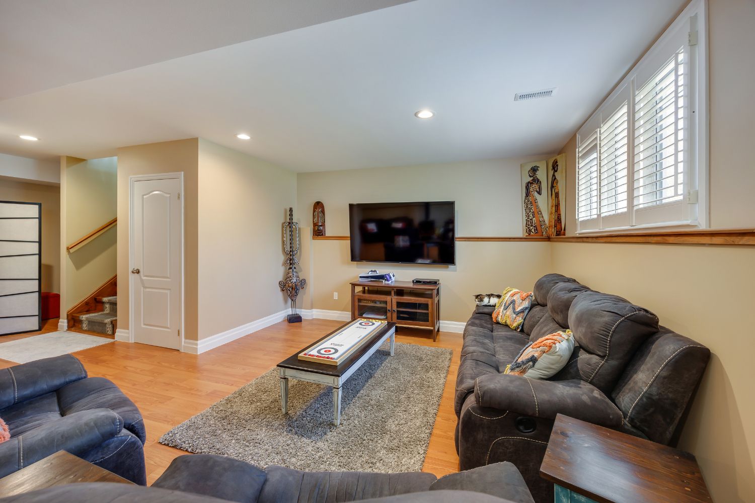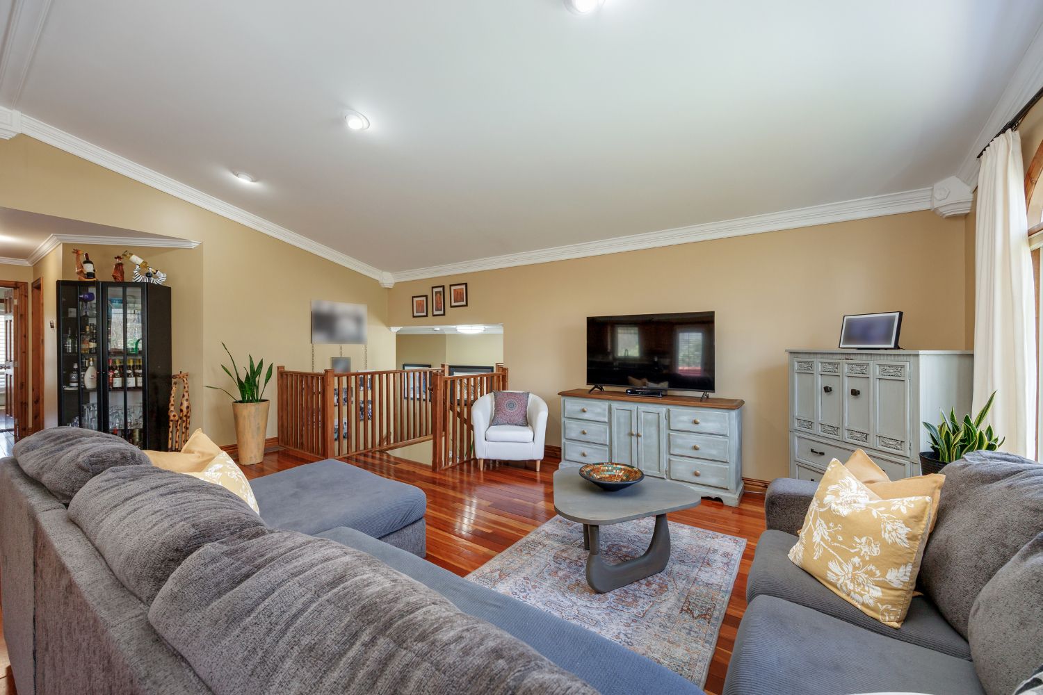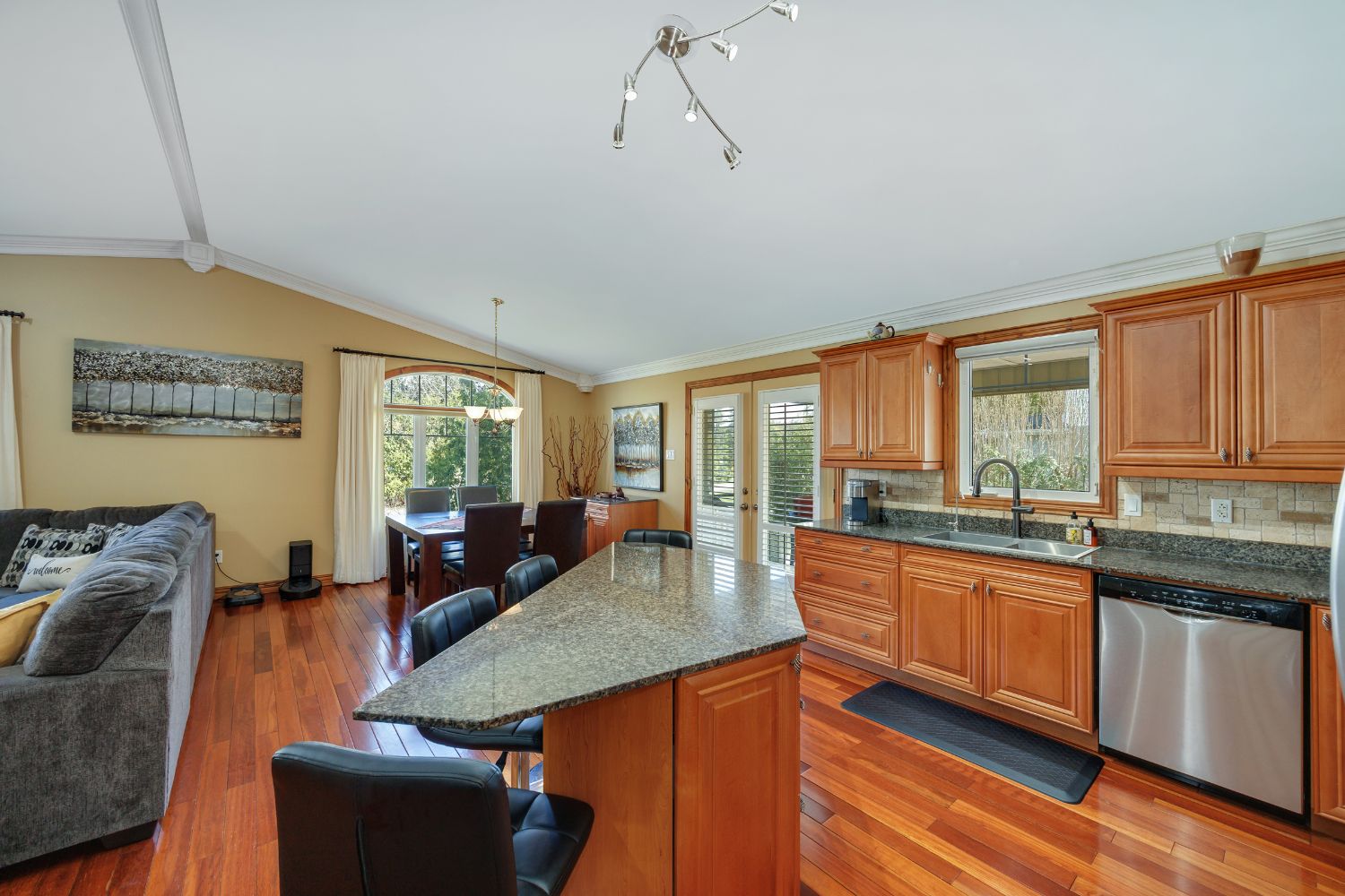 • Open-concept living space with vaulted ceilings and hardwood floors.