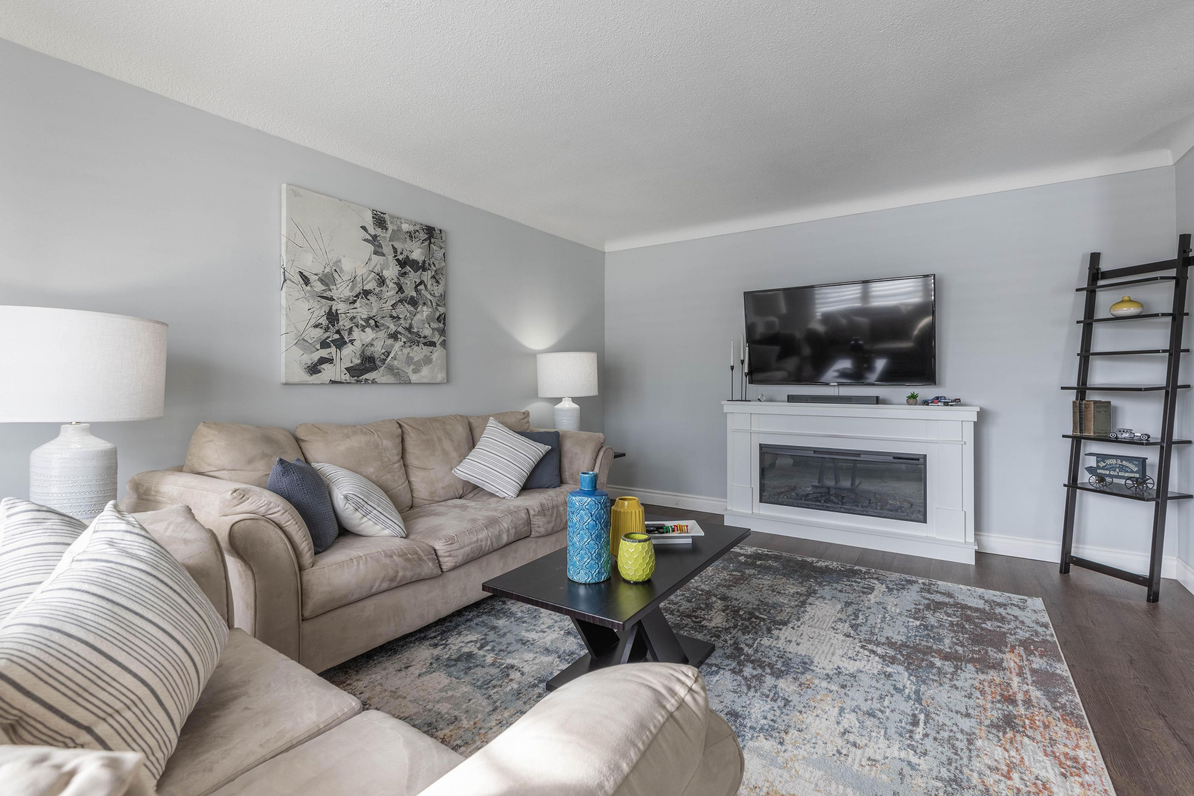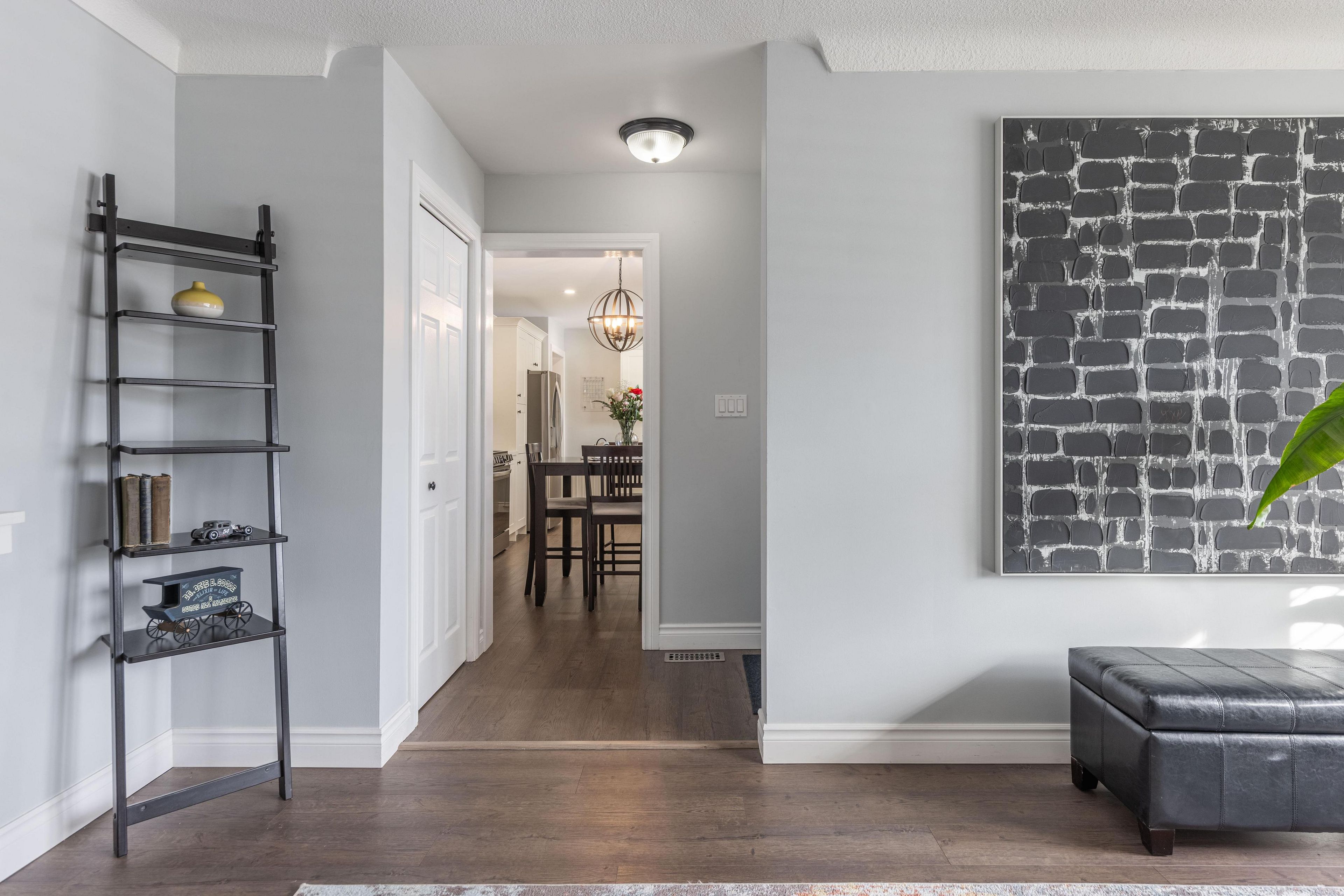 • Spacious living room with California shutters and updated kitchen.