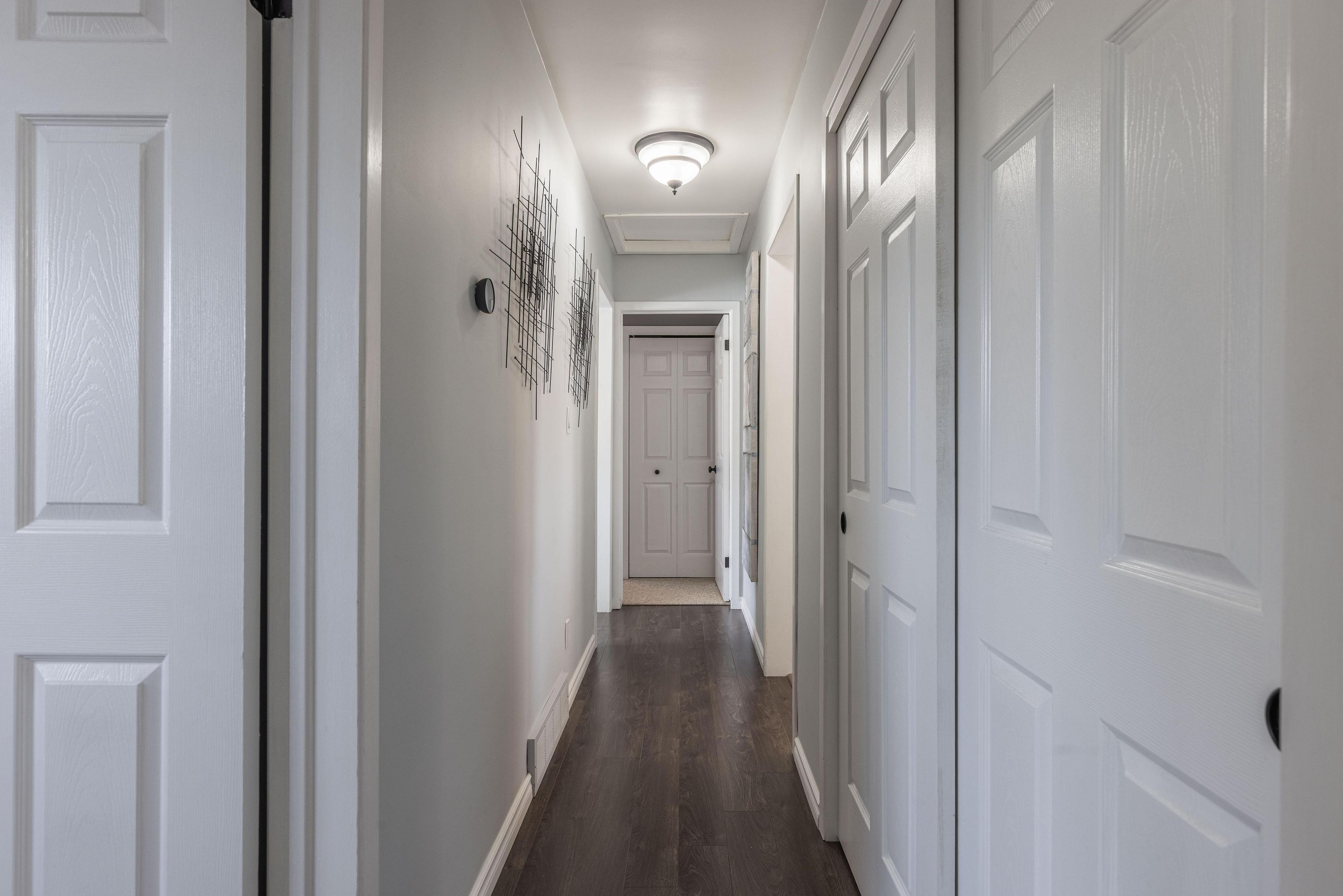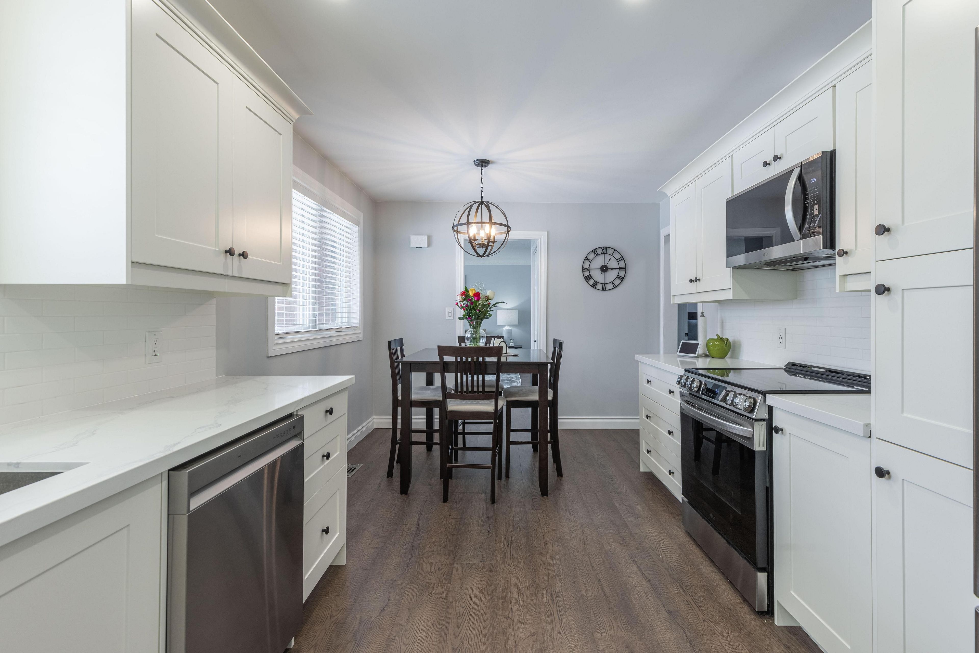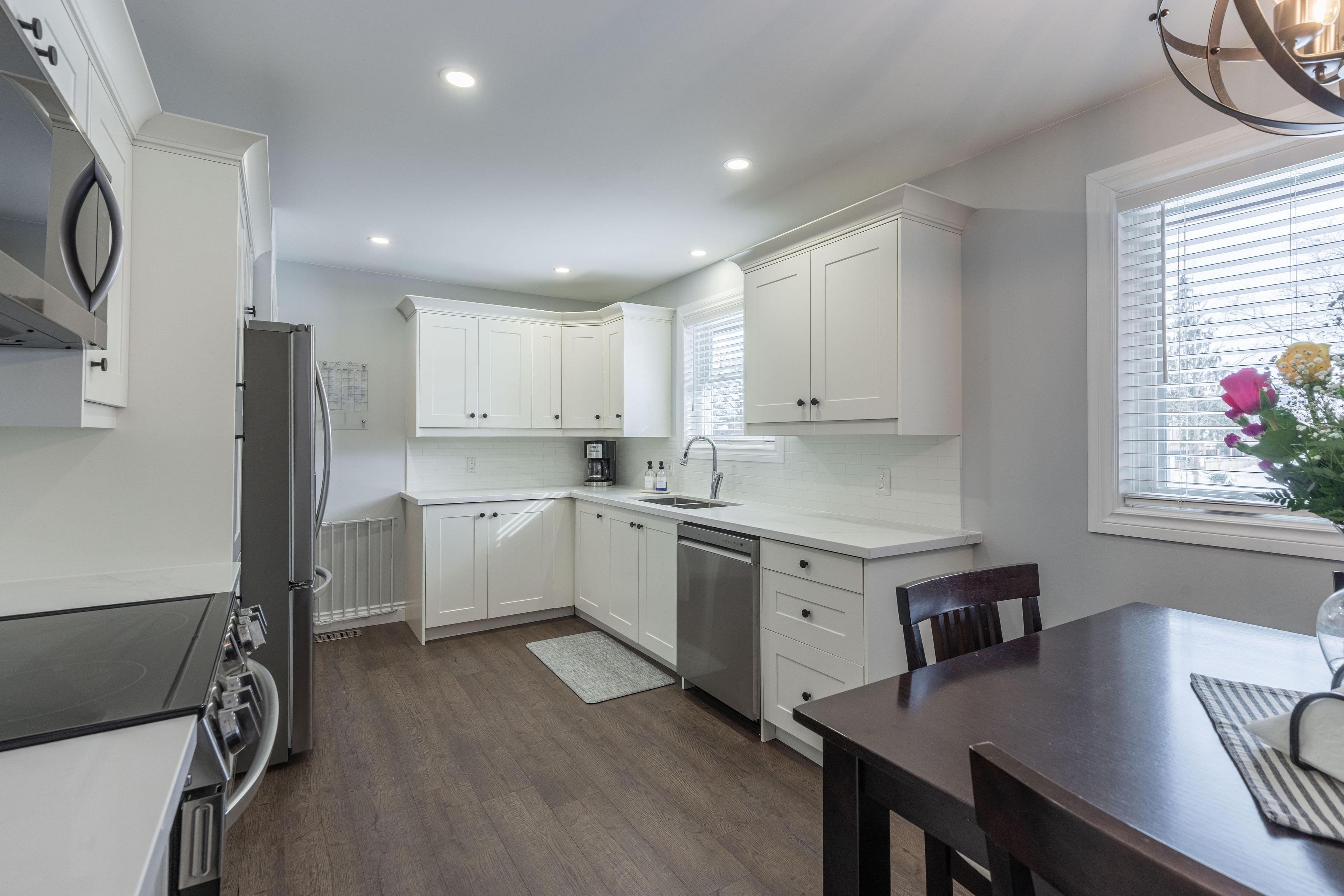 Gorgeous brick bungalow in highly sought after neighbourhood! This fully renovated home offers 3 bedrooms, 2 full bathrooms, detached garage and 2 separate entrances with in-law potential. Main floor has been renovated throughout with gorgeous, professionally installed white kitchen with quartz countertops and stainless steel appliances included. Main floor features an oversized living room with california shutters, 3 bedrooms plus updated 4-piece bath with tub & shower. Lower level offers separate side driveway entrance with beautiful open space with spacious rec room, games/pool table area plus separate office space (previously 4th bedroom), laundry room, workshop room, cold cellar and updated 3-piece bath with shower. Rear yard is fully fenced with detached garage & shed both with hydro, 12' x 26' rear deck with side and rear deck steps. All kitchen appliances plus washer & dryer included. Wonderful family-friendly neighbourhood with parks, great school district, easy access to public transportation, groceries, shopping, restaurants and qew highway access.
