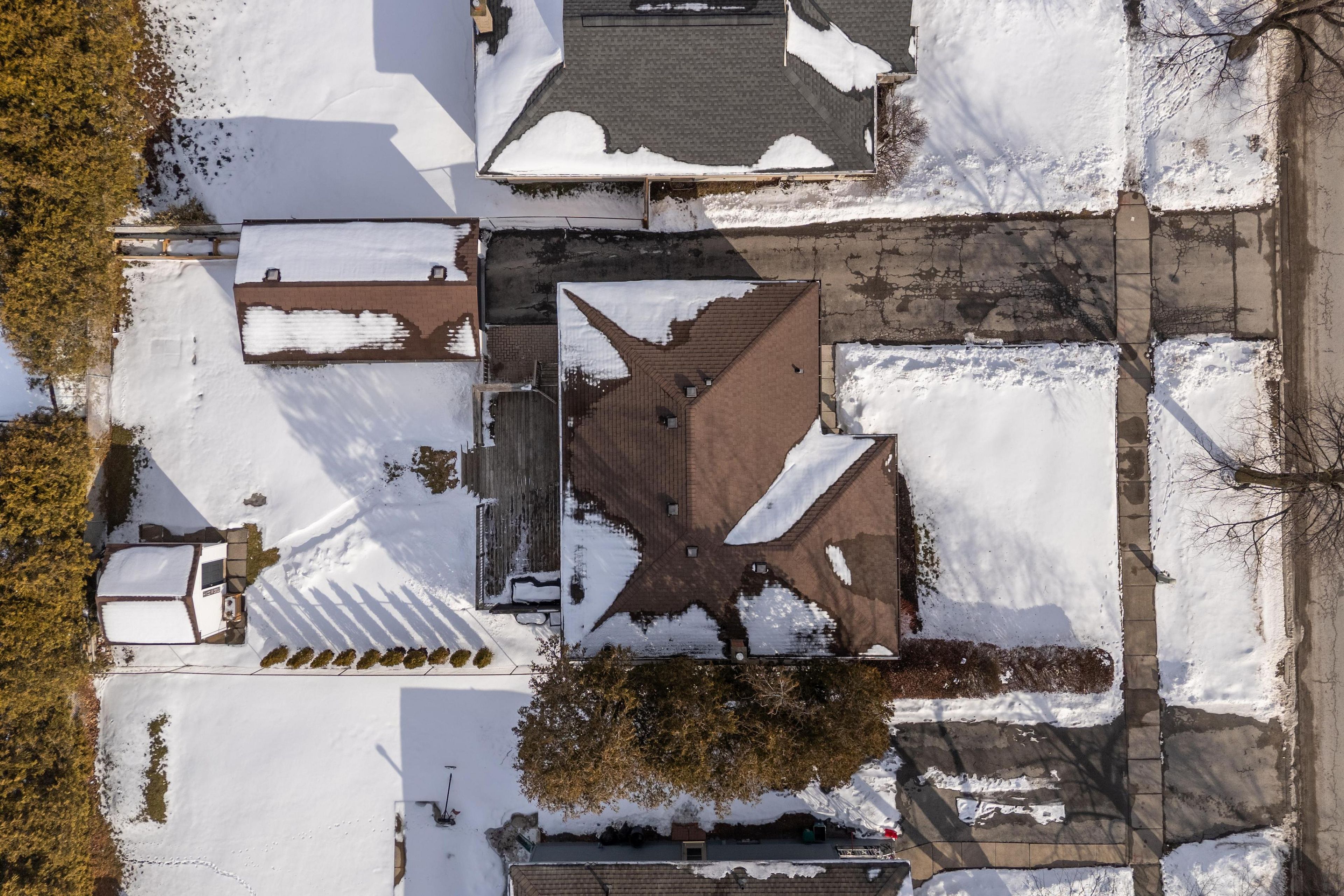 • Fenced yard with detached garage, shed, and large deck.