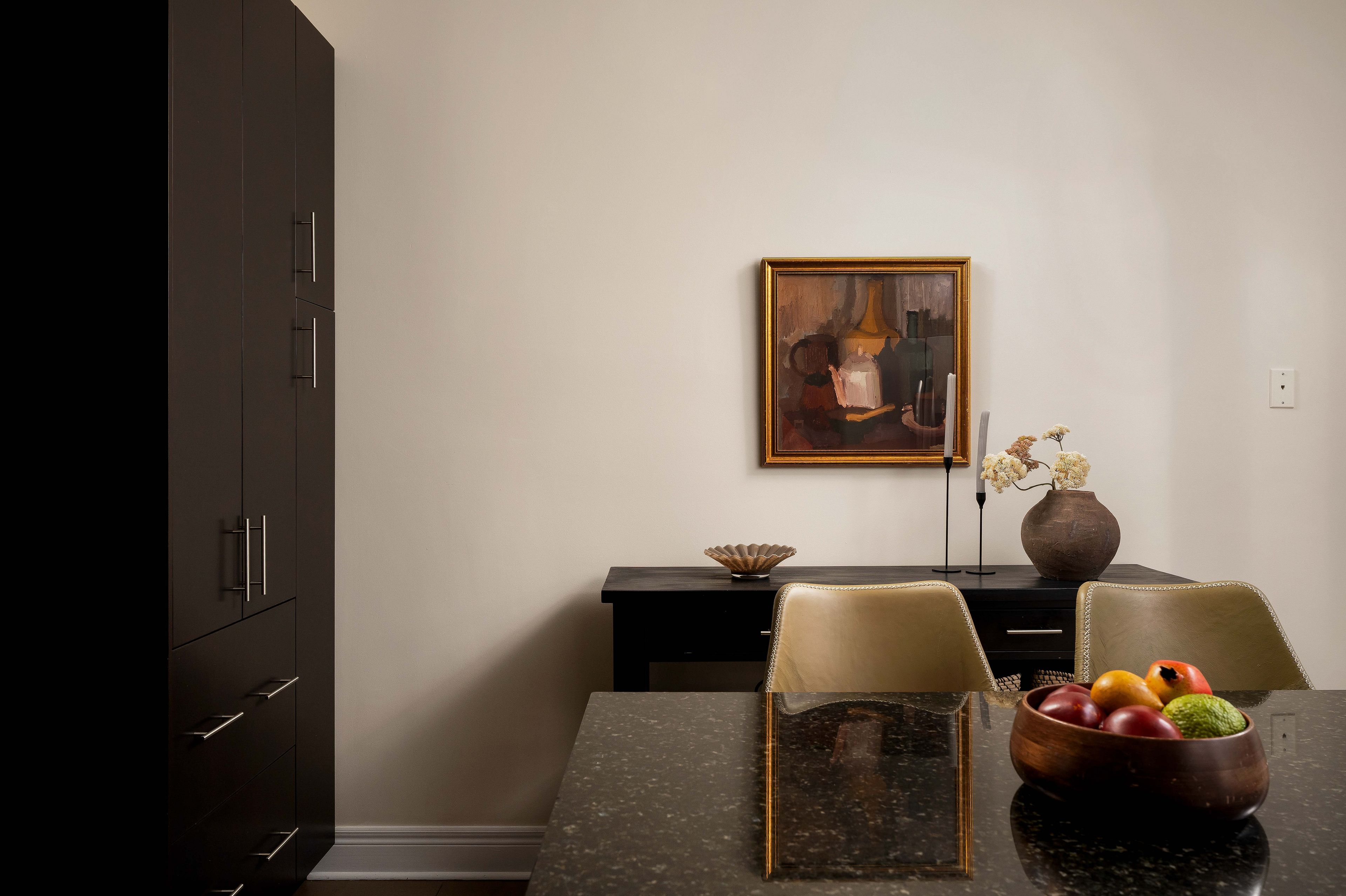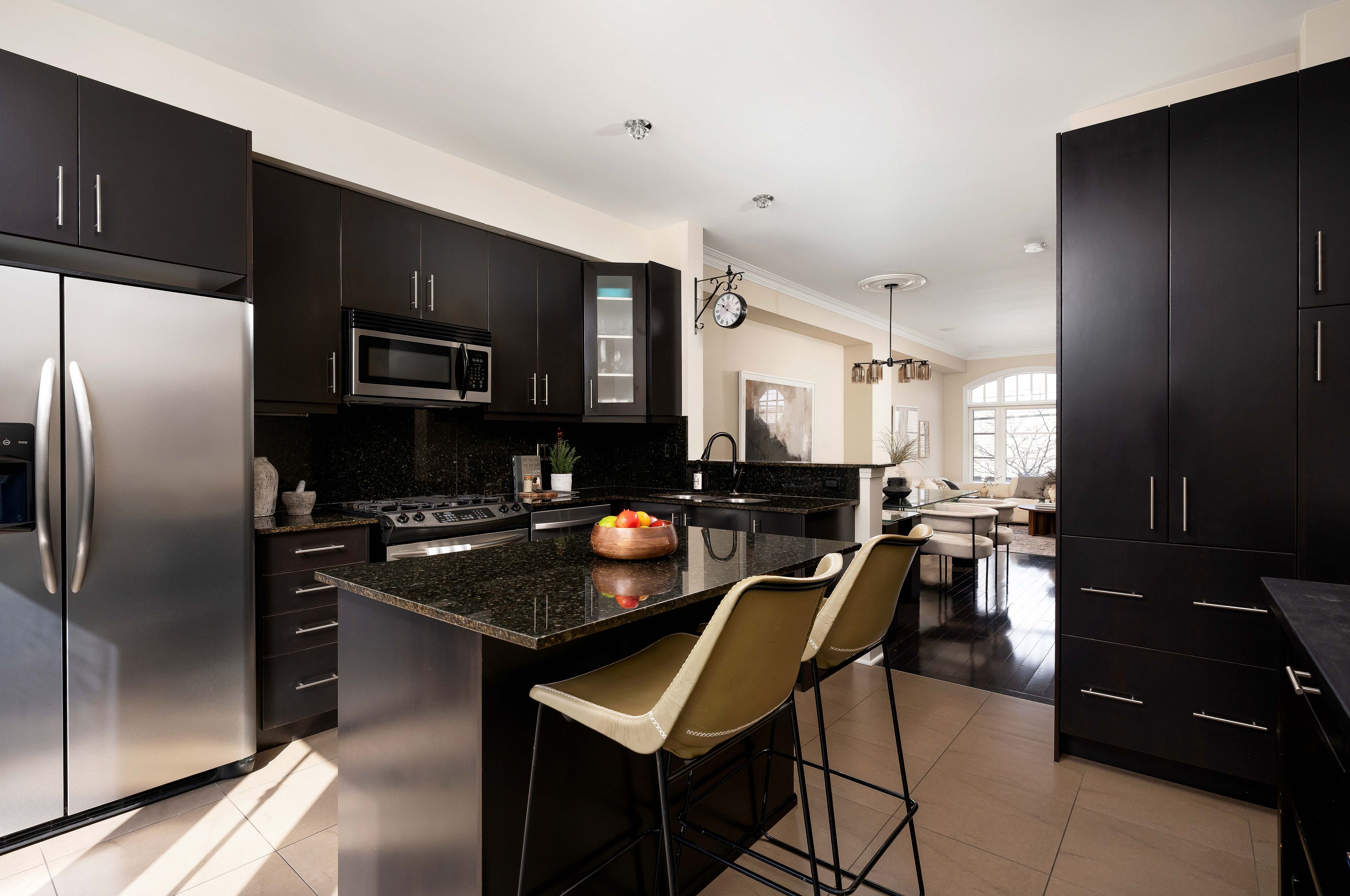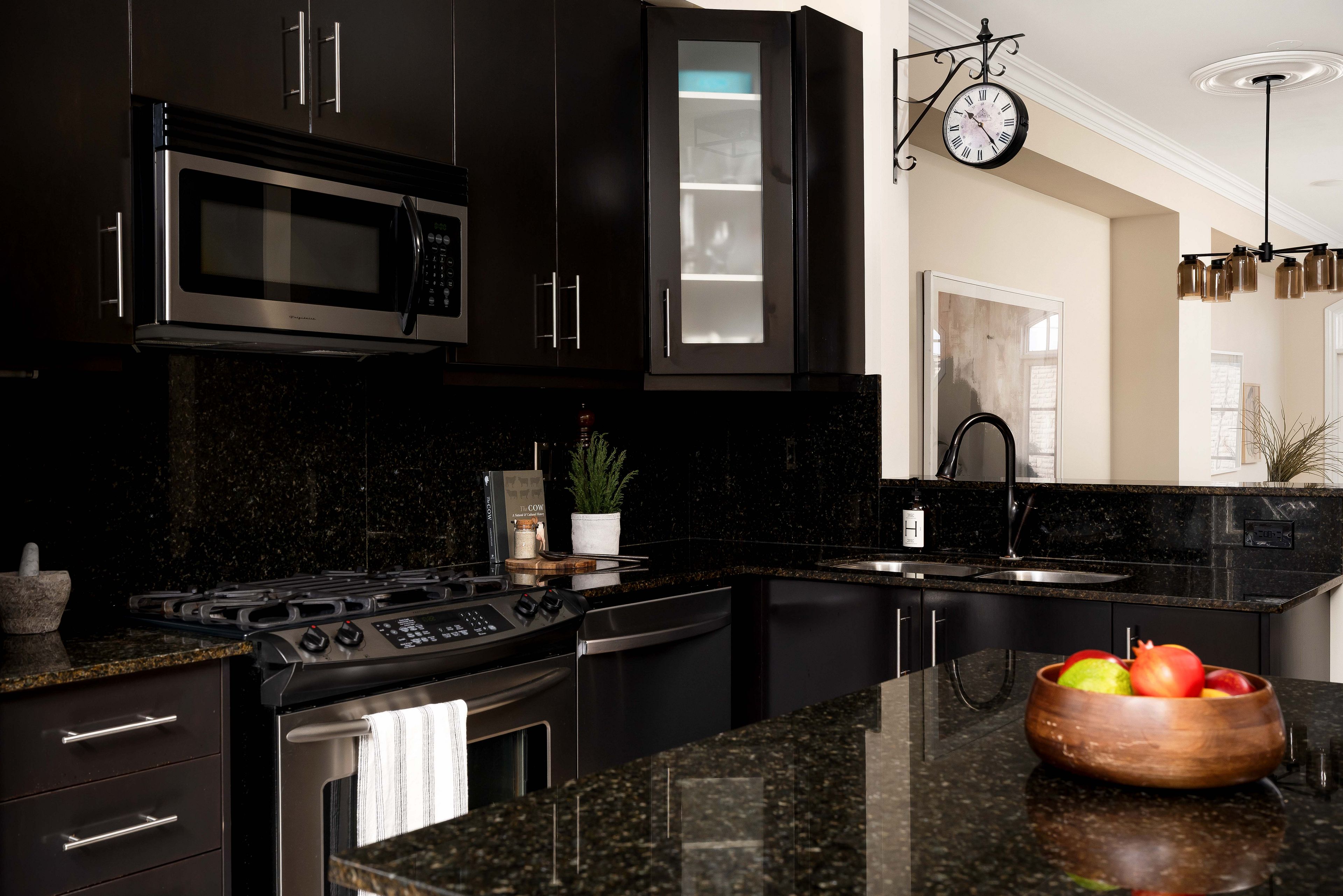• Well-designed kitchen with rich cabinetry and ample cooking space.