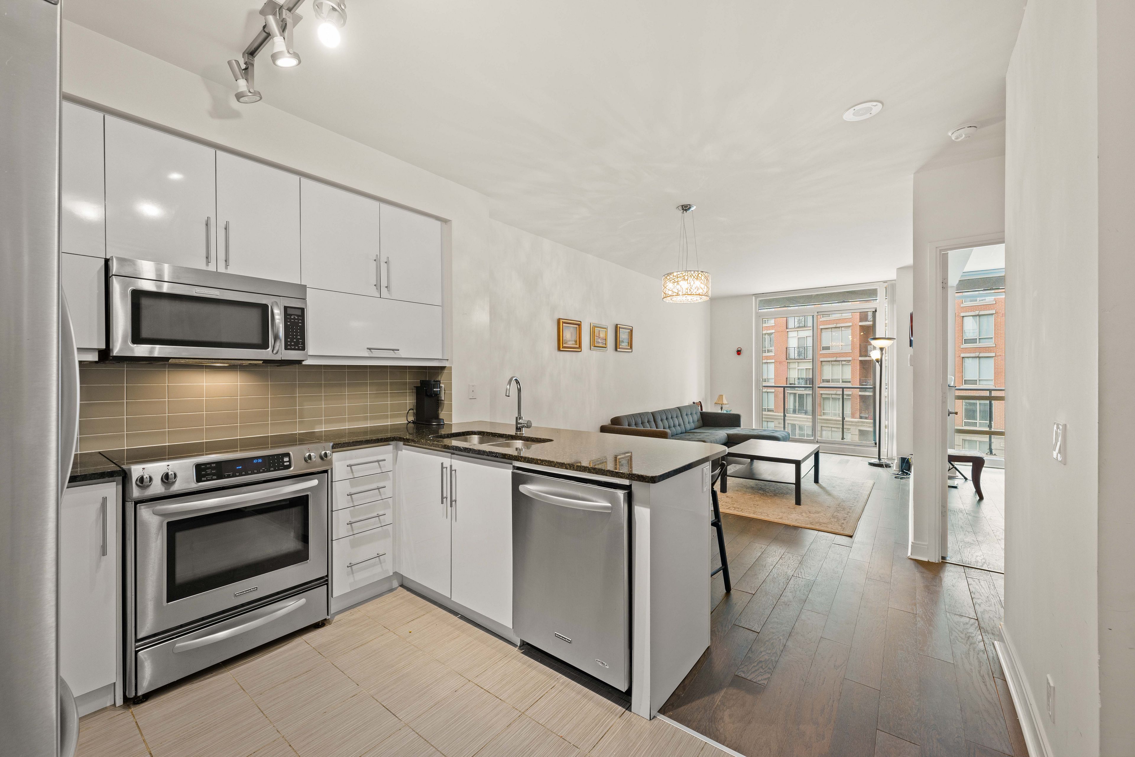 • Modern kitchen equipped with Kitchen Aid stainless steel appliances.