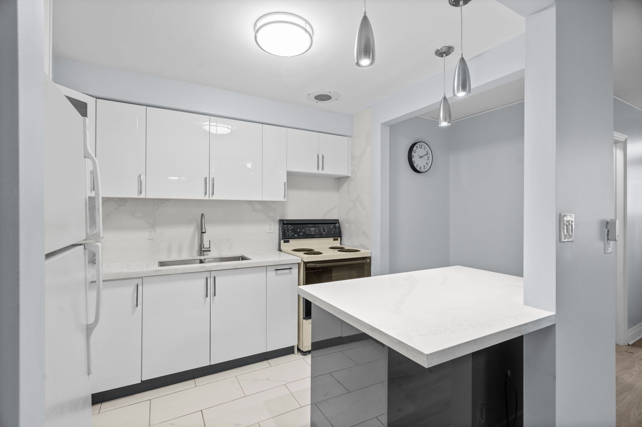 • Renovated kitchen with contemporary finishes flowing into the living area.