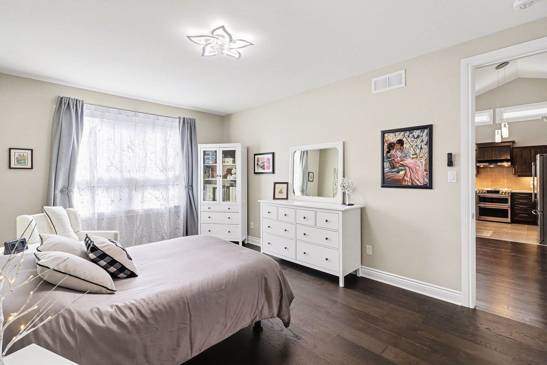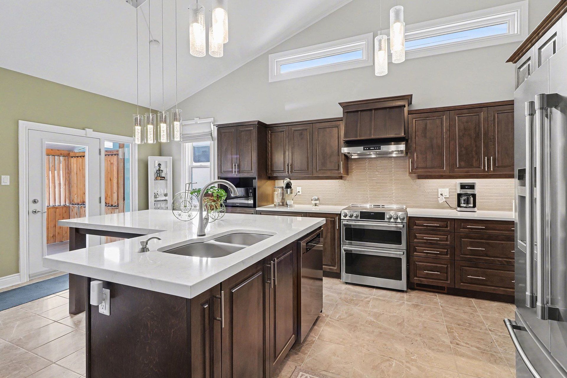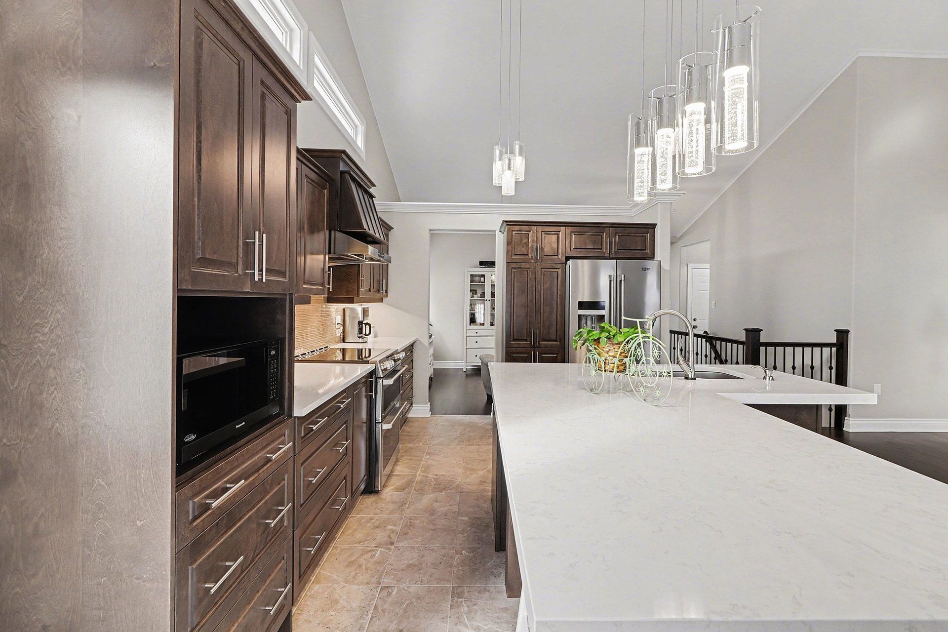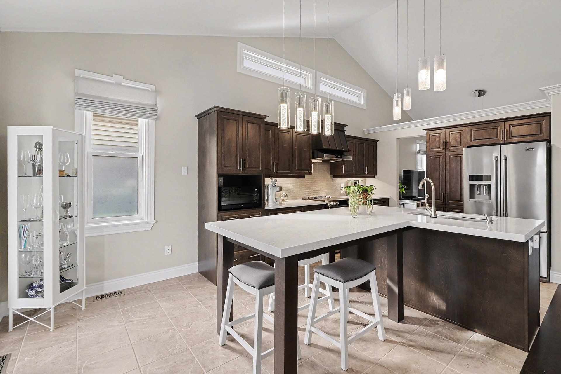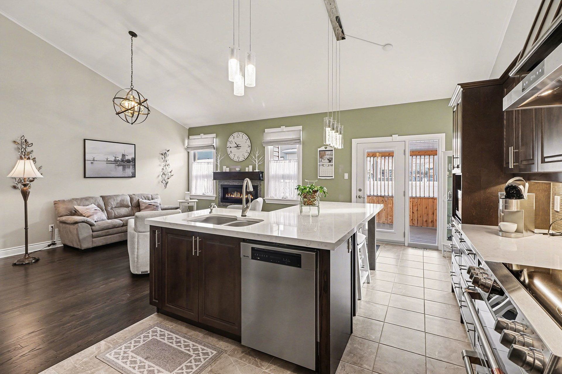 • Modern kitchen features quartz countertops and seamless flow to dining and living areas.